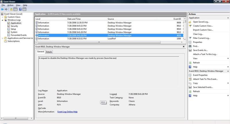 "A Request to Disable the Desktop Window Manager was made by process (launcher.exe)"