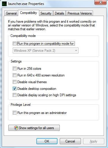 Vista's Aero directly writes to main graphics memory, bypassing the CPU. Older programs can disable the bottleneck Vista causes when it's directly accessing graphics memory to hand to its pretty Aero FX, but sometimes they get stopped by the OS, or crash right after managing it (which resets the Desktop Window Manager and you may never have seen it happen!). If you right-click the launcher.exe file from Windows Explorer and go to the Compatibility tab, you can tell launcher to work around (instead of killing) the DWM.