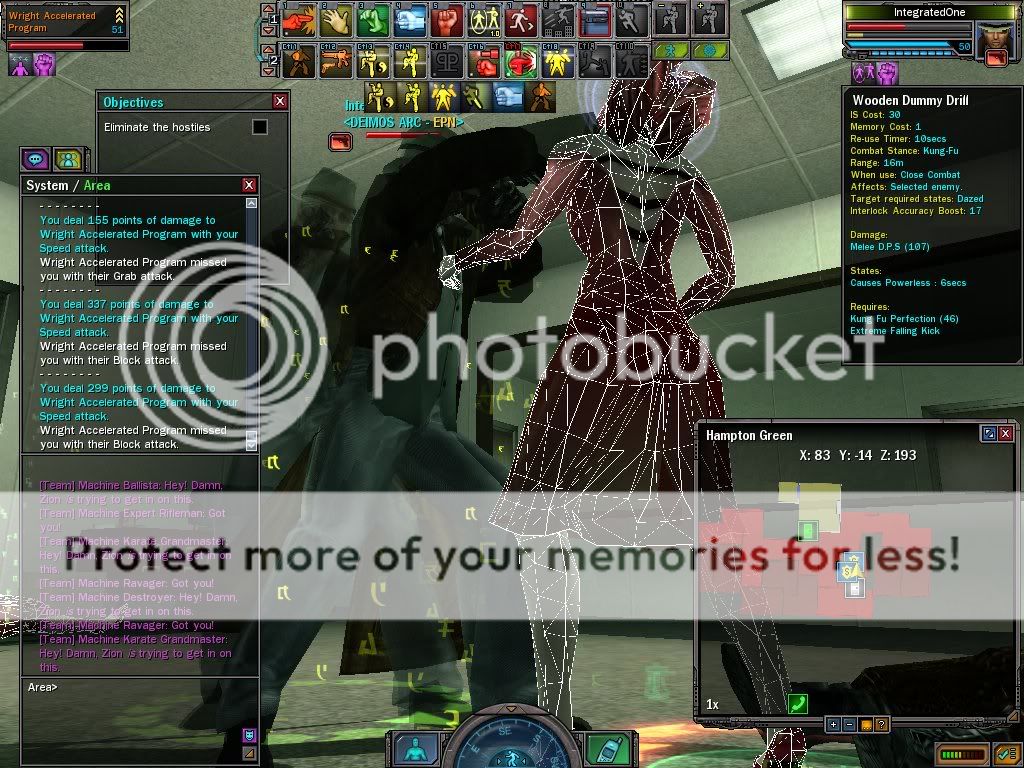 The 12.1.2 mission could be ran only in Dowtown. Zion mission 12.1.2: Angel Tyndall: IntegratedOne, we've received data we think may have been from the interface program -- from Trinity -- in Downtown. We know that the Machines and the reprsentatives of the Oligarchs -- who our sources within the Machines identify as two individuals, "Helian" and "Tesarova" -- have been working to locate her. We're going to have to move quickly if we want to stay ahead of them. Mission part 1: Search the area Operator: Got some electronics readings in there, but nothing fittinf the profile of a sentient program. Computer: >Yes._ [Trinity appears, with the following text in Details: "This "biological interface program," said to have been written by the Oracle, appears to some to be a manifestation of the woman once known as Zion's top hacker, who perished while transporting Neo to the Machine city."] Operator: It's... That's... her?