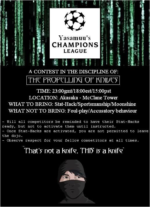Tonight, please make sure you're faction is represented at the Champions Leage finale in club messiah at the chelsea north central hardline. We will see the rewards handed over the the winners, and it will be well worth coming to watch the entertainment =) 11pm GMT/ 5pm EST Sangreal is dq'd from coming (sarcasim)
