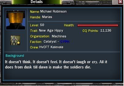 It's funny how people comlained how the Machines were the least represented faction on vector yet they have the most people on the cq list. It's true though. If you're the underdog, you're going to have more targets instead of being a Zionite and fighting your own team for a kill. More targets = more CQ.