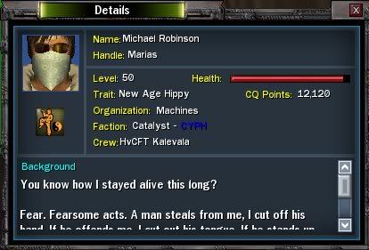 Though the nature and purpose of the Cypherites were revealed to the public as a "black ops" of the Machines, their purpose remains unchanged. Even with the war. This is how I've always viewed the Cypherite org although my character doesn't fall right into the typical Cypherite radical stereotype. To me, the Cypherites have always done what the Machines have really wanted to do, but couldn't because of the appearance that they have to maintain. We cancel out EPN's overzealous efforts by adhearing to the same lack of boundaries displayed by that organization. CTU if you will. We terrorize the terrorists.
