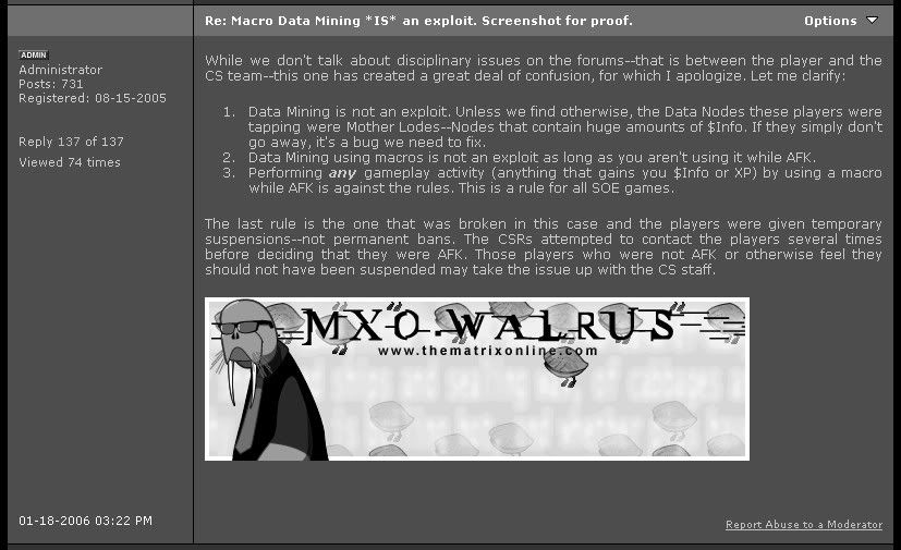 Well let me say I hate CR I dont like how the stats, buffs, attributes have changed. This was my first MMO I looked forward of playing it everyday. Now I dont, SOE has slowy ruined The matrix online, Events would make this game way more interesting, I mean come on for the 50's at least. The 50's in the MXO Have nothing to do but PVP, farm,or help with faction. Is that all we have to look forward too. I know, I looked forward to the events but now nothing, What if we dont like it CR ? Will you roll back like you promised SWG players? Well all I have to say is that when CR comes through the door I will be exiting the door FOREVER!