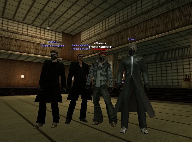 When: February 10th Where: Sai Kung C dojo Time: 4pm Megacity time Style: MA and Gunman only Entry fee: $1 mill per person For the third week in a row we bring you another "King of the Hill" tourny. With each passing tourny we make changes to make these more fun and eventful. With the amount of participants that we have been getting we have encountered the problem of time. It is taking too long for a person to actually fight again if they lose. The incentive is to win so that you never have to leave the mat, however it is not fun if you lose and it takes another hour before you can fight again. So this week will be something different. This will be solo this time and not team. This will be MA only and Gunman only. Yes we will have two fights going on at the same time. You will be able to chose if you want to fight the MA champion or the gunman champion. This will be signup so you must let me know if you want to fight so I can put you in the rotation. This should definitely help things go by faster. If you are in the gunman bracket and lost you are free to run to the hardline and change your load out and enter the MA side and vice versa. However there is one twist. Because of all you cheating, sploiting bastards out there with that stupid clothing stack the only clothing allowed are pants. That's right no shirts, no gloves, no glasses, no hats, no coats, and no shoes. You will also be asked to be killed before the duel because some of you like to go outside get buffed up or pop a TB and then come back inside. Also no TBs, Health pills, or anti's are allowed. Mobius code is fine to use as well as Prison Mastery Device and that other fly thing. This has never been done before so we will see how it goes and make adjustments where necessary. Doomninja and Rstnpce have the most victories so far so I will allow them to be the first participants. Either one or the other can start off as MA or Gunman, or they can choose to face each other if they choose the same tree.