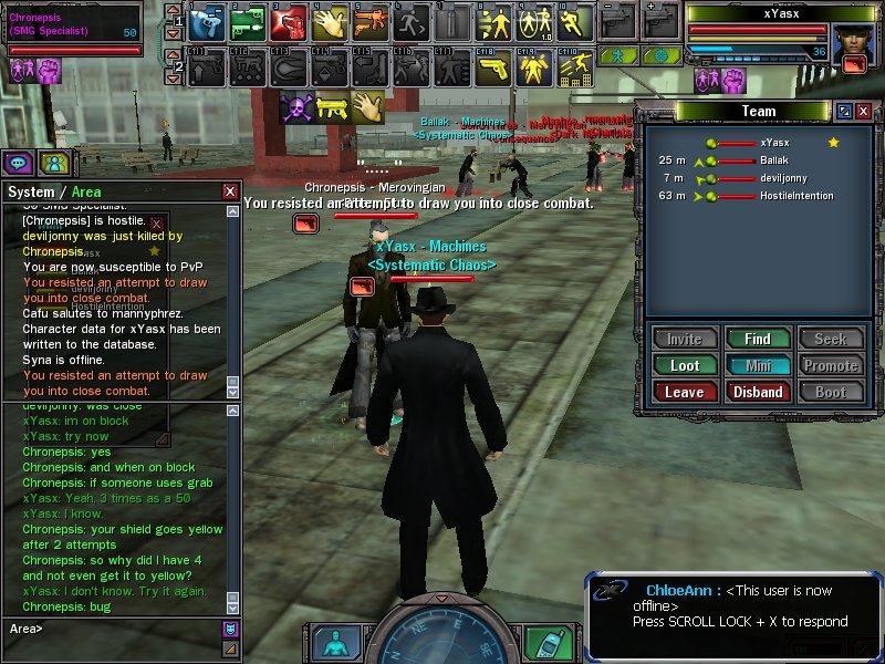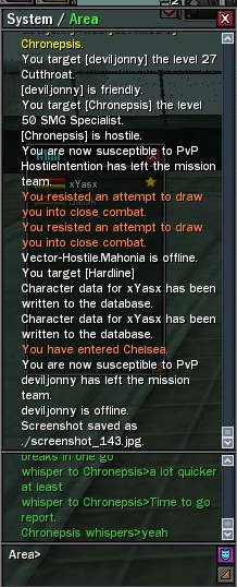 Using either /tell or /t will result in a message being sent to the player, for the purpose of simplicity though, we'll just continue with /tell in the rest of this guide. So, what should appear on your screen is this: "Whisper to Yasamuu>Hello". If you are on say Syntax and you wanted to contact me on Vector, then the code you need to type in the chat box is : /tell vector-hostile.((Their name)) EG: /tell vector-hostile.Yasamuu Hello . Again this is what the end result should be: "whisper to Vector-hostile.Yasamuu>Hello" Heres a list of the codes needed to contact anyone: /tell name ((For contacting someone on thesame server as you)) /tell syntax.name (( To contact someone on syntax if you're on another server)) /tell recursion.name (( To Contact someone on Recursion if you're on another server)) /tell vector-hostile.name (( To contact someone on Vector-Hostile if you're on another server)) So here it is: Syntax Gitano - Zion Havocide - EPN Zimmermann TheThirdMan Tiango - Machine - The Glitch Society Tenshi916 - Machine - Sentience Amador5069 CloudWolf - Zion - Omega Syndicate Shinryu - Machine - The Watchmen BioodWork - Machine - The Tetragrammaton Eleutherophobia - Machine TPaine Dragonram - Merovingian phiOZ Hexplode Lbomb XXT - Zion Rosti HostileIntention - Machine - Sentience Reeverb - CYPH - INGSOC DarkAngelus2 Darkangeius Shayel - Machine - The Tetragrammaton - Speaks Italian, Spanish, English Michael1 SolidRevolver - Zion - Section 9 Oriyx MysticTravi - Machine - SOCA - Speaks English and German Drgero - Spaniah and English Siephos - English and Danish Kellner - CYPH - English, German, little bit of Dutch lHydrazine - EPN - E Pluribus Neo Sputnik4 - EPN - E Pluribus Neo Proximisio - Machine MindsweepX - Zion - The Black Code RejectKnowledge Marias - CYPH - Catalyst Bittype Recursion Roukan - Machine R0ukan - Merovingian Mobu - Cypherite Dragonrom phiAU Wadjet LoBit RedBindi - Zion - The Trust Tinwoman HostileIntenti0n - CYPH - The Authority TekMon - Speaks English and Spanish imaximus - Machine - The Collective Foxxdie - EPN Emeraldgoblin - Machine - The Collective - Speaks Spanish and English Lehrer - Speaks English and German IHydrazine - EPN Mobyias VoLtio - Zion - Furious Angels 0221kintupS - EPN - Insurgence BedouinAscent Reeverble Delicho - CYPH - La Sombra Placido - Merovingian - Balance PS10N - Zion - The Brethern - Speaks English, Dutch, French, German, Italian, Portuguese and Spanish CyanX - Speaks English, French, Spanish, Arabic, and Russian fluently. EnterTheFenix - Speaks English, French, Spanish, Arabic, and Russian fluently. LucifersChosen GypsyJuggler - Zion Havocidee - EPN Cervacius - Zion Aquatium - Zion - Fallen Horizon Mandy5069 neophite BloodWork - Machine - The Megacity department of Energy Arbuckle GamePlaya3159 Alphaea - Zion - The Trust Nicks - Merovingian - Examplar Triune Vector-Hostile PBlade - Zion - The Children of New Zion Bl00dWork - Machine AquatiumV - Zion - Fallen Horizon Mortecide Denary - Merovingian zencao - Zion - The Children of New Zion zeroone5069 Dragonnram L4Z4RUS - EPN Anonima CptnCrunch Gingerhead TheHostileIntention - Machine Yasamuu - Machine Apost1e - CYPH - Reviled Restoration Evasidos - CYPH - Reviled Restoration FeIicite - CYPH - Reviled Restoration Fondo - Zion - Speaks English and German Obligoblin - Zion - The Children of New Zion - Speaks Spanish and English Siepher - Zion - Network Imperium - Speaks English and Danish Hydrazine - EPN - Insurgence Voitio - EPN - Insurgence BeBeH - Merovingian - Dark Mavericks Sputnik1220 - EPN - Insurgence KevinXSer - EPN - Insurgence - Speaks Portuguese and English Majinn - Machine - Project Mayhem Gretyl - Merovingian - Les Enfants Terribles Reeverbs Machete - Zion - Speaks Spanish and English JetBIack - Zion - Network Imperium Ra2za - Zion - Twisted Titans azarazamataz - Zion - Libertas Preliators - Speaks English and a little German