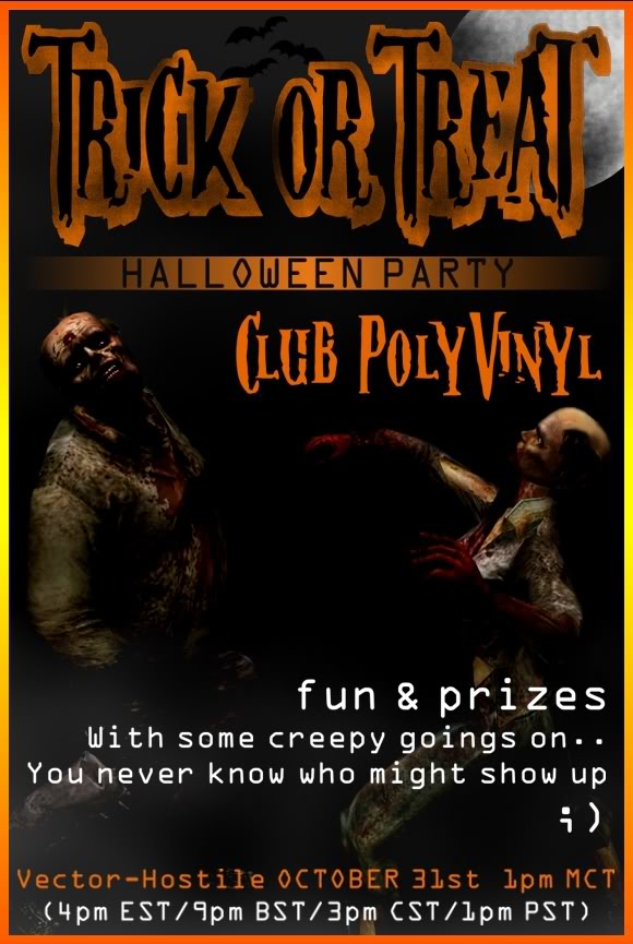 Everyone, except deviljenny, is invited to party at Club Polyvinyl in Mara C on Halloween at the above times! We have plenty of fun and games planned, despite all the creepy goings on, so bring your goody bags...and don't forget your clamors  Hope you can join us! (Please note, In Europe our clocks went back, so for anyone outside of Europe the times will be moved forward by one hour. IE: 5pm EST, 4pm CST and 2pm PST)
