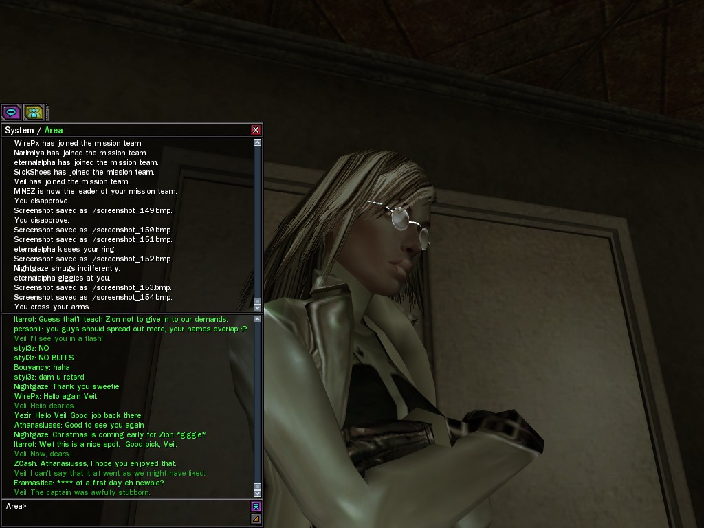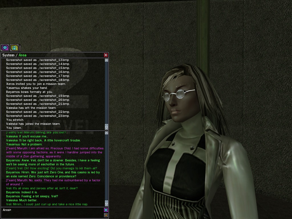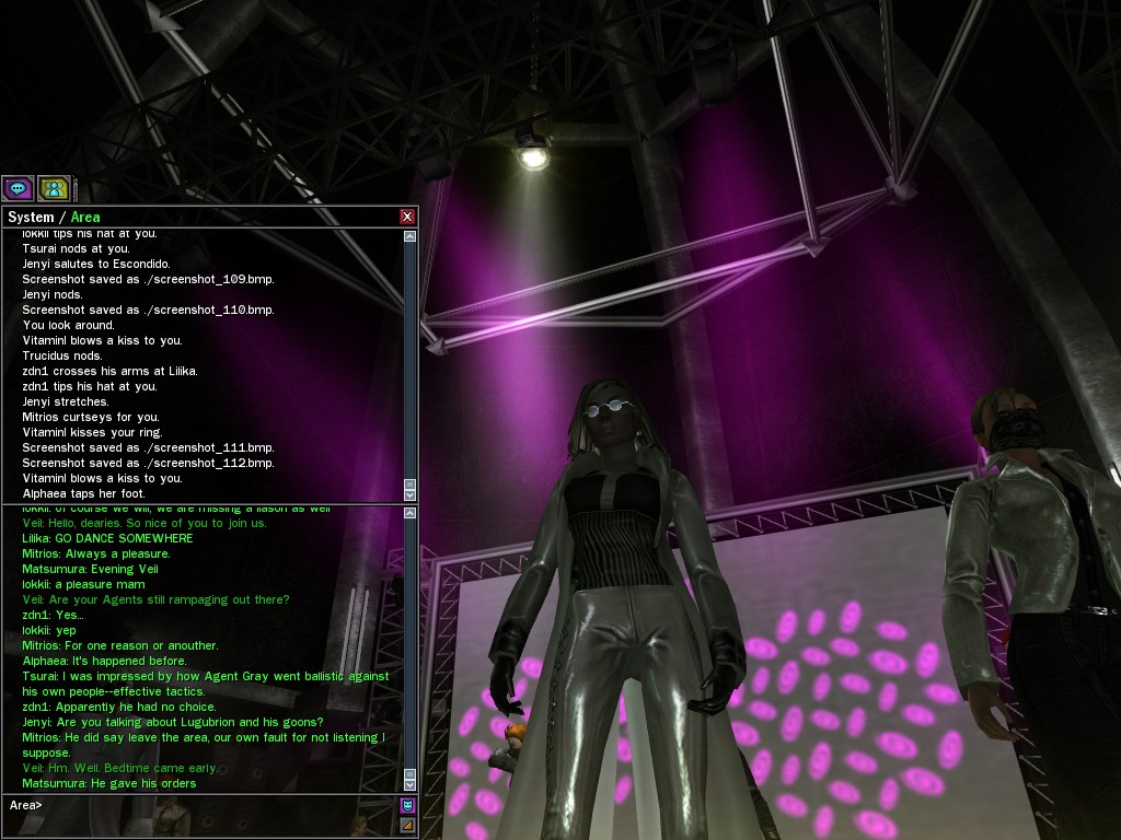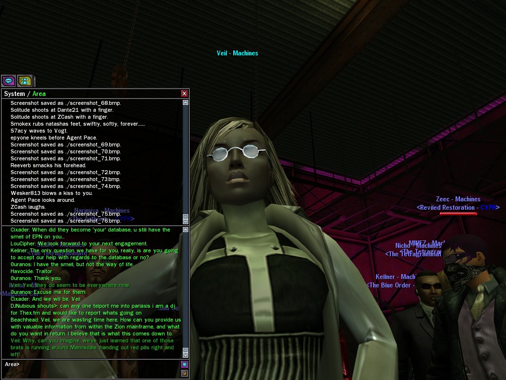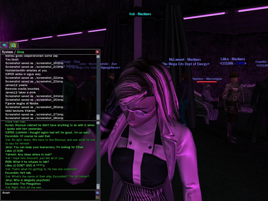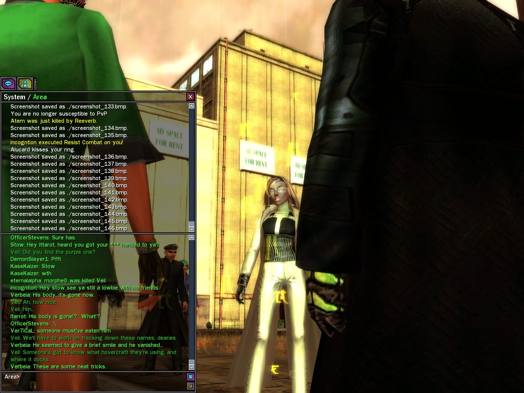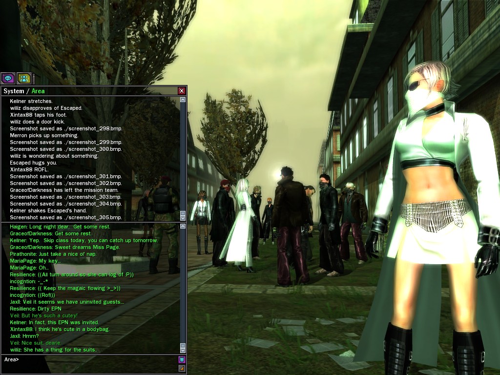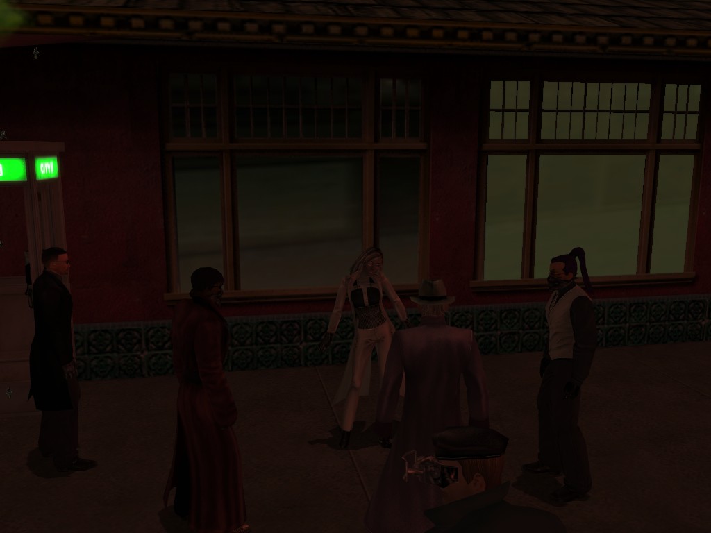 Well, dearies! A few of us were lucky enough to have a night out on the town with our new liaison officer, Maruth! And what a time we had, clearing those pesky EPNs off the public telephones! We just won't stand for this kind of disturbing the peace in our town, no sir! Some dull Zionites showed up, but we played a little joke on them to give them the slip. It was a close call, though--they almost bored us to death! Have fun with Maruth, sweeties! 'Til next time, xoxox Veil