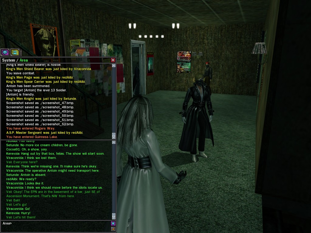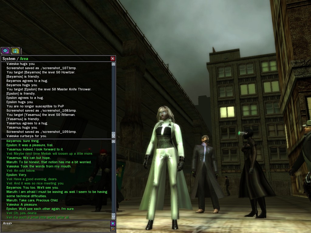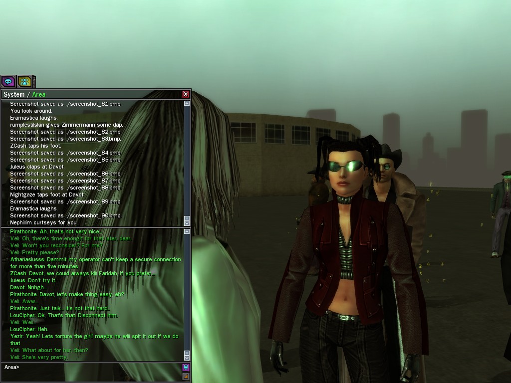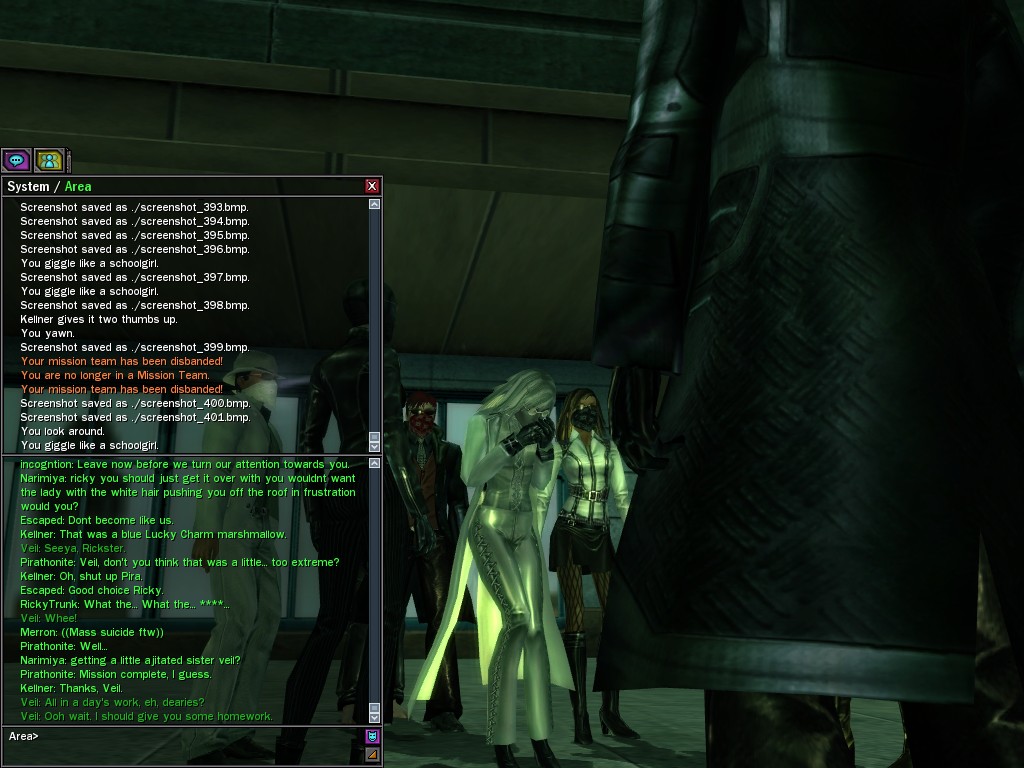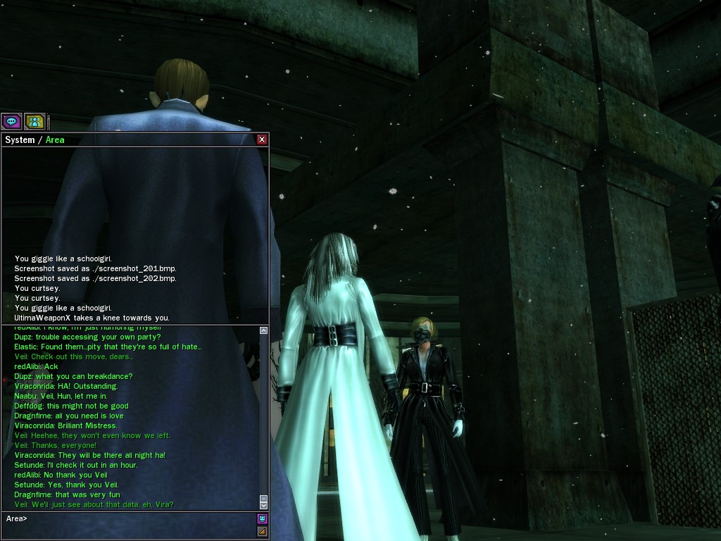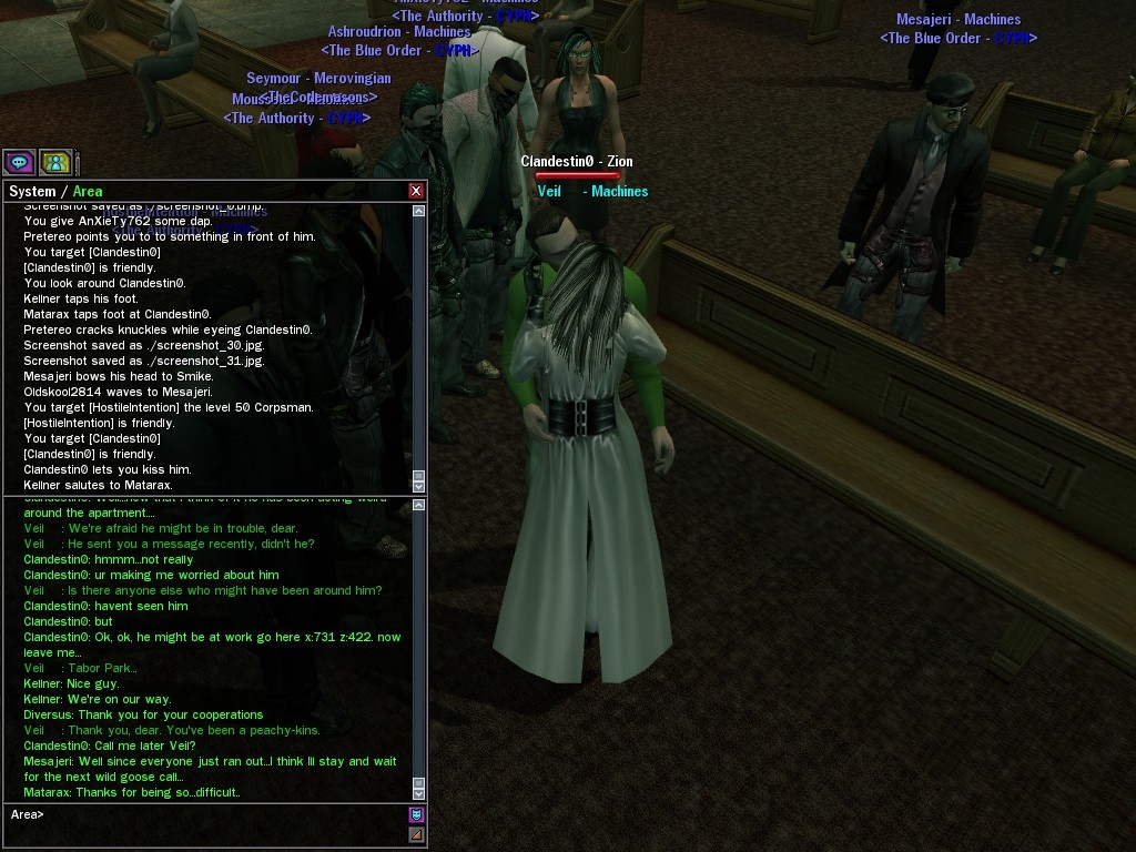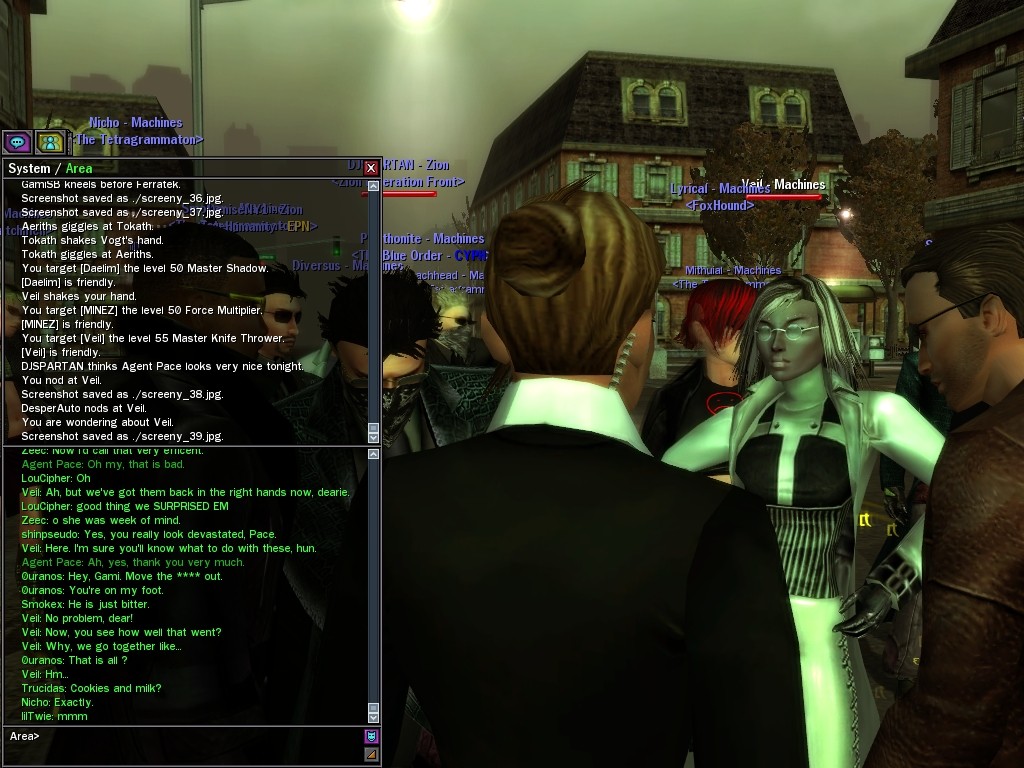 Well, dearies! A few of us were lucky enough to have a night out on the town with our new liaison officer, Maruth! And what a time we had, clearing those pesky EPNs off the public telephones! We just won't stand for this kind of disturbing the peace in our town, no sir! Some dull Zionites showed up, but we played a little joke on them to give them the slip. It was a close call, though--they almost bored us to death! Have fun with Maruth, sweeties! 'Til next time, xoxox Veil