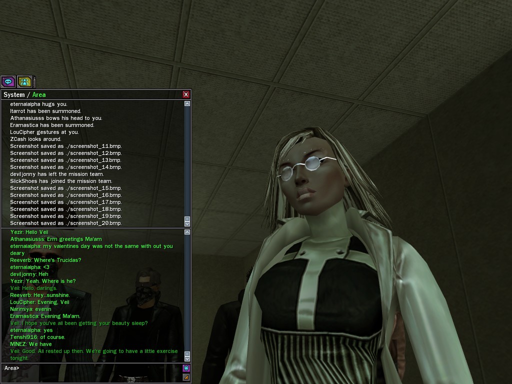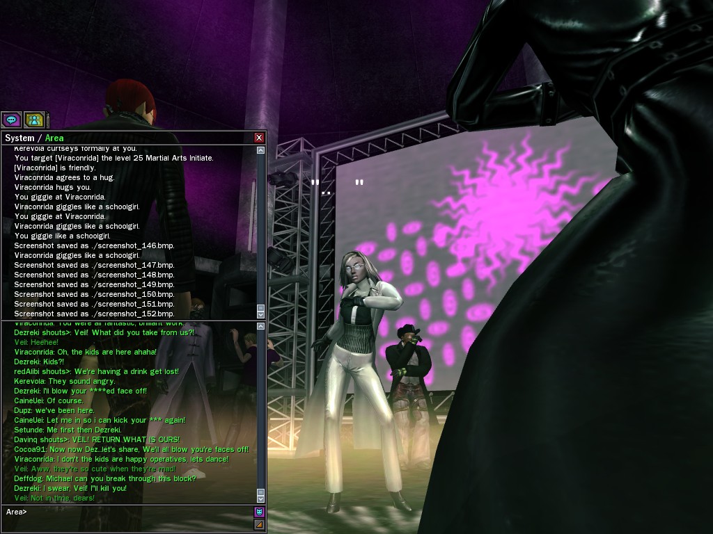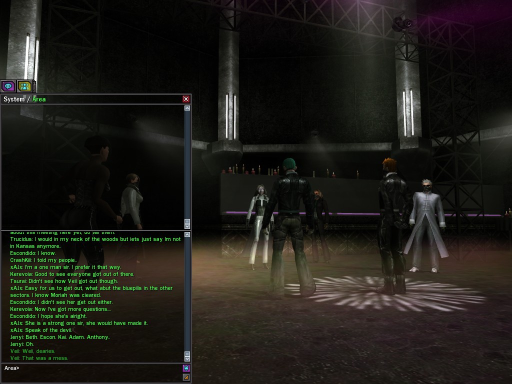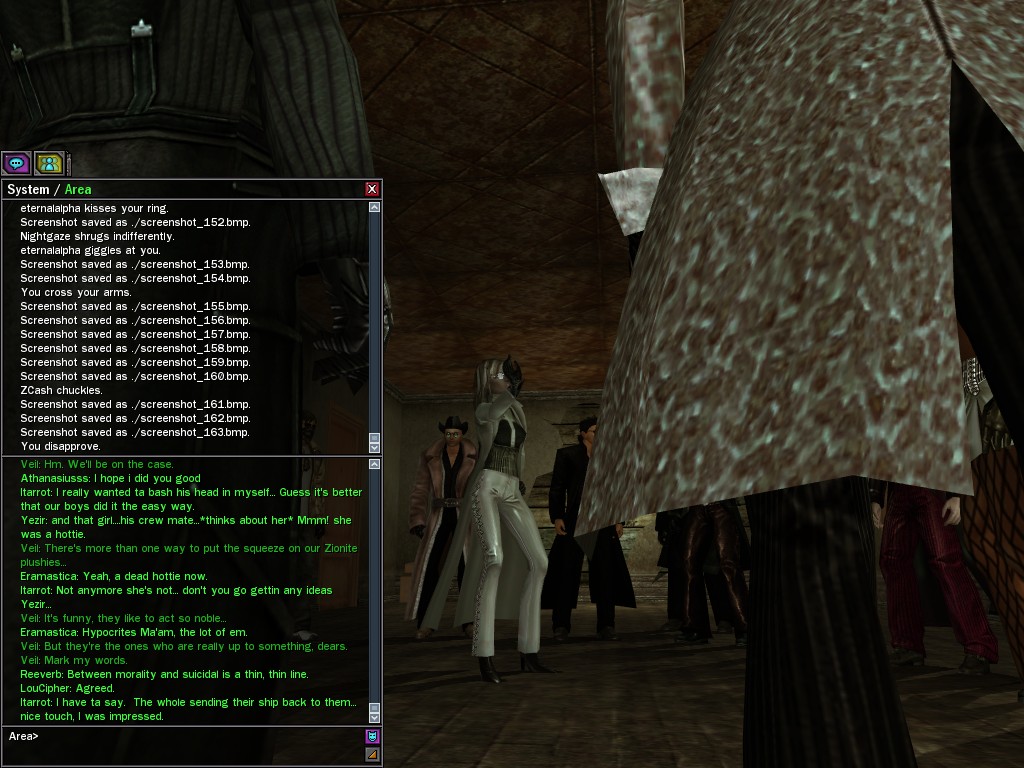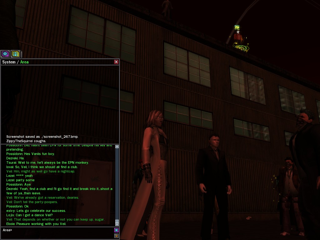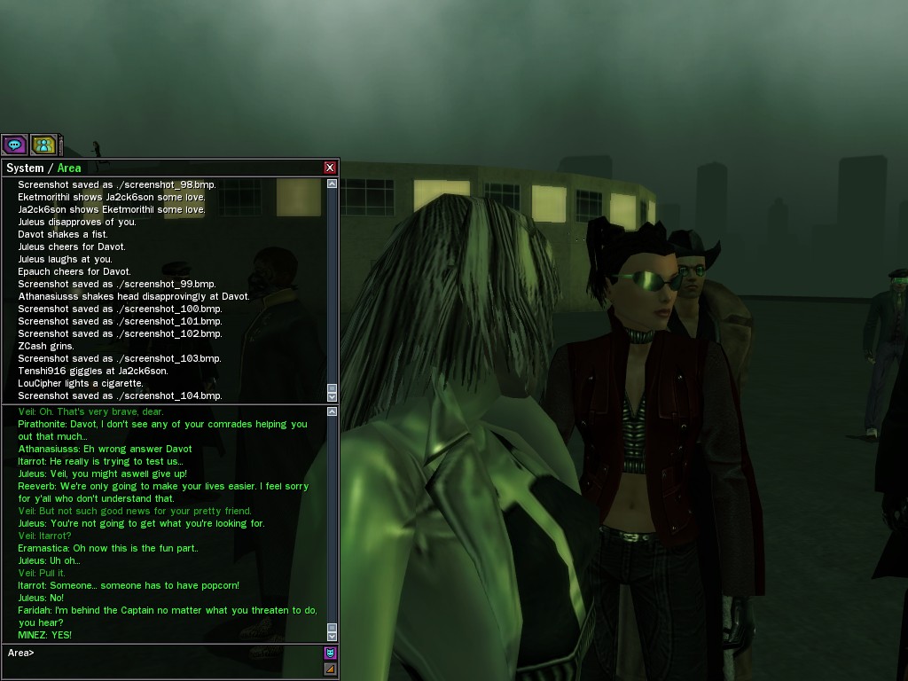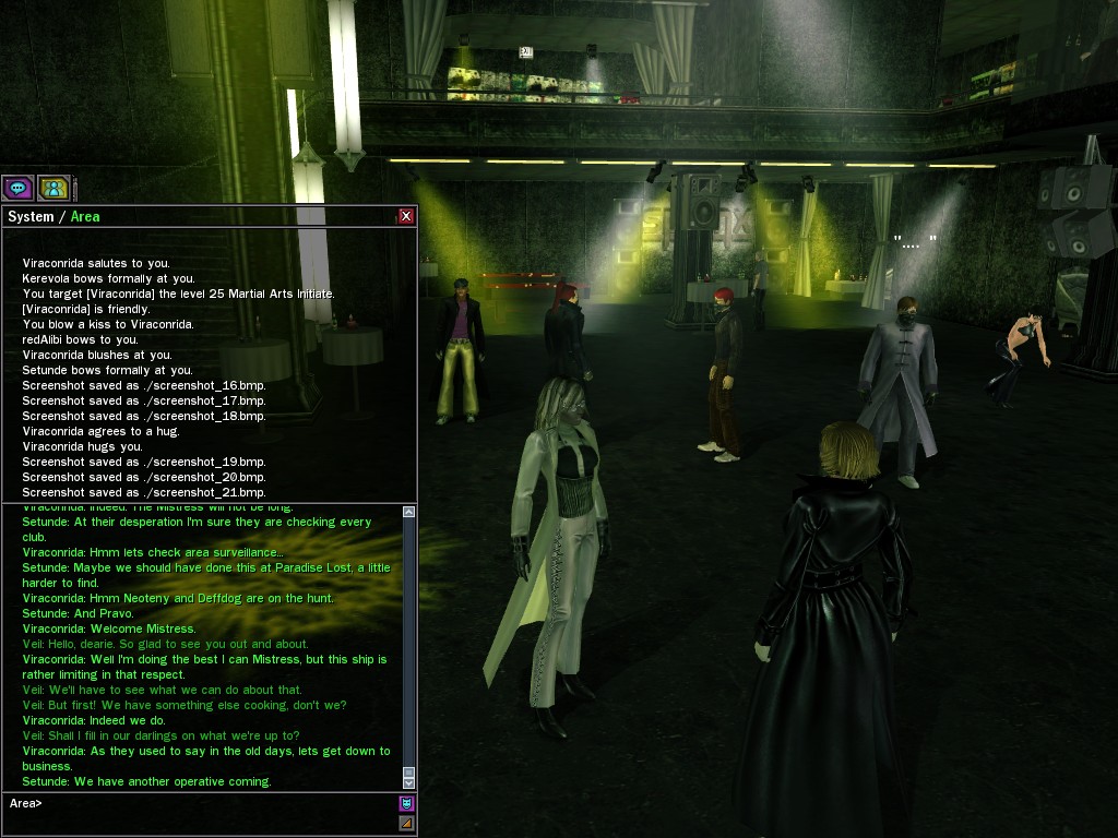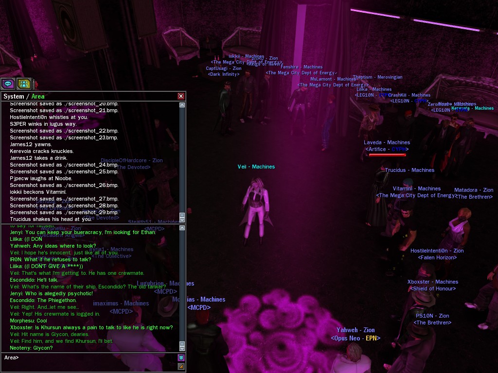 Well, dearies! A few of us were lucky enough to have a night out on the town with our new liaison officer, Maruth! And what a time we had, clearing those pesky EPNs off the public telephones! We just won't stand for this kind of disturbing the peace in our town, no sir! Some dull Zionites showed up, but we played a little joke on them to give them the slip. It was a close call, though--they almost bored us to death! Have fun with Maruth, sweeties! 'Til next time, xoxox Veil