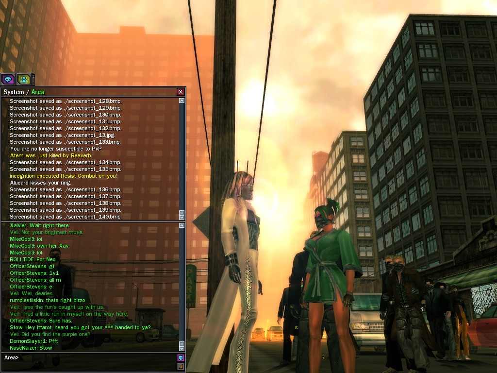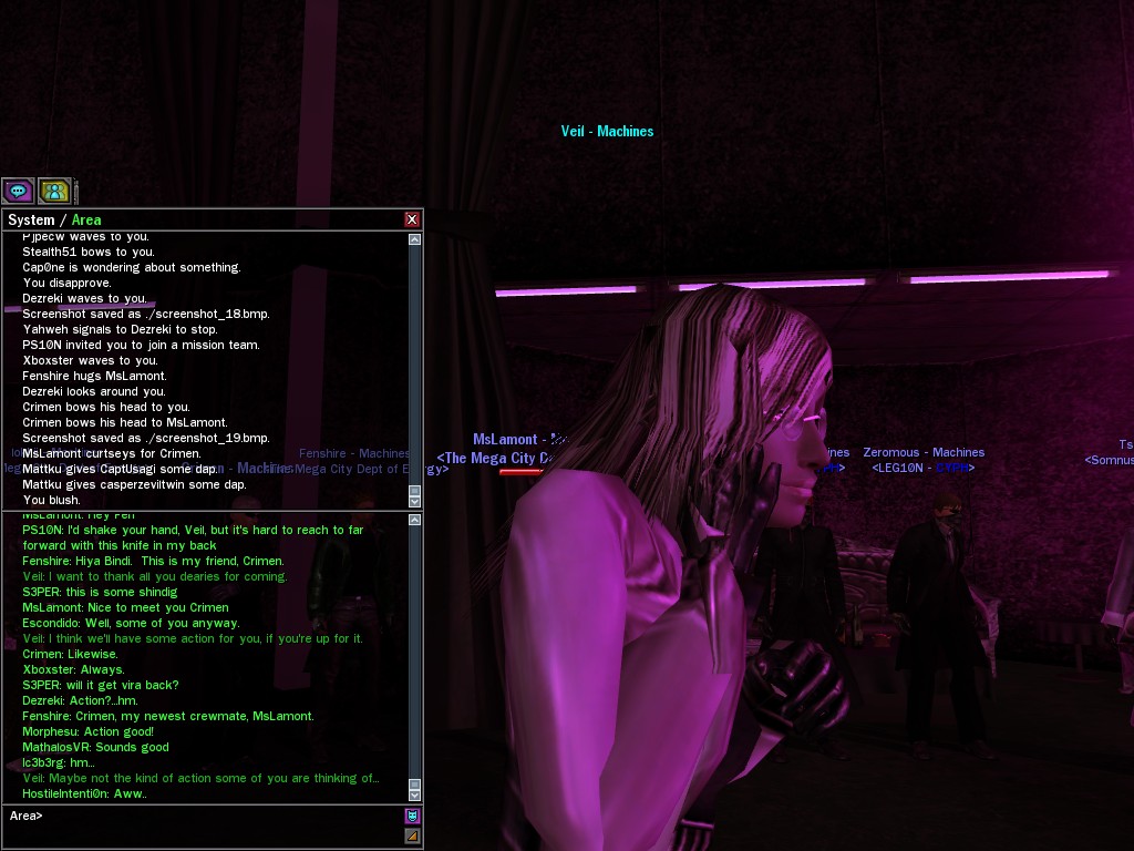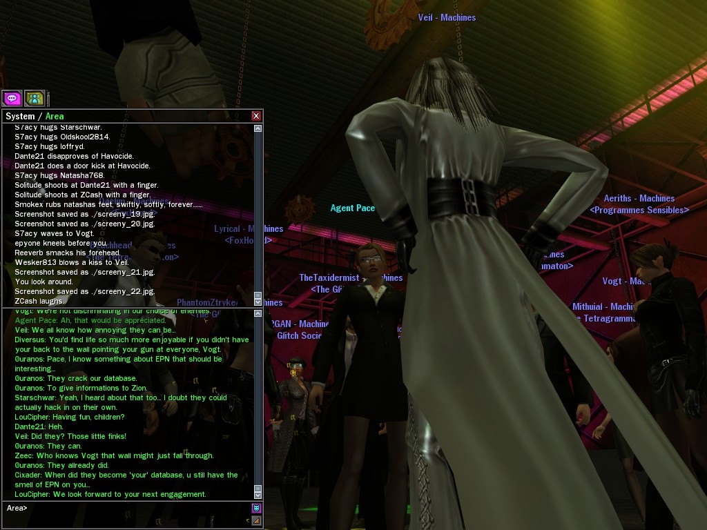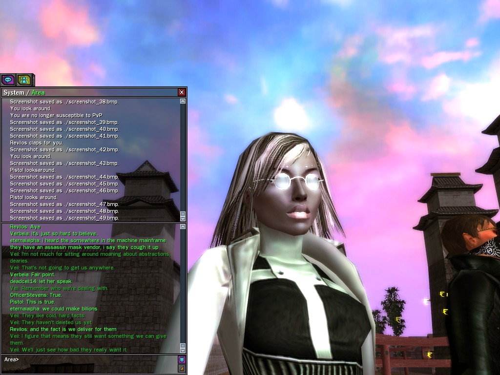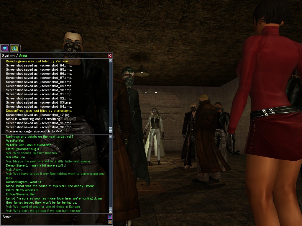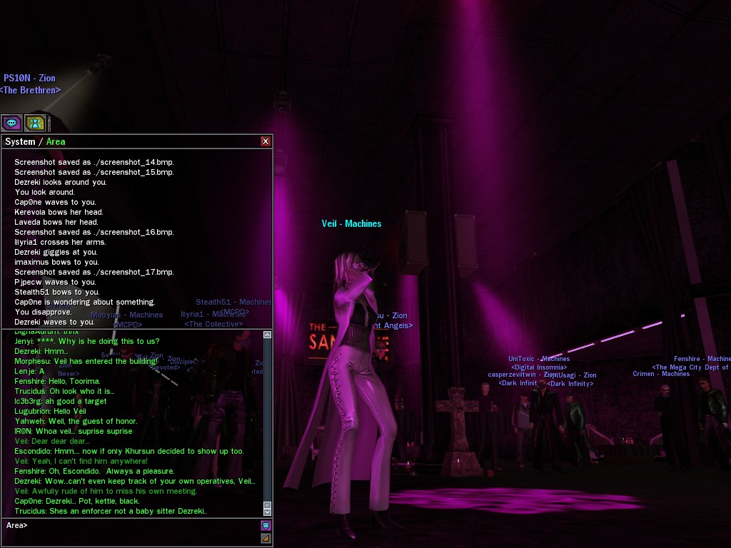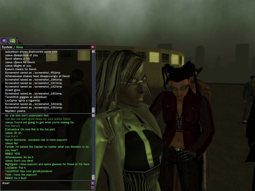 Well, dearies! A few of us were lucky enough to have a night out on the town with our new liaison officer, Maruth! And what a time we had, clearing those pesky EPNs off the public telephones! We just won't stand for this kind of disturbing the peace in our town, no sir! Some dull Zionites showed up, but we played a little joke on them to give them the slip. It was a close call, though--they almost bored us to death! Have fun with Maruth, sweeties! 'Til next time, xoxox Veil