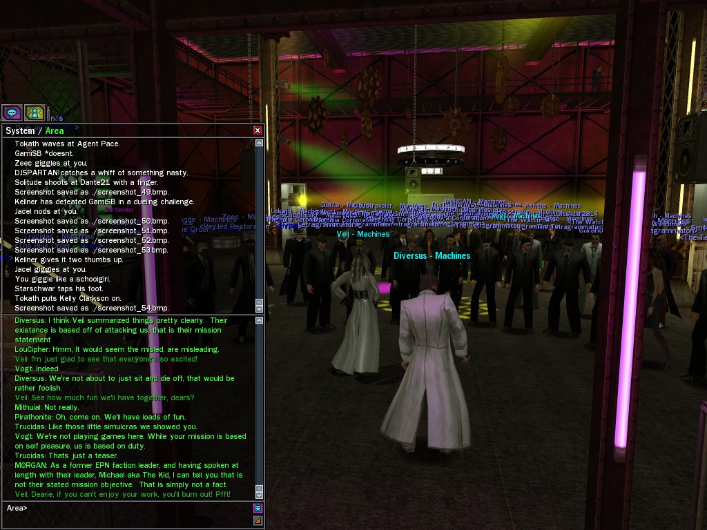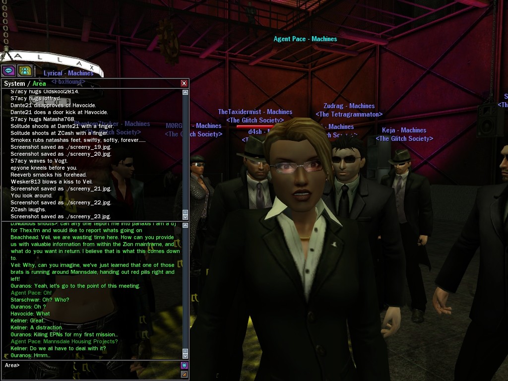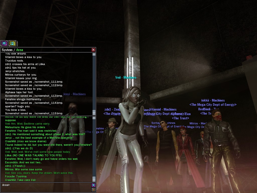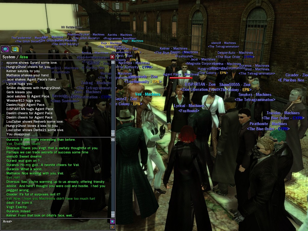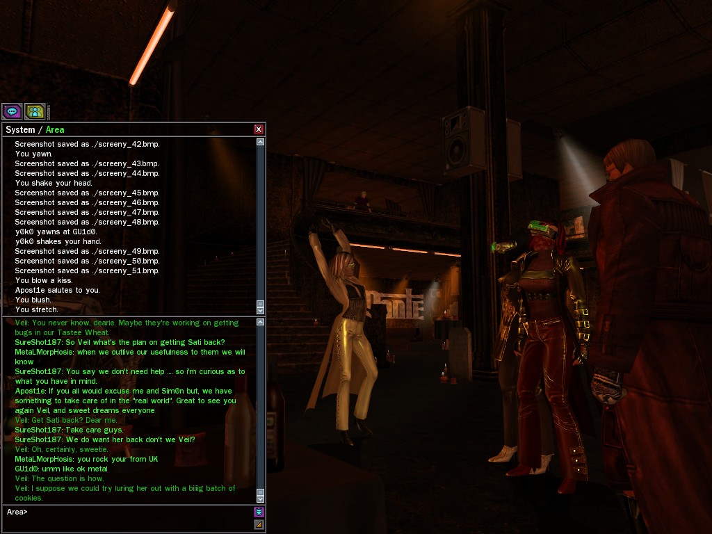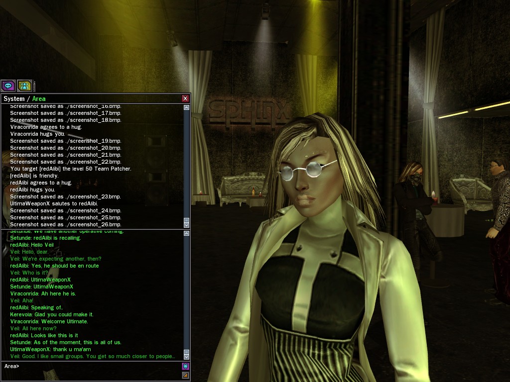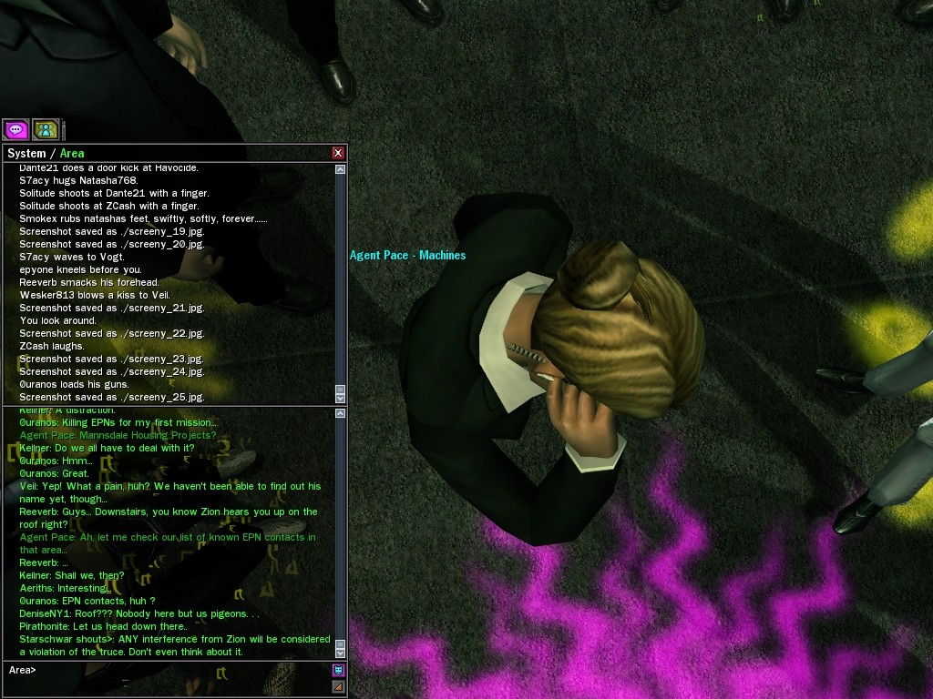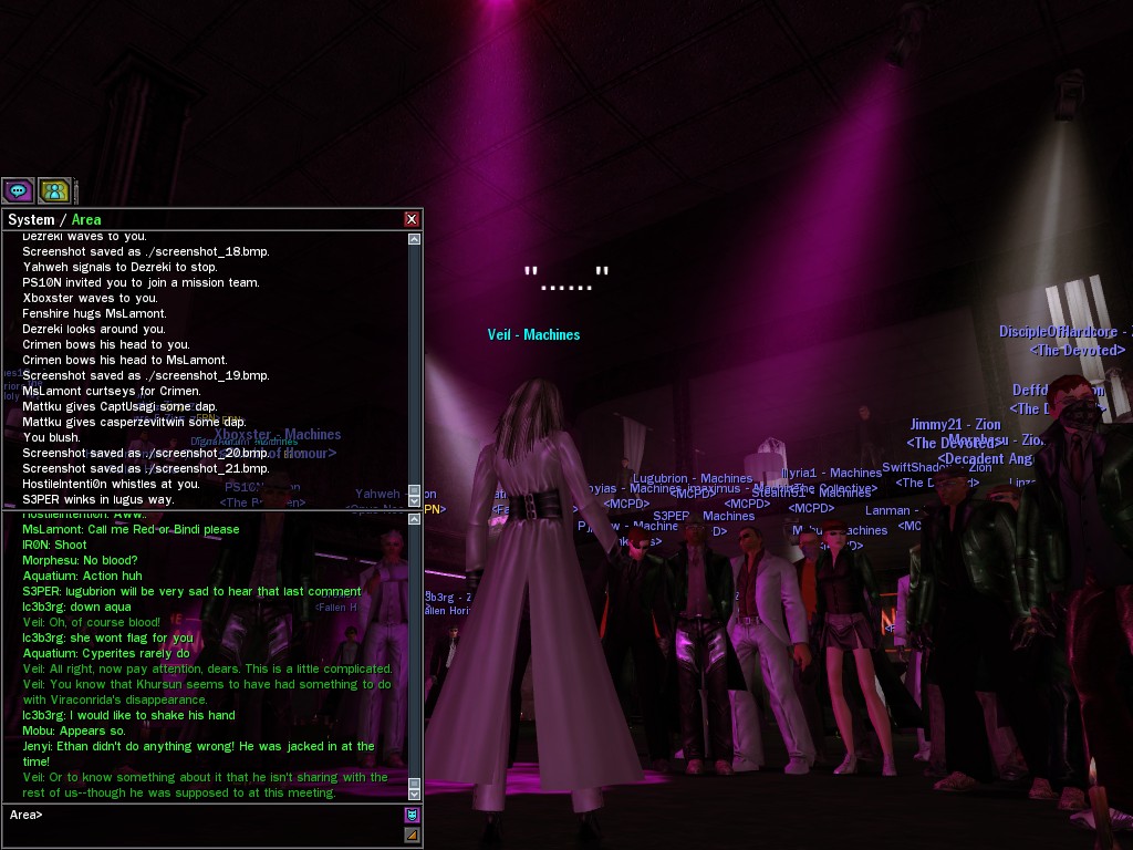 Well, dearies! A few of us were lucky enough to have a night out on the town with our new liaison officer, Maruth! And what a time we had, clearing those pesky EPNs off the public telephones! We just won't stand for this kind of disturbing the peace in our town, no sir! Some dull Zionites showed up, but we played a little joke on them to give them the slip. It was a close call, though--they almost bored us to death! Have fun with Maruth, sweeties! 'Til next time, xoxox Veil