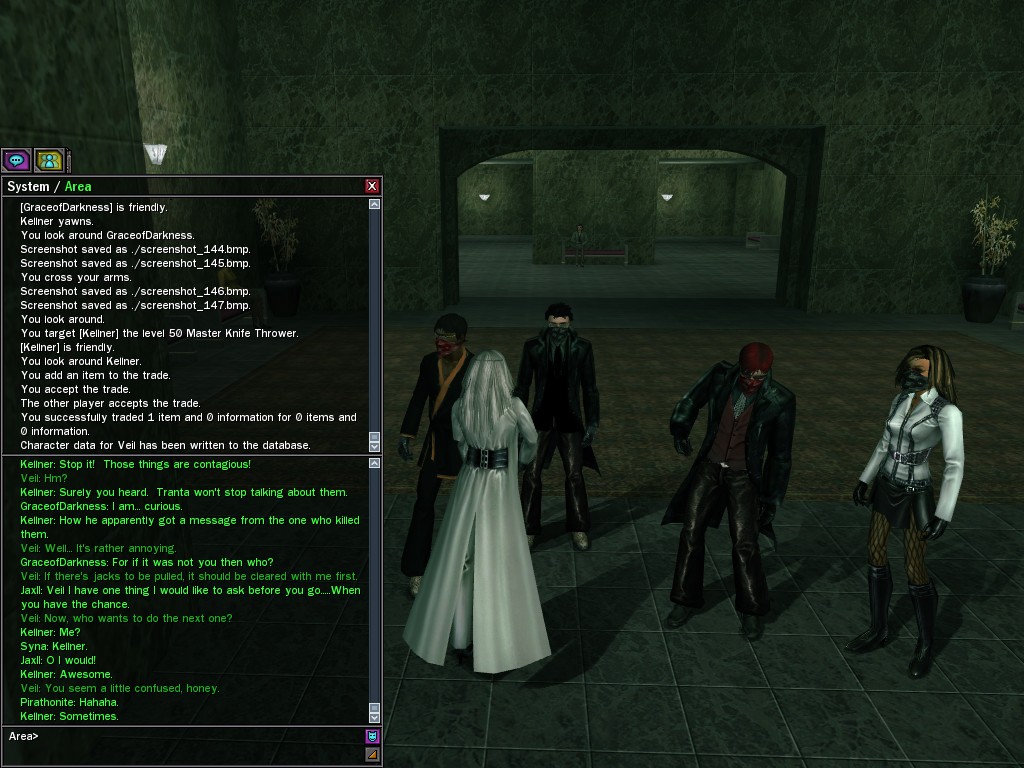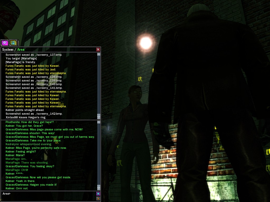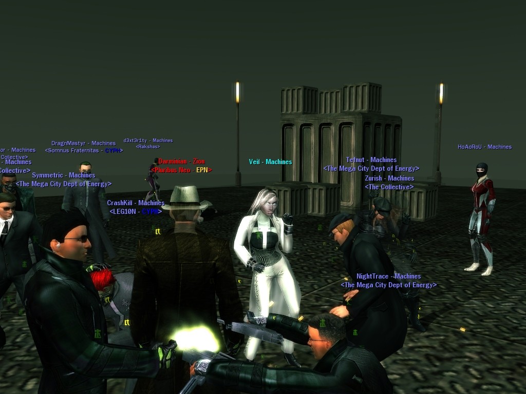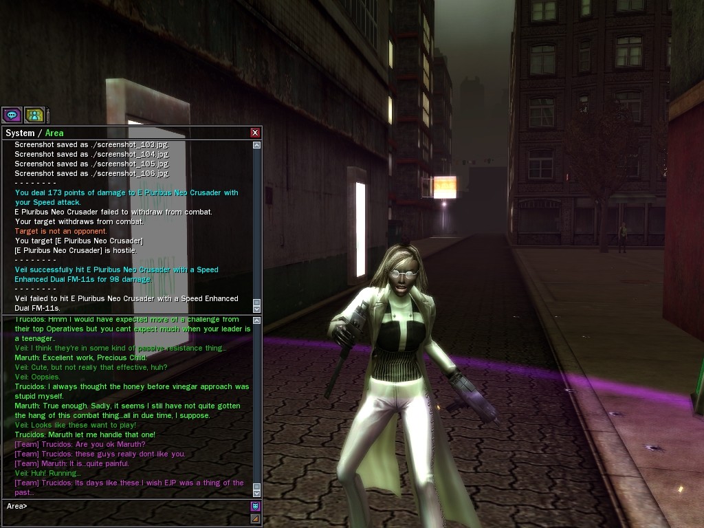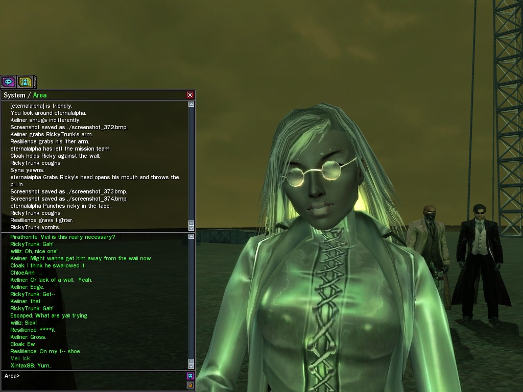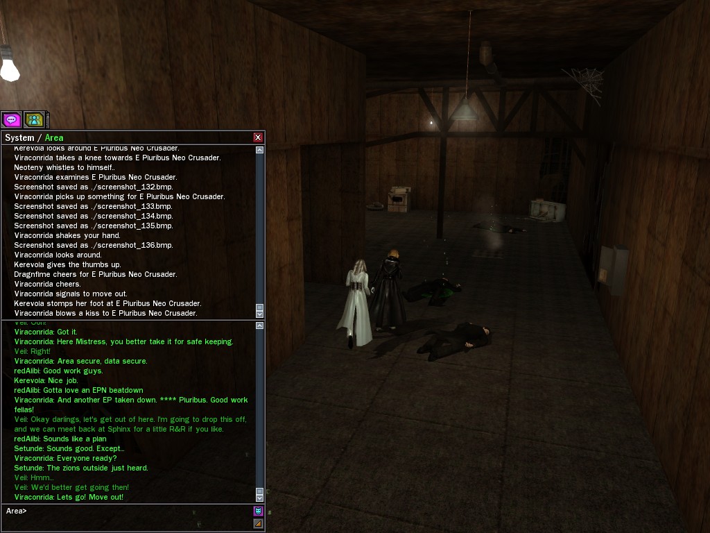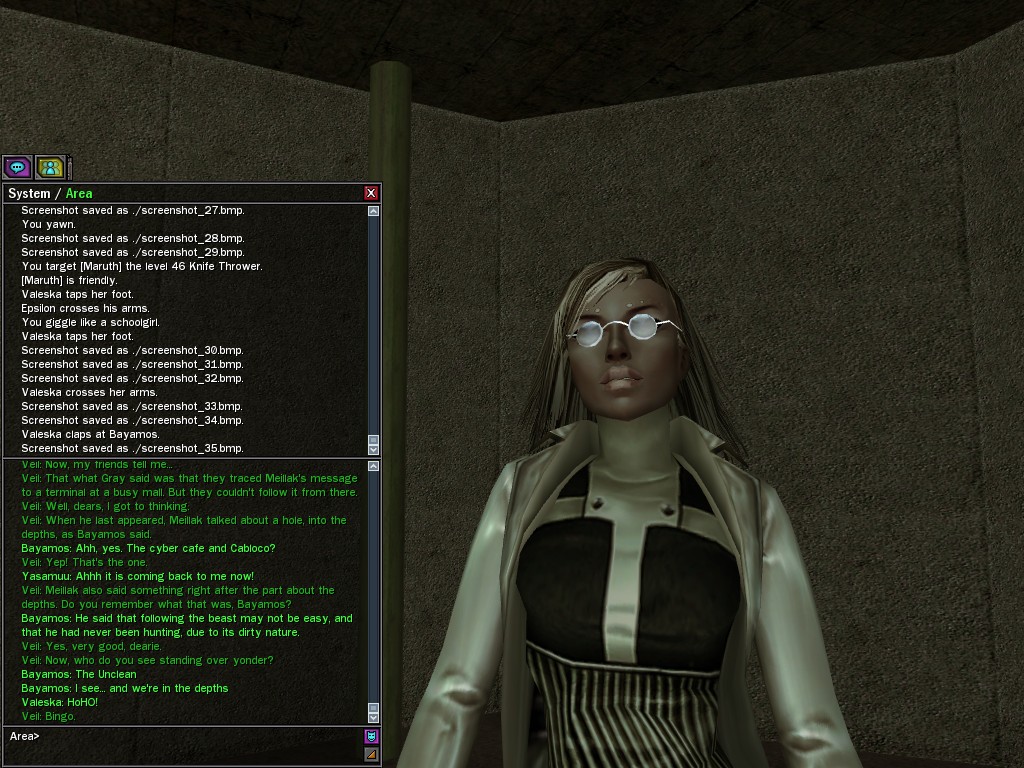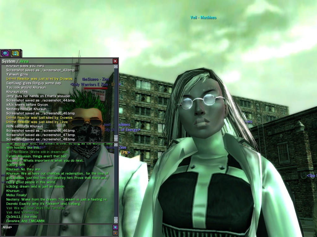 Well, dearies! A few of us were lucky enough to have a night out on the town with our new liaison officer, Maruth! And what a time we had, clearing those pesky EPNs off the public telephones! We just won't stand for this kind of disturbing the peace in our town, no sir! Some dull Zionites showed up, but we played a little joke on them to give them the slip. It was a close call, though--they almost bored us to death! Have fun with Maruth, sweeties! 'Til next time, xoxox Veil