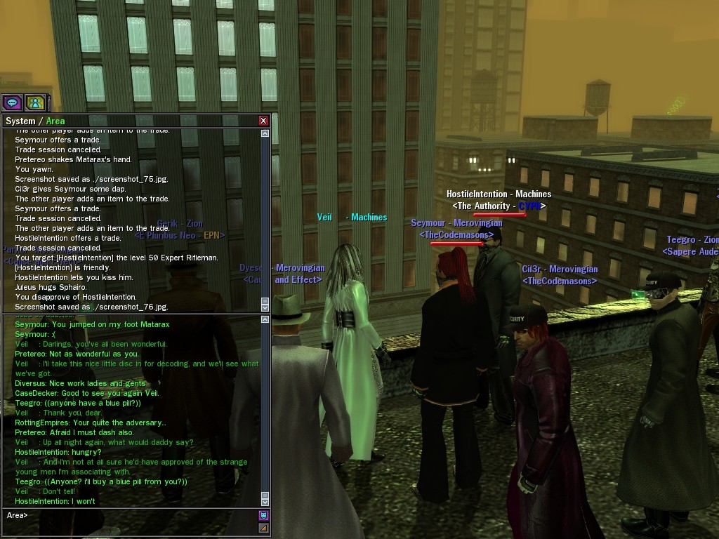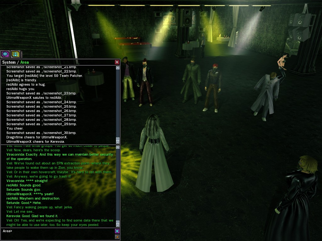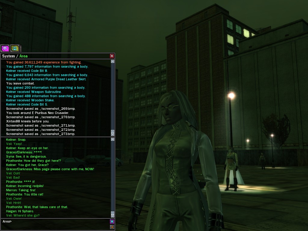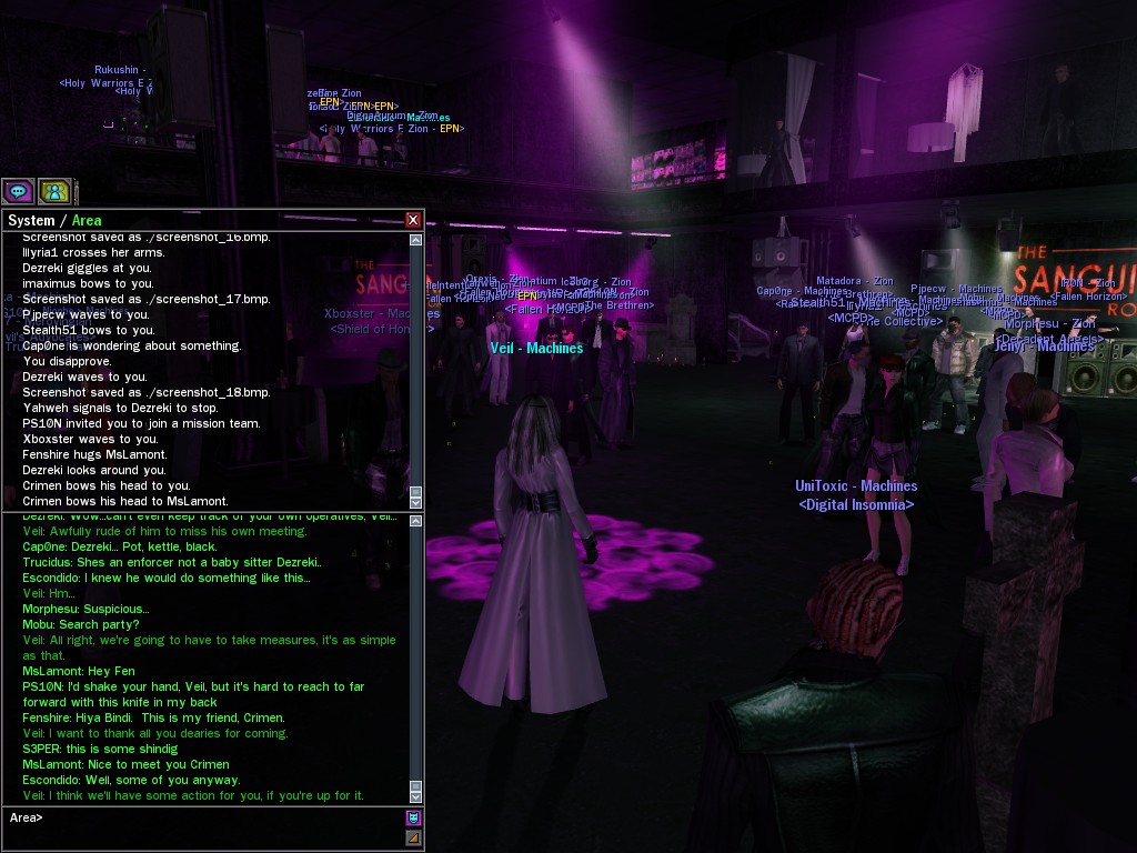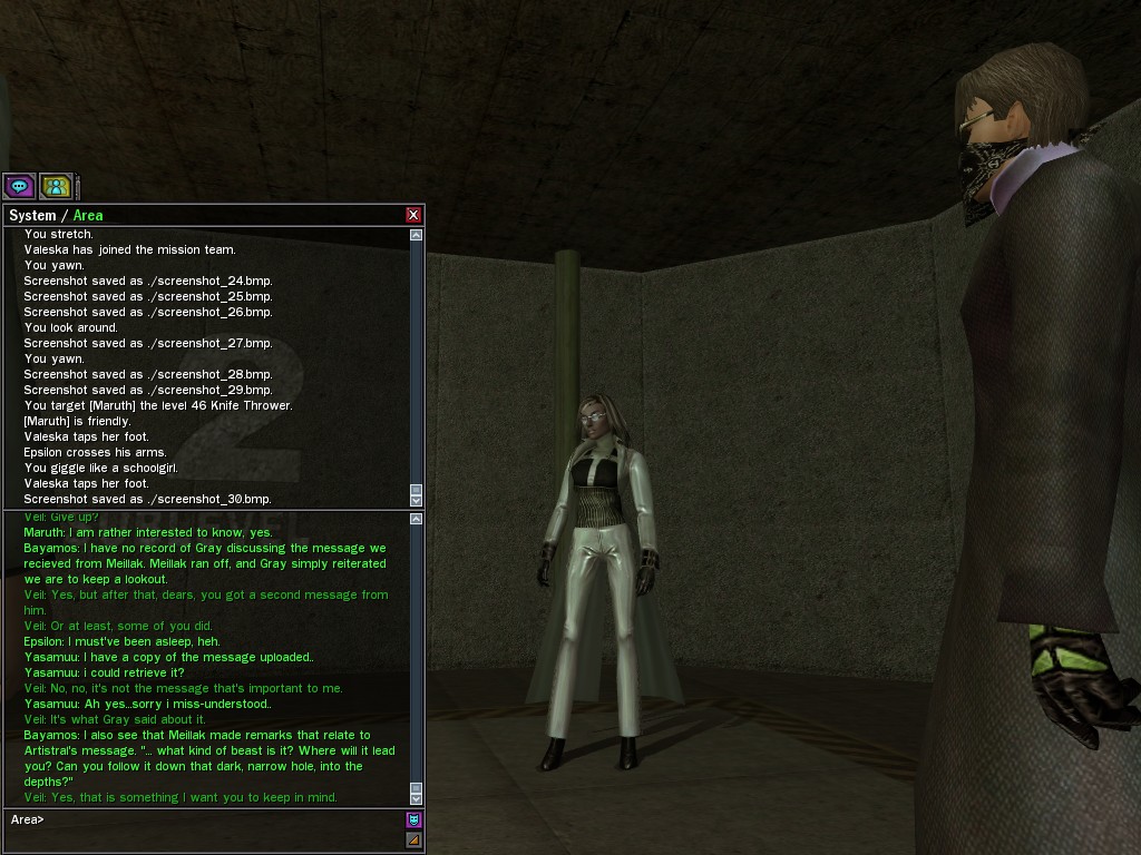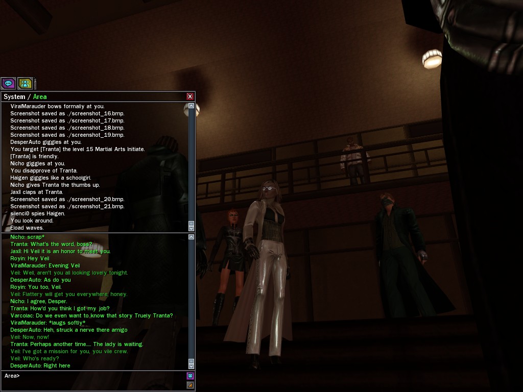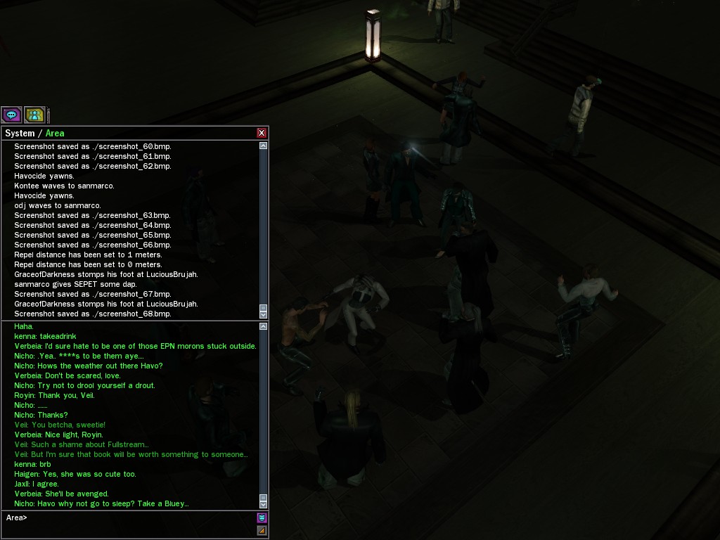 Well, dearies! A few of us were lucky enough to have a night out on the town with our new liaison officer, Maruth! And what a time we had, clearing those pesky EPNs off the public telephones! We just won't stand for this kind of disturbing the peace in our town, no sir! Some dull Zionites showed up, but we played a little joke on them to give them the slip. It was a close call, though--they almost bored us to death! Have fun with Maruth, sweeties! 'Til next time, xoxox Veil