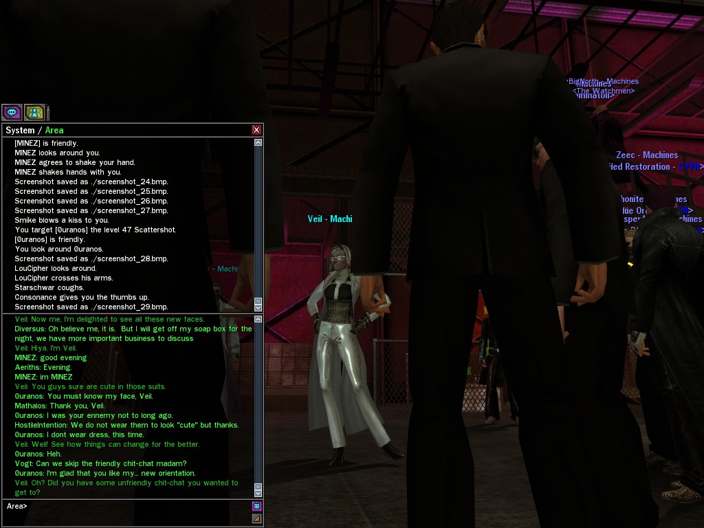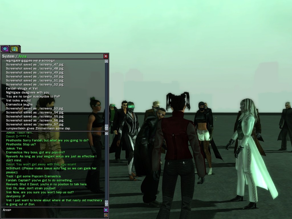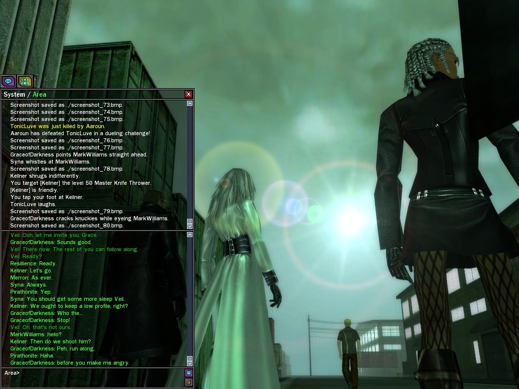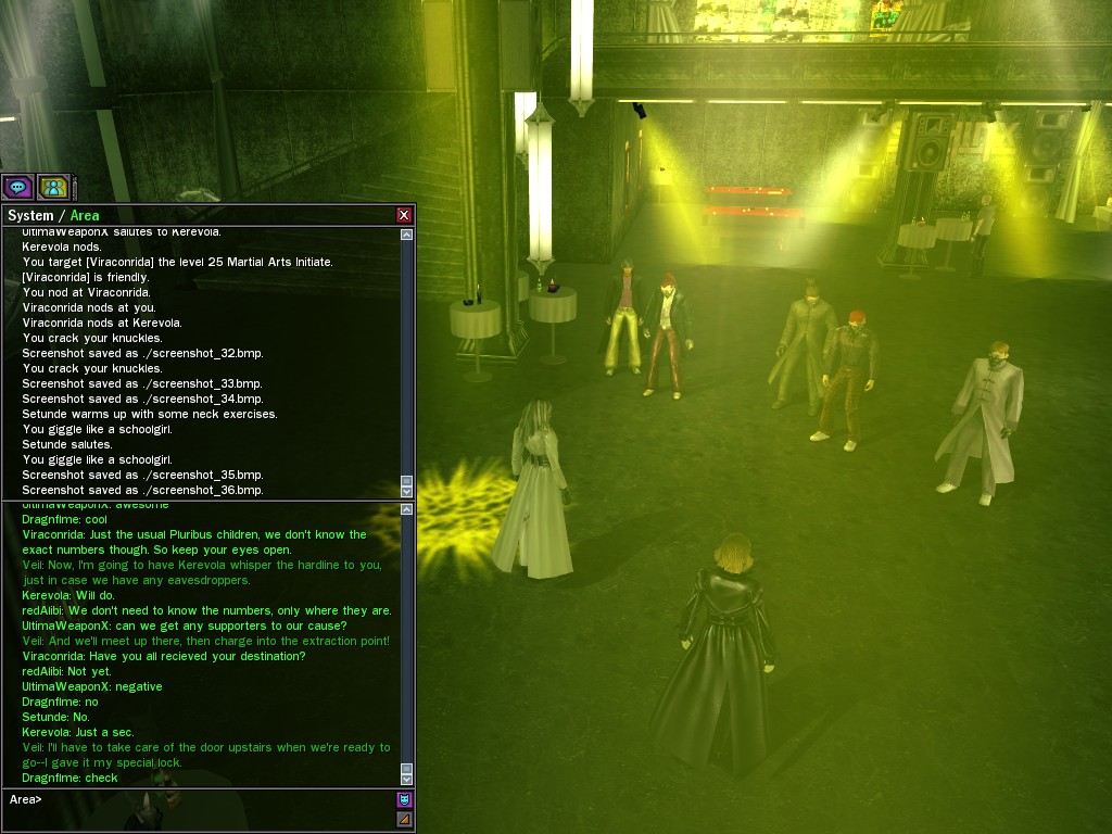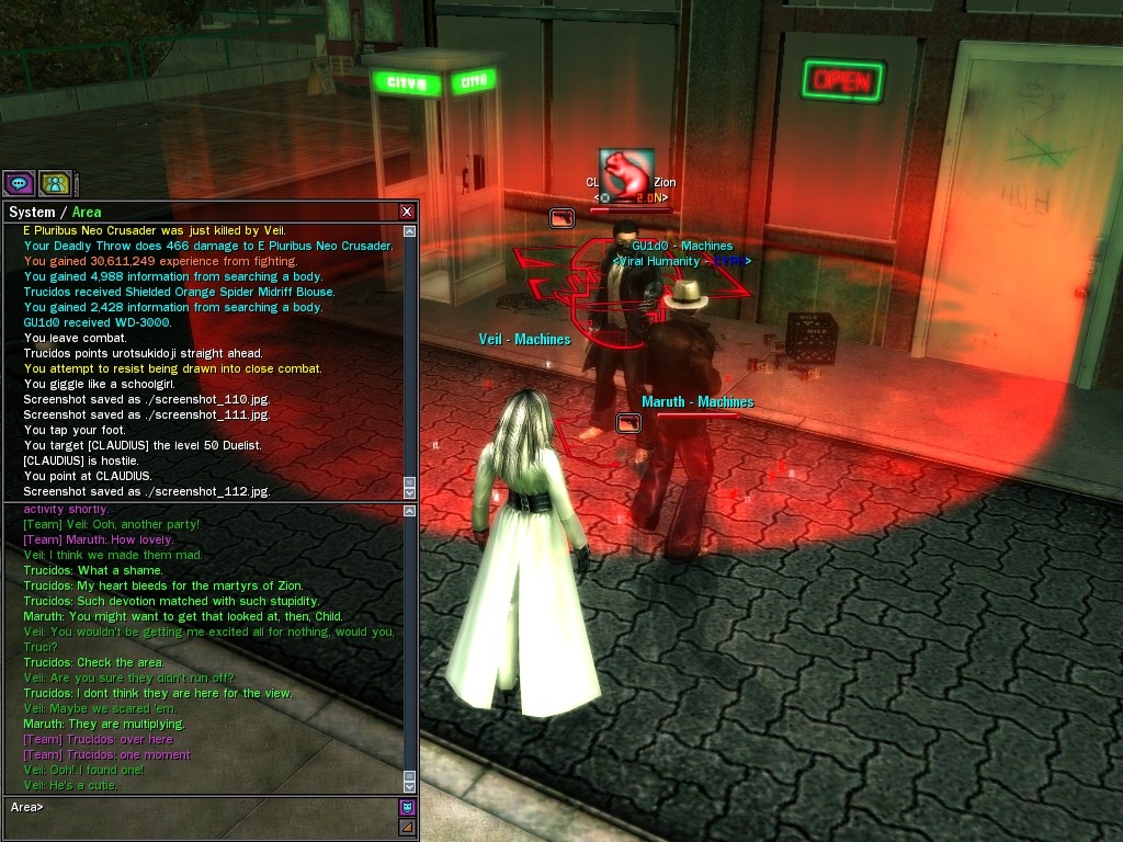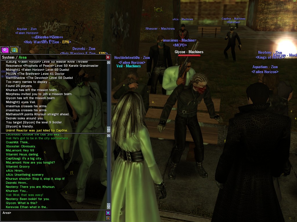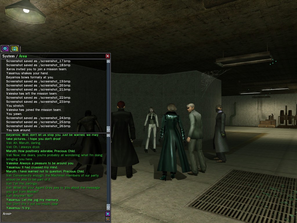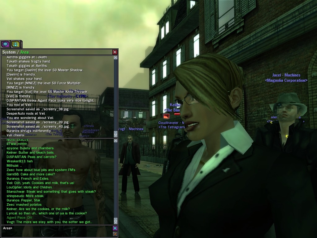 Well, dearies! A few of us were lucky enough to have a night out on the town with our new liaison officer, Maruth! And what a time we had, clearing those pesky EPNs off the public telephones! We just won't stand for this kind of disturbing the peace in our town, no sir! Some dull Zionites showed up, but we played a little joke on them to give them the slip. It was a close call, though--they almost bored us to death! Have fun with Maruth, sweeties! 'Til next time, xoxox Veil