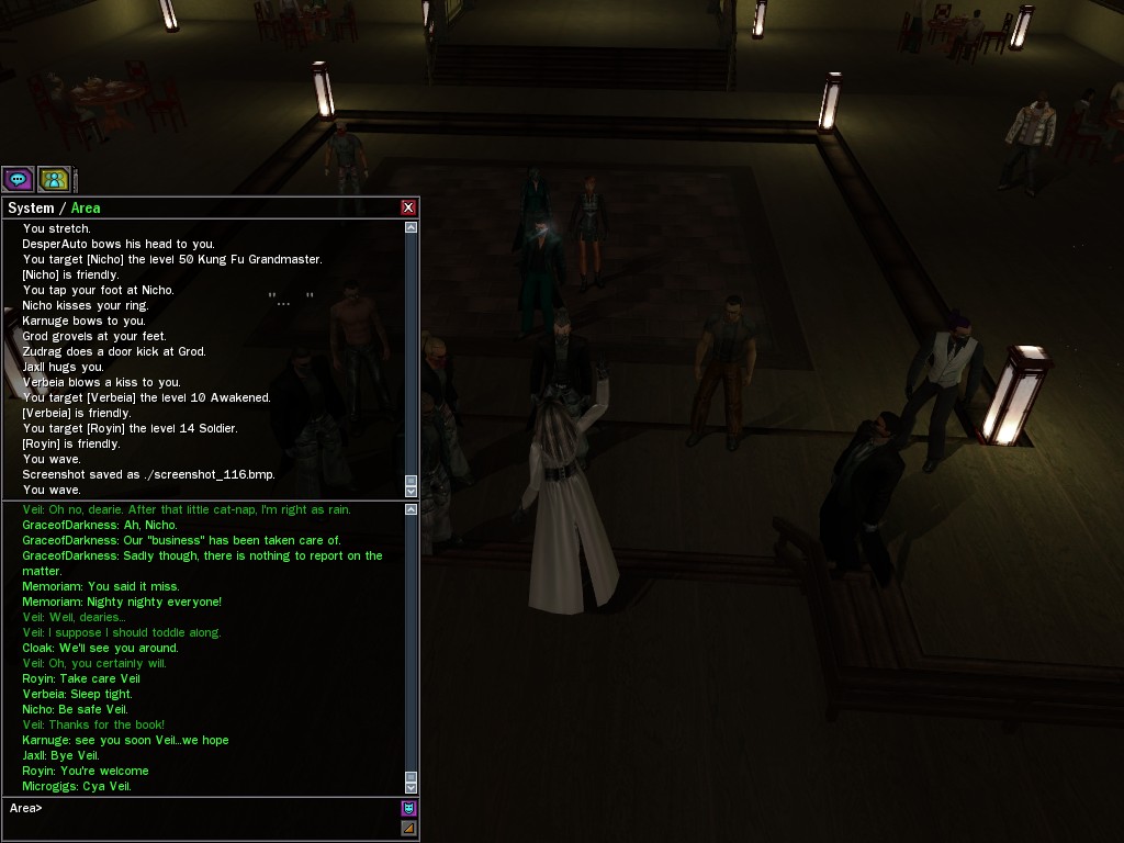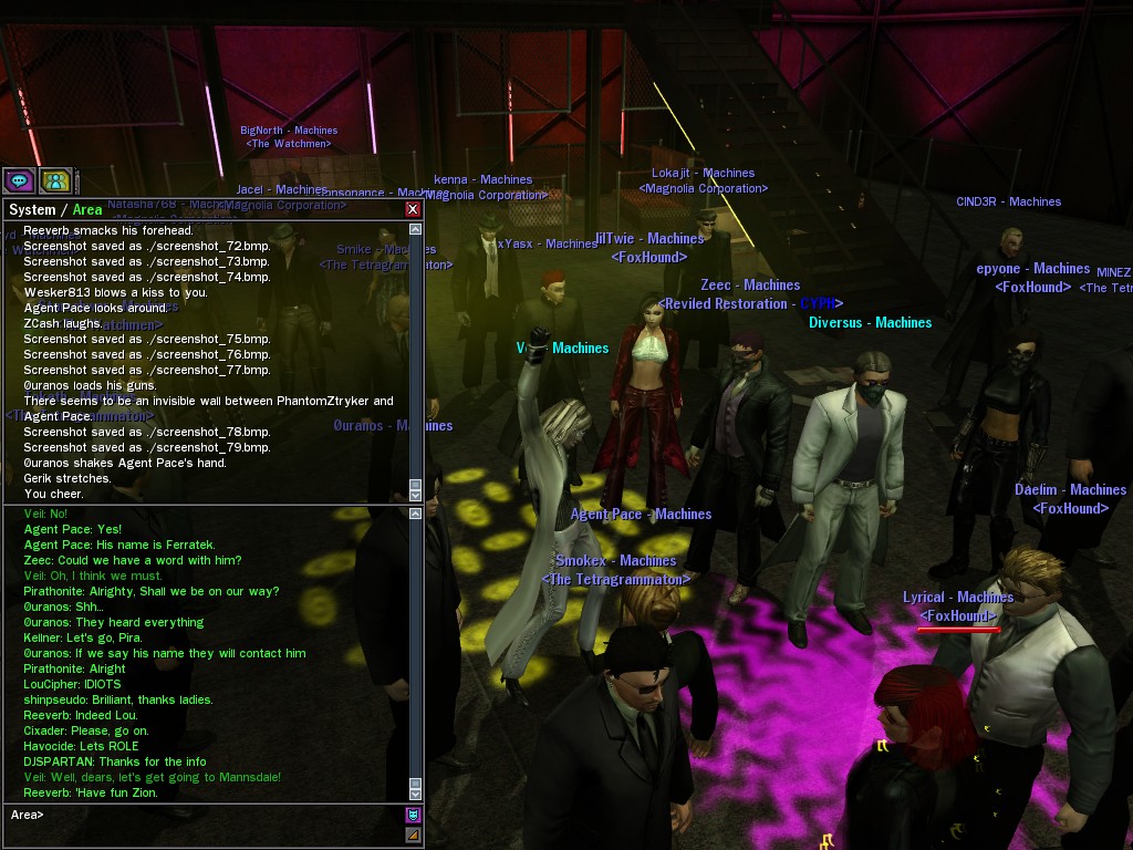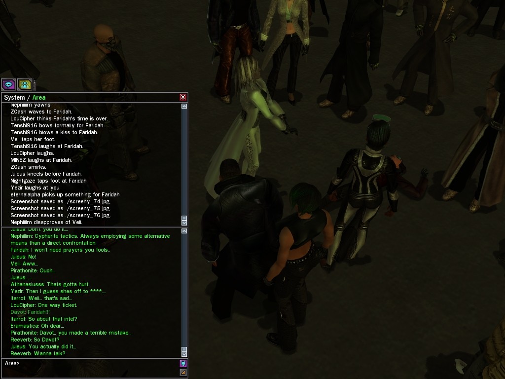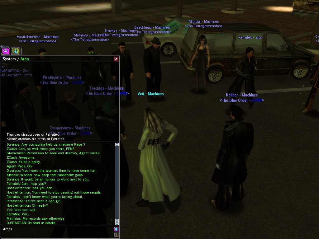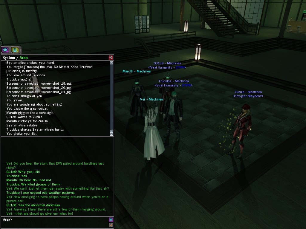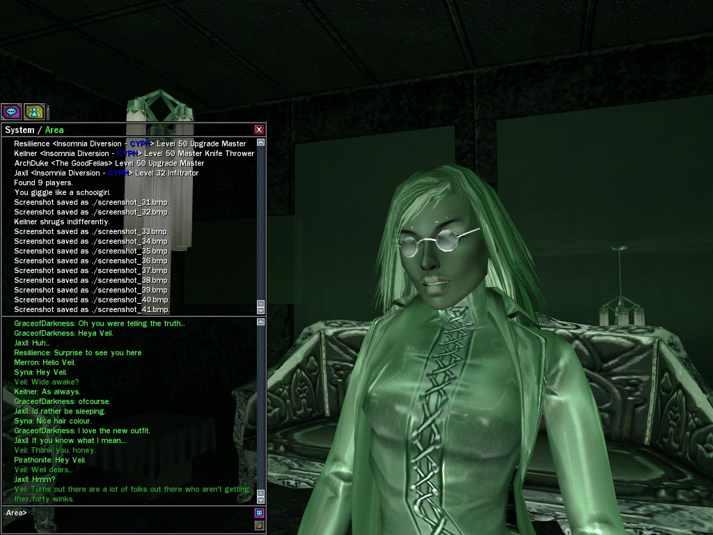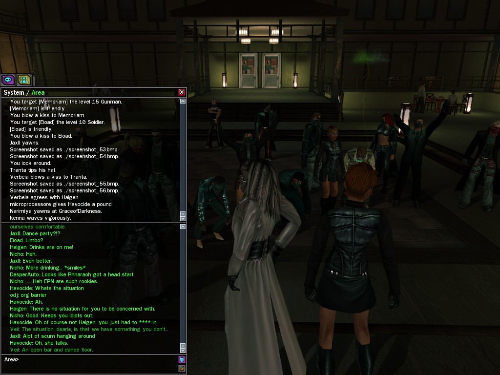Well, dearies! A few of us were lucky enough to have a night out on the town with our new liaison officer, Maruth! And what a time we had, clearing those pesky EPNs off the public telephones! We just won't stand for this kind of disturbing the peace in our town, no sir! Some dull Zionites showed up, but we played a little joke on them to give them the slip. It was a close call, though--they almost bored us to death! Have fun with Maruth, sweeties! 'Til next time, xoxox Veil