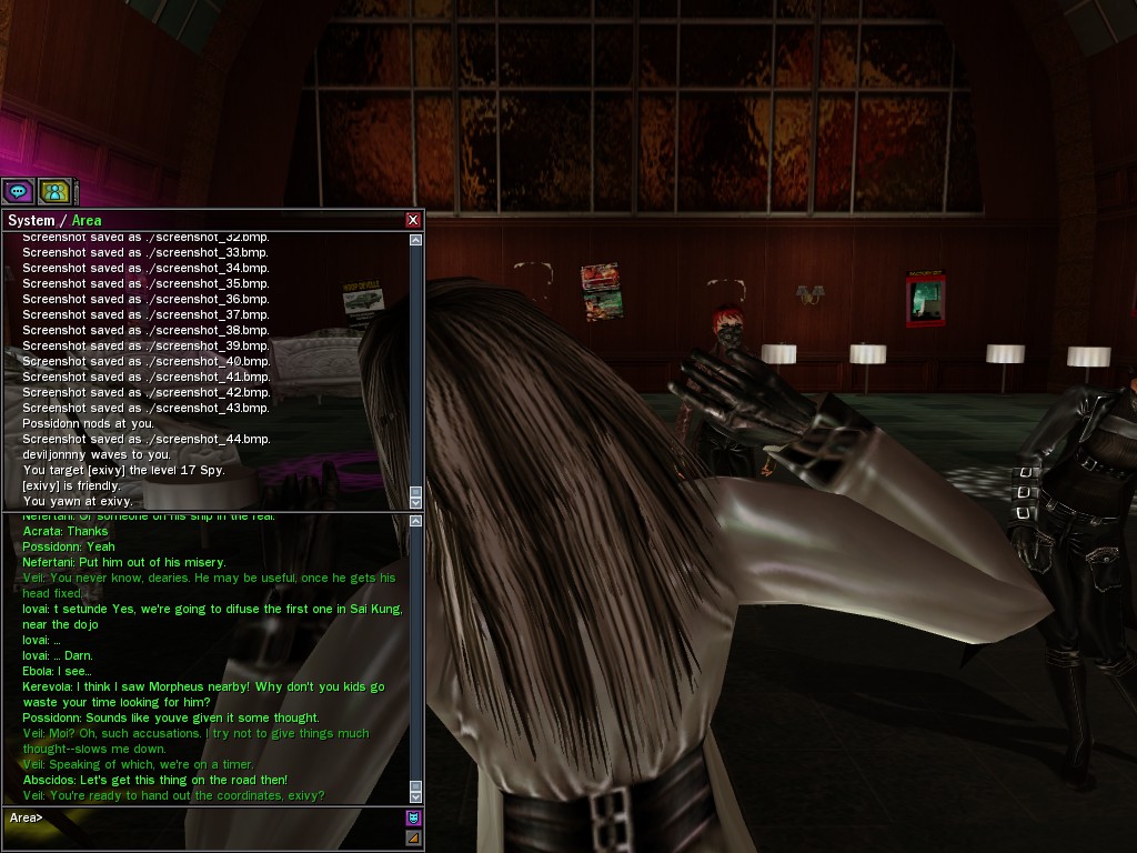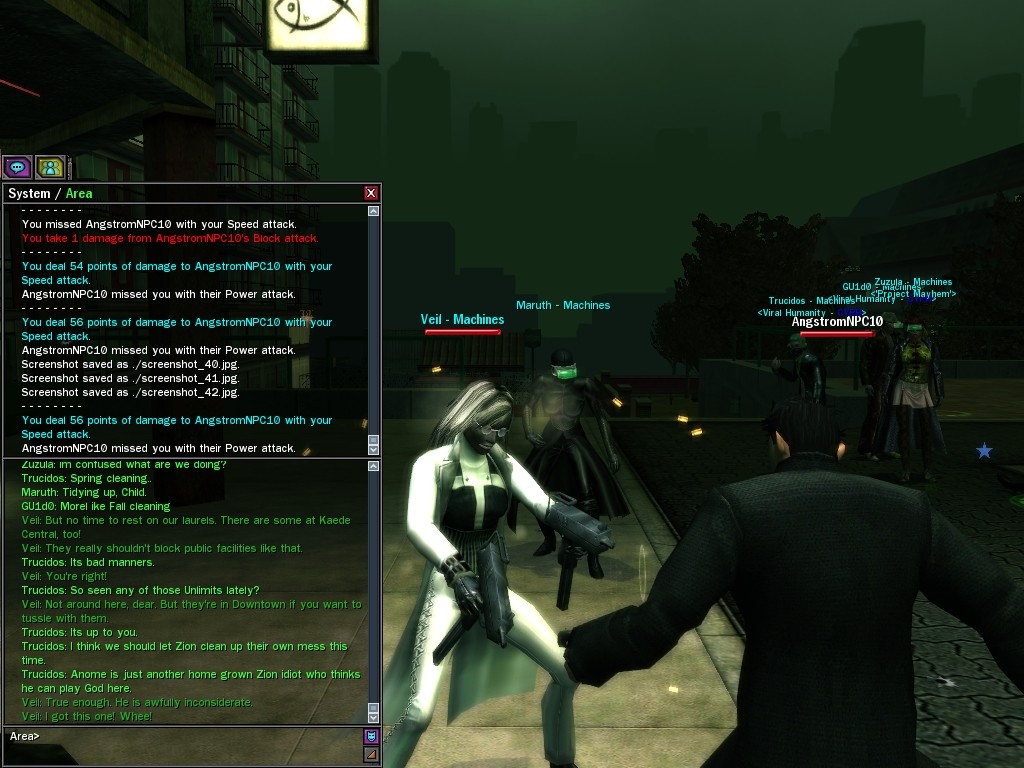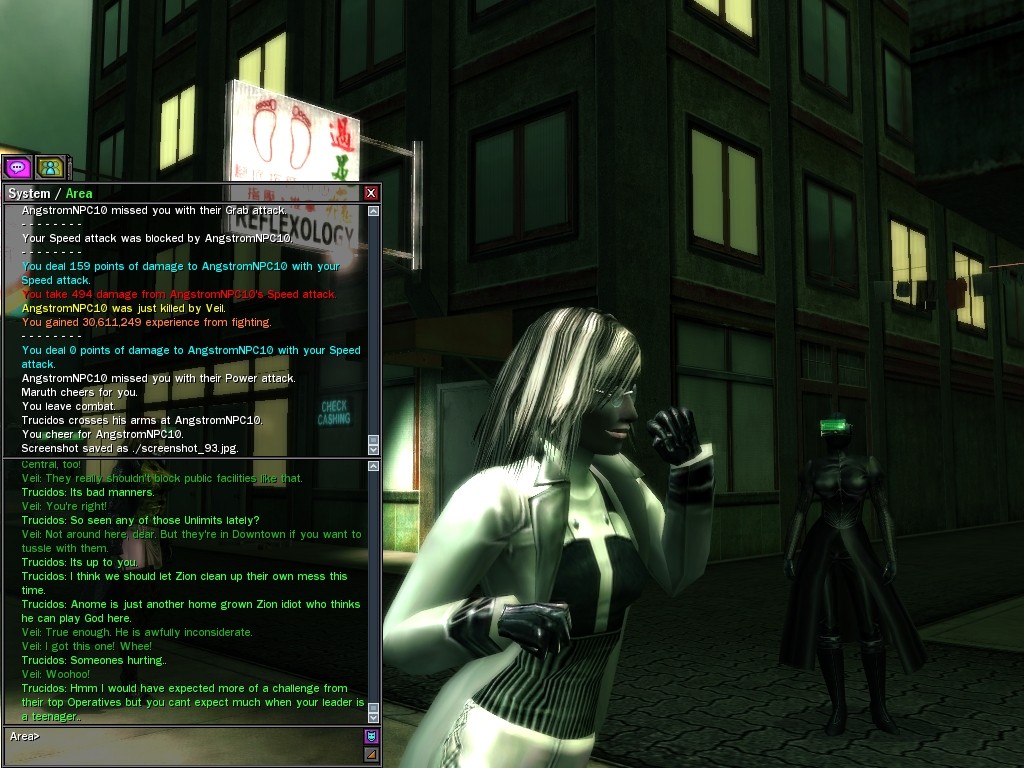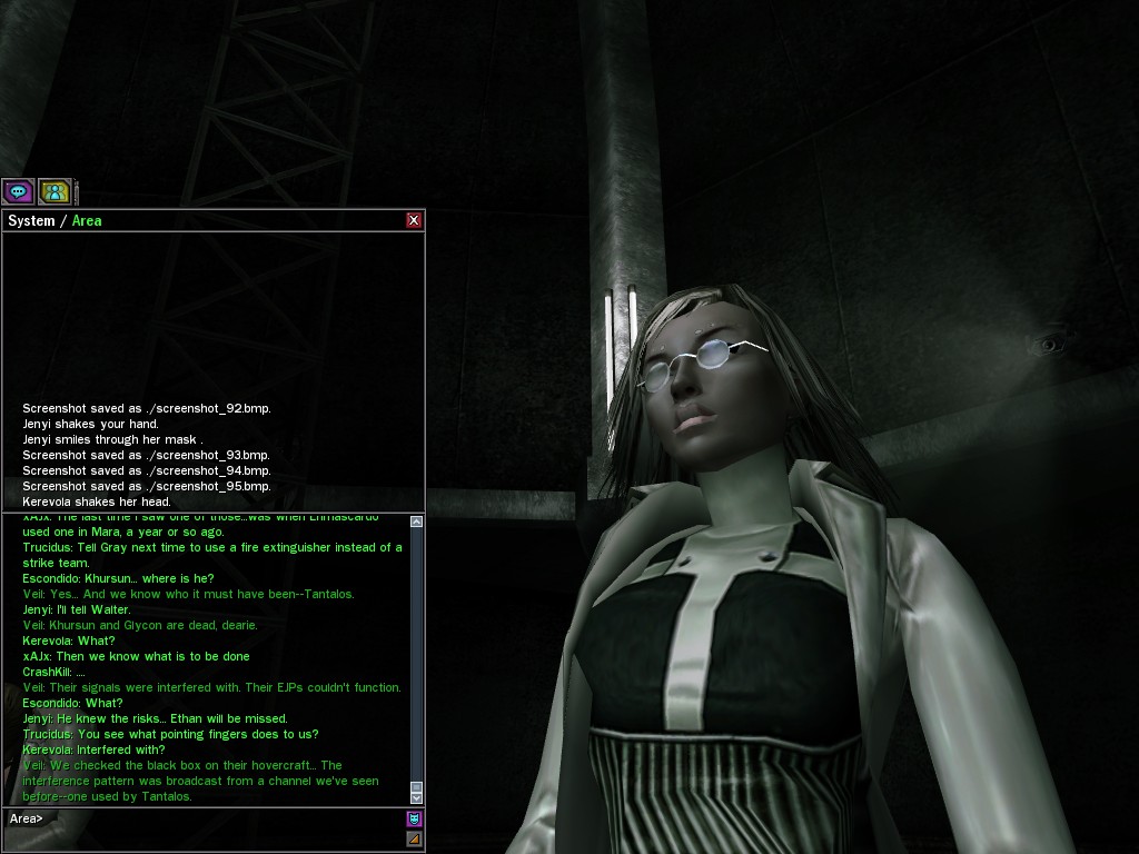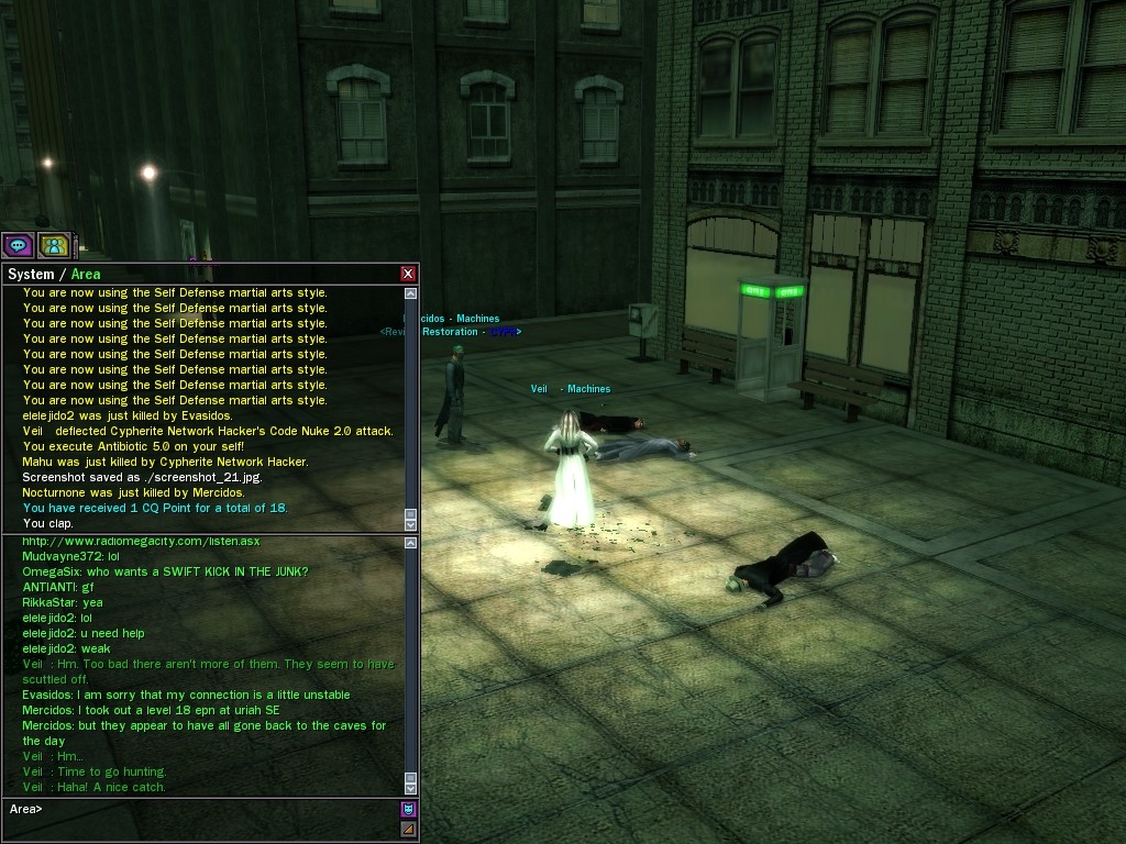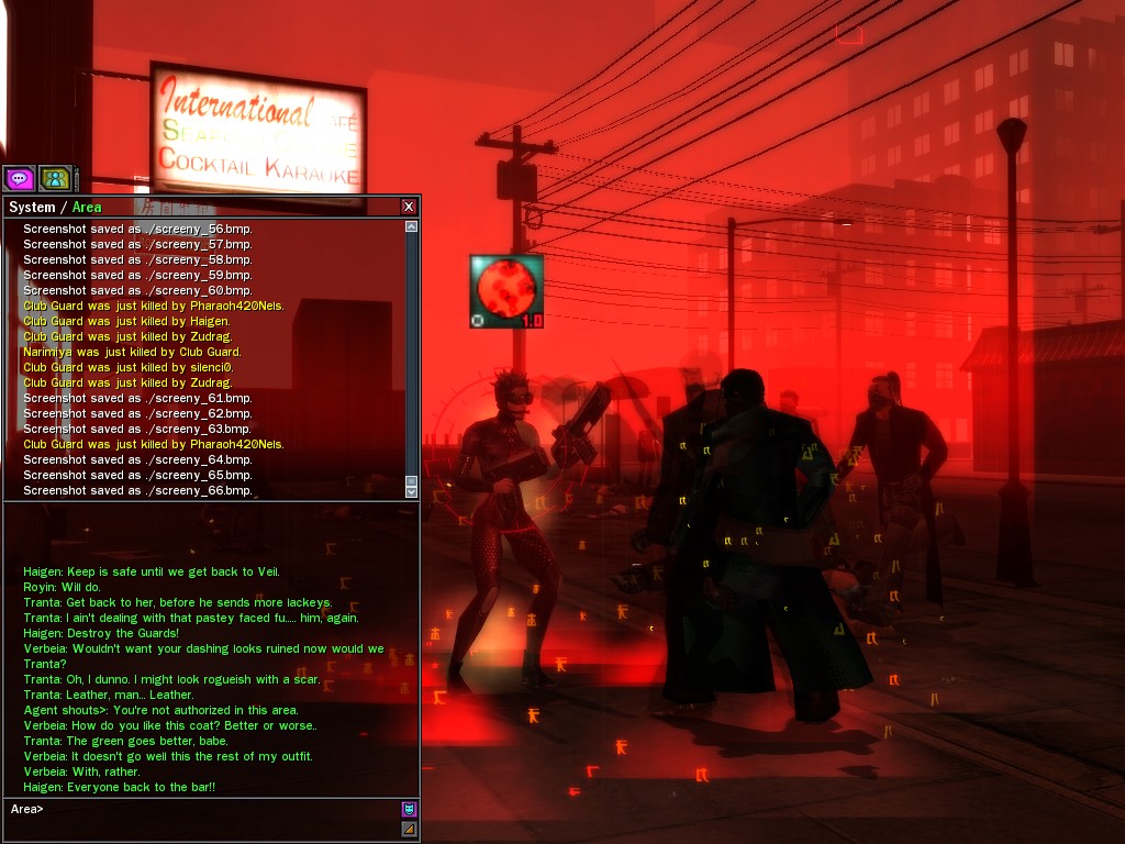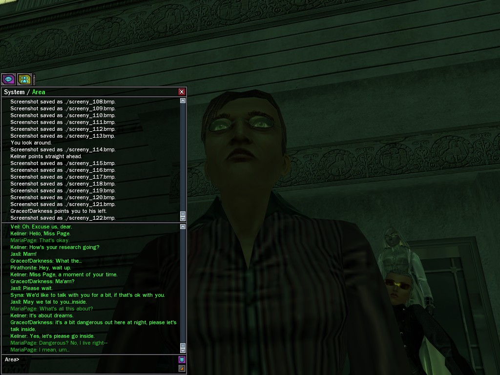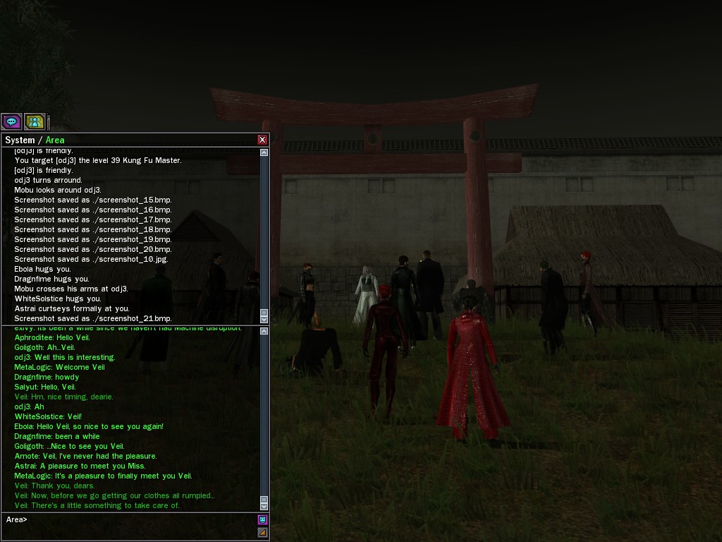 Well, dearies! A few of us were lucky enough to have a night out on the town with our new liaison officer, Maruth! And what a time we had, clearing those pesky EPNs off the public telephones! We just won't stand for this kind of disturbing the peace in our town, no sir! Some dull Zionites showed up, but we played a little joke on them to give them the slip. It was a close call, though--they almost bored us to death! Have fun with Maruth, sweeties! 'Til next time, xoxox Veil