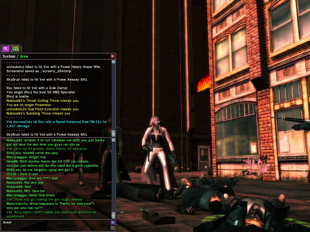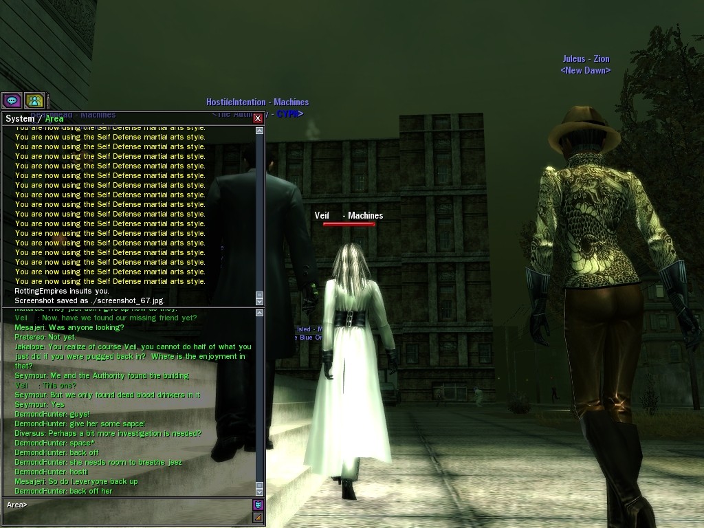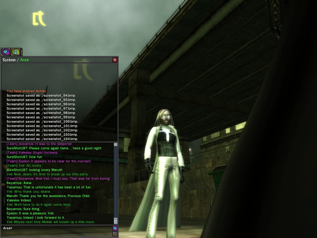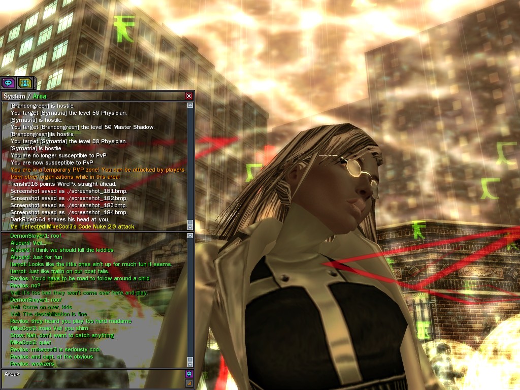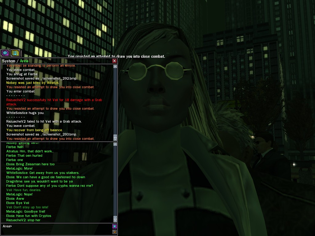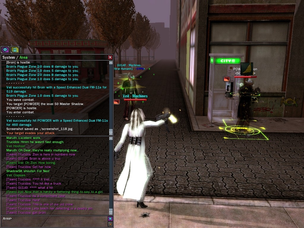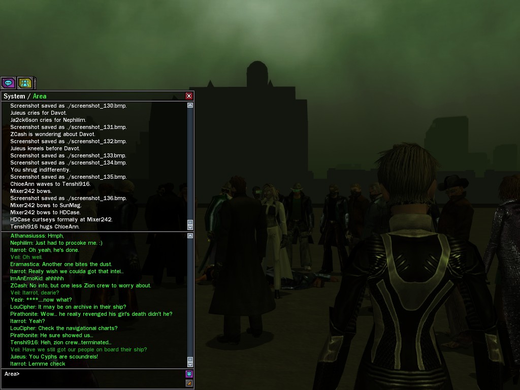 Well, dearies! A few of us were lucky enough to have a night out on the town with our new liaison officer, Maruth! And what a time we had, clearing those pesky EPNs off the public telephones! We just won't stand for this kind of disturbing the peace in our town, no sir! Some dull Zionites showed up, but we played a little joke on them to give them the slip. It was a close call, though--they almost bored us to death! Have fun with Maruth, sweeties! 'Til next time, xoxox Veil