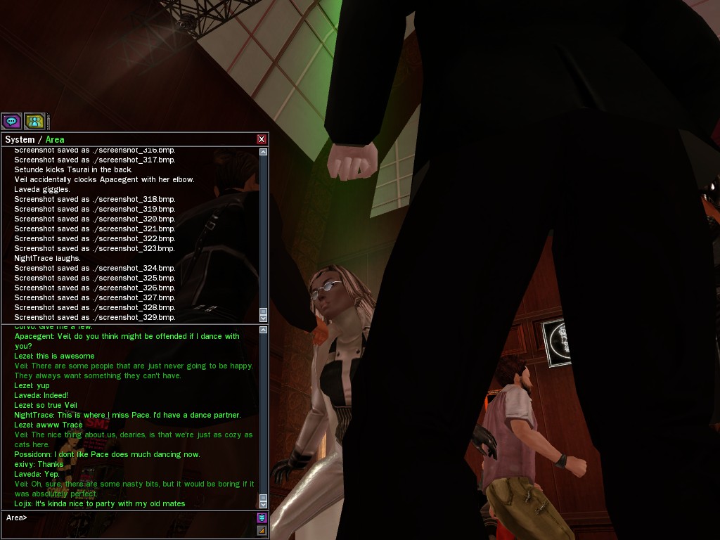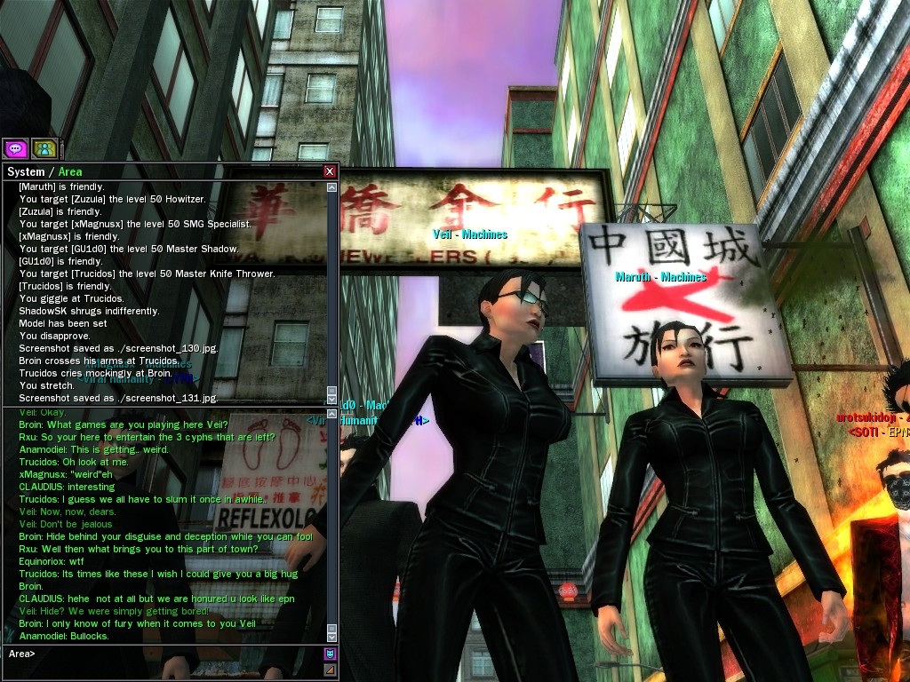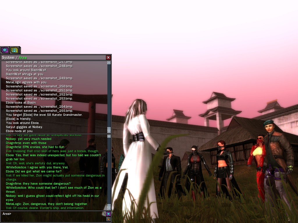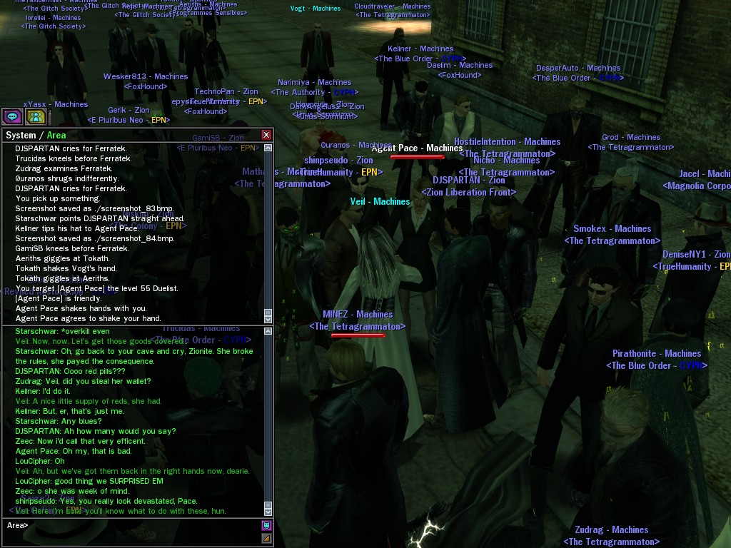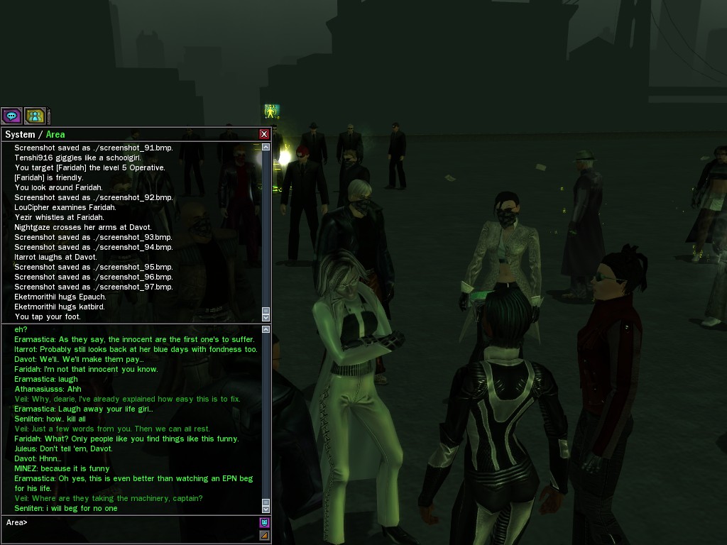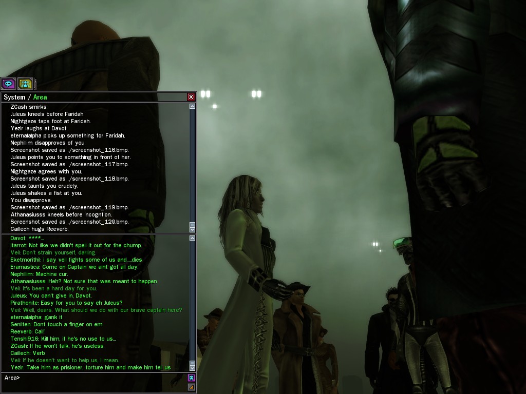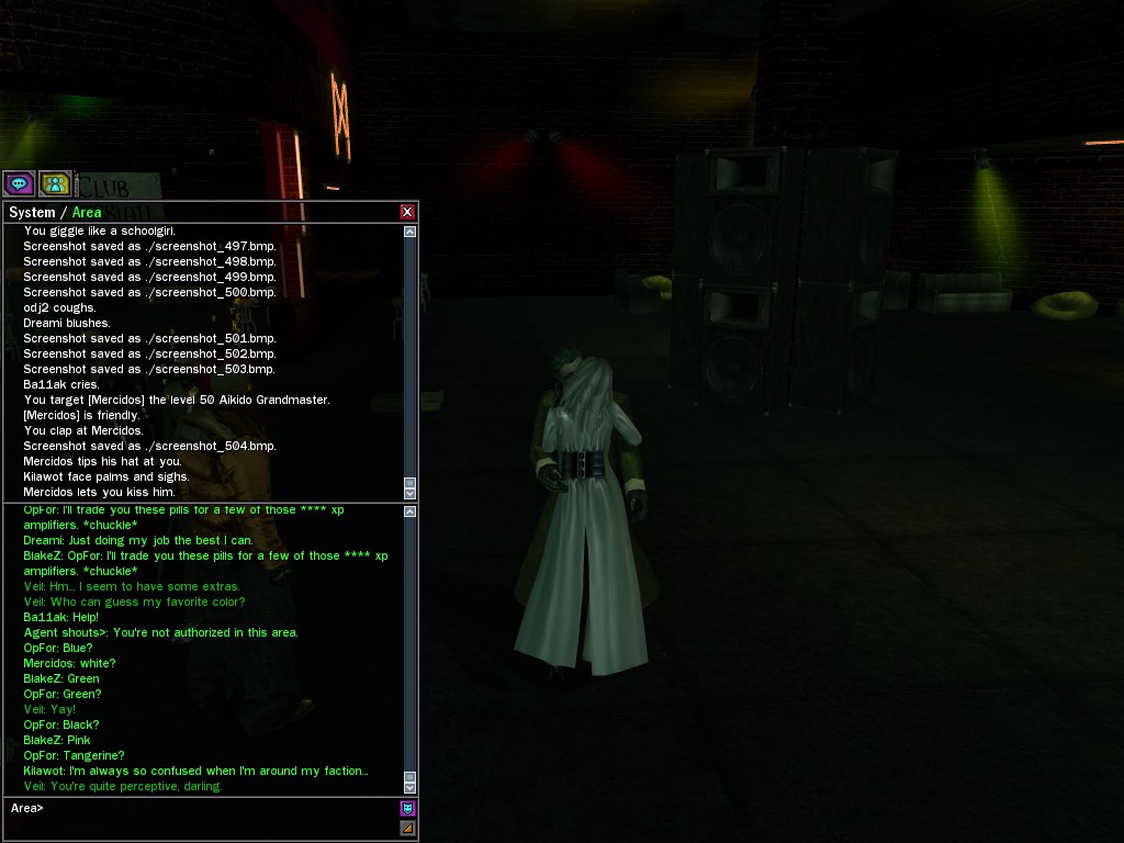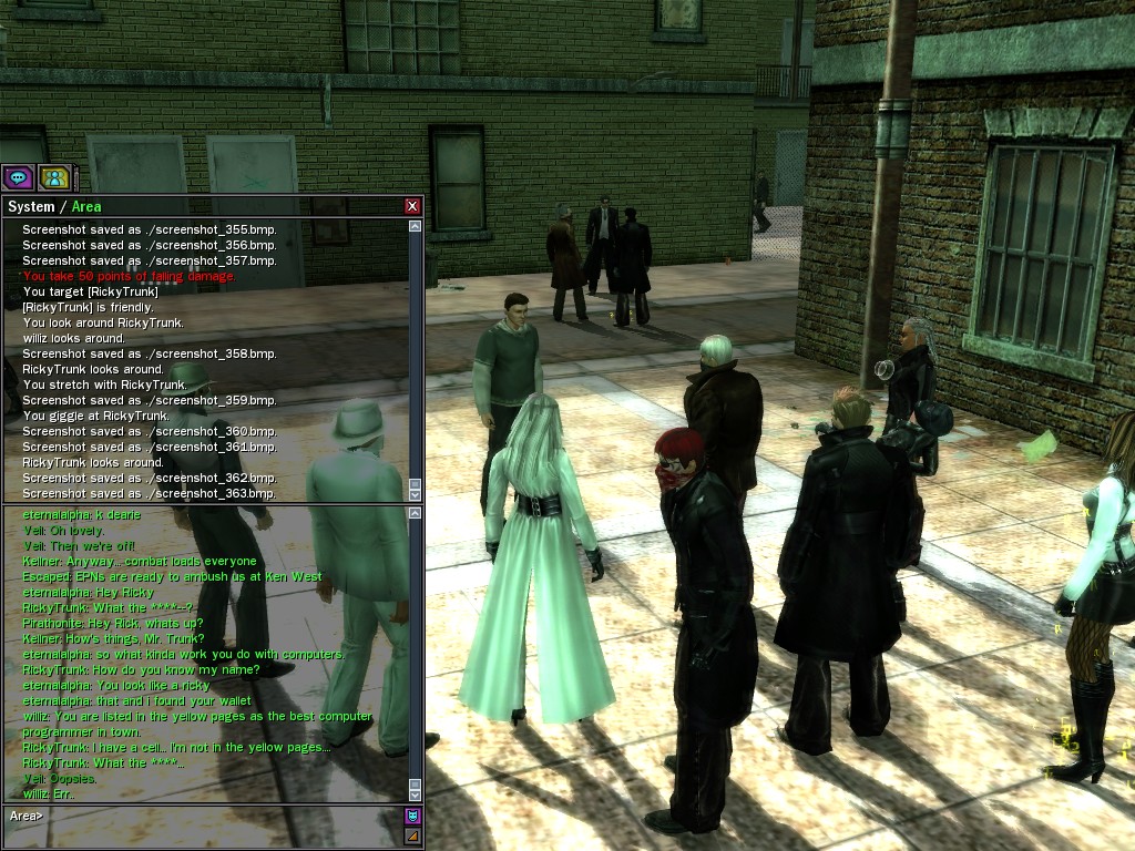 Well, dearies! A few of us were lucky enough to have a night out on the town with our new liaison officer, Maruth! And what a time we had, clearing those pesky EPNs off the public telephones! We just won't stand for this kind of disturbing the peace in our town, no sir! Some dull Zionites showed up, but we played a little joke on them to give them the slip. It was a close call, though--they almost bored us to death! Have fun with Maruth, sweeties! 'Til next time, xoxox Veil