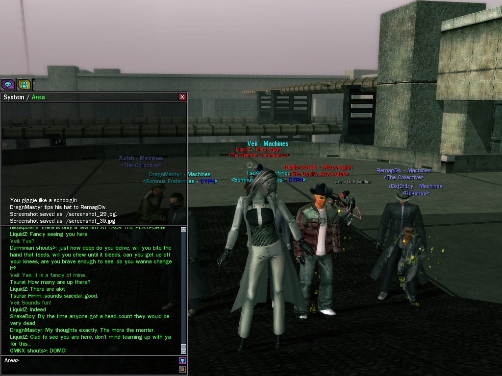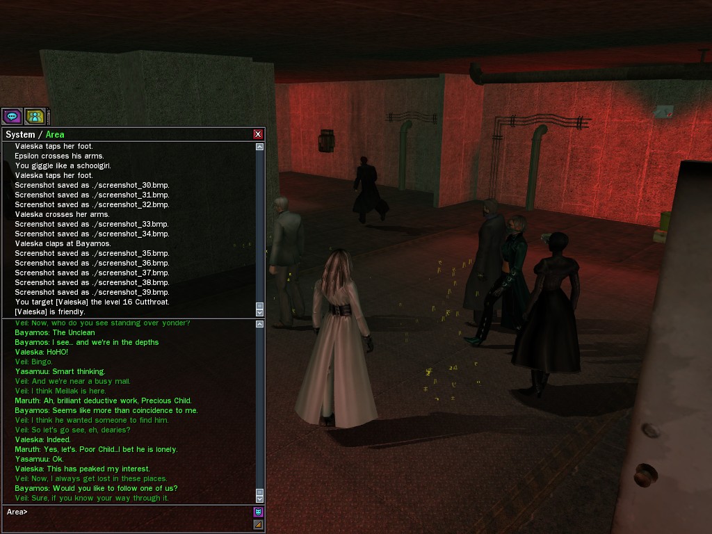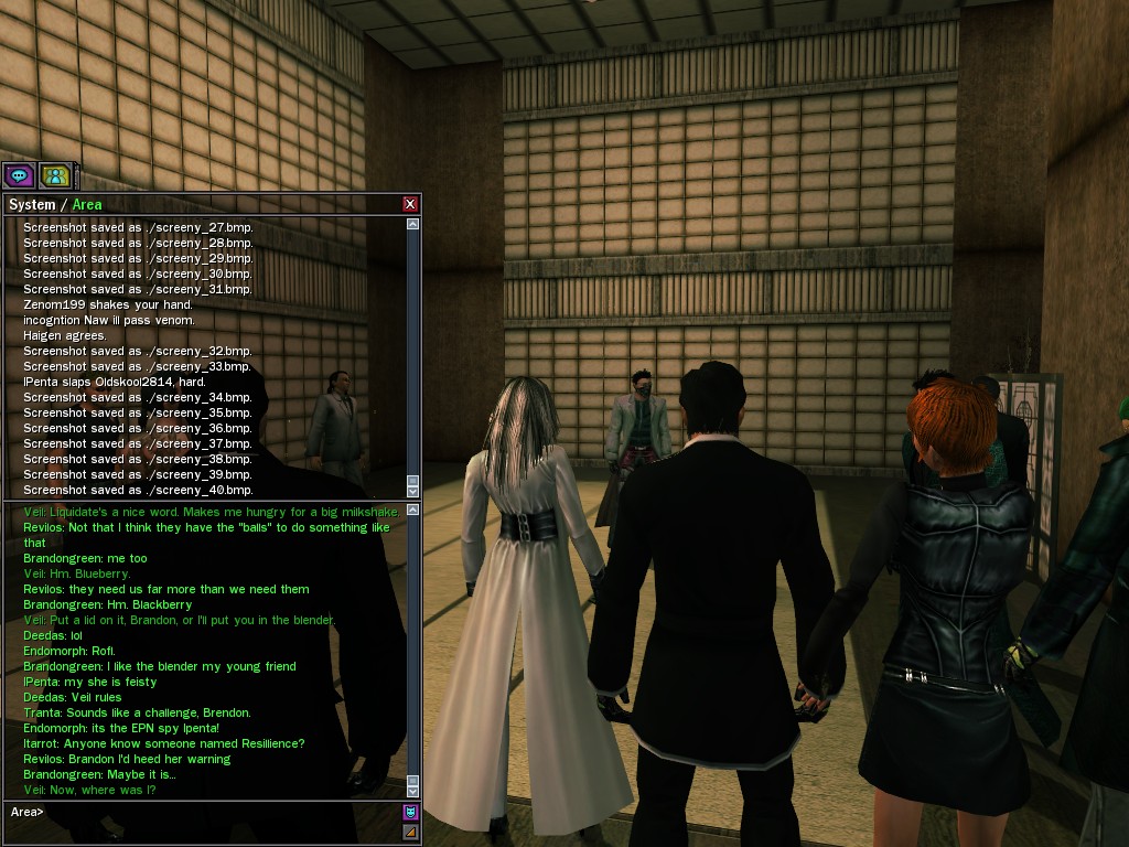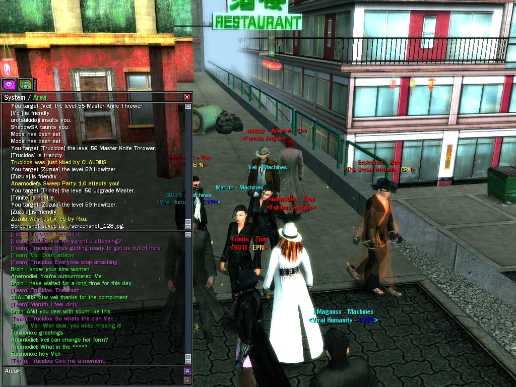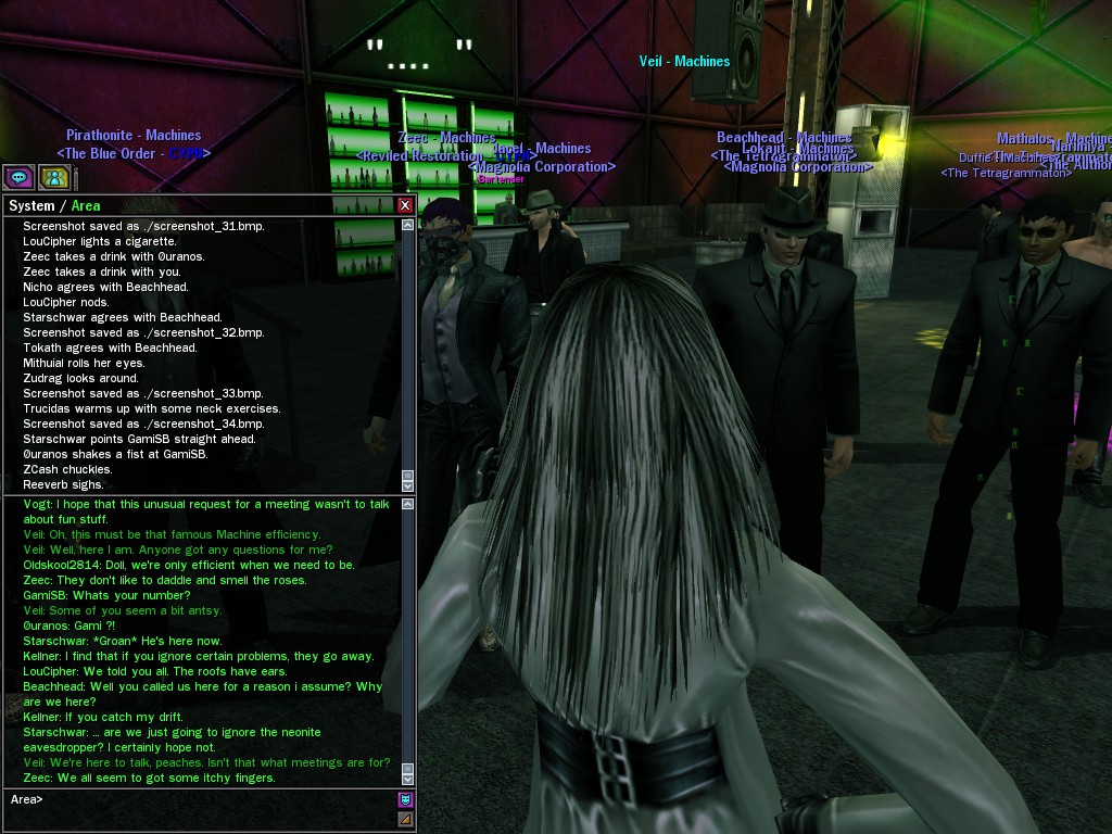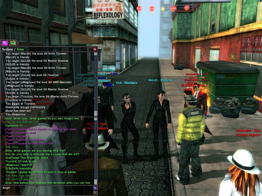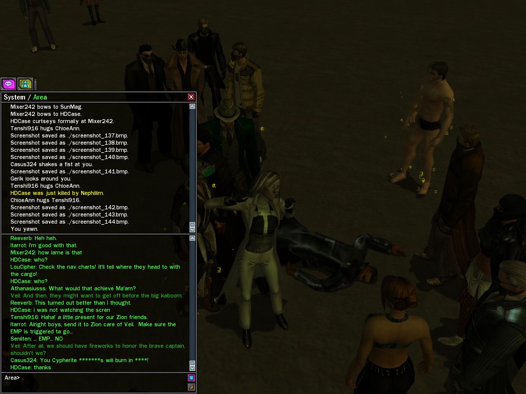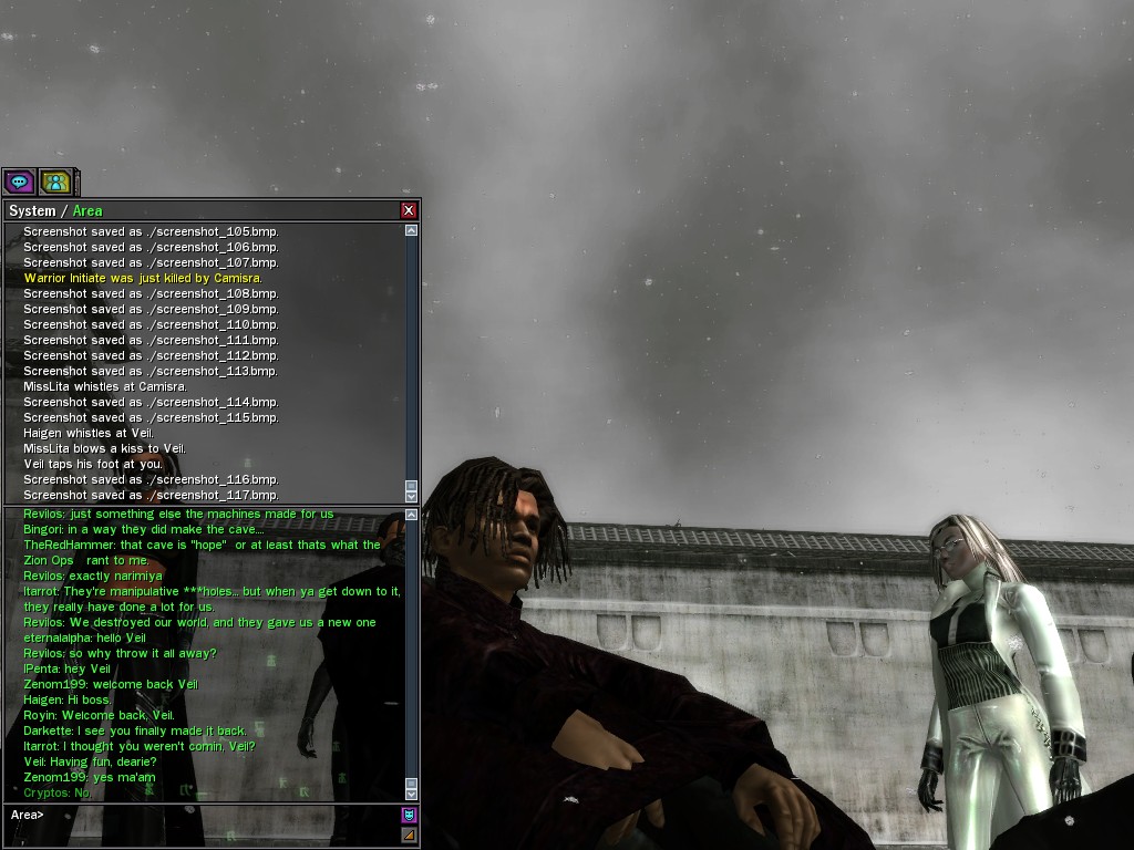 Well, dearies! A few of us were lucky enough to have a night out on the town with our new liaison officer, Maruth! And what a time we had, clearing those pesky EPNs off the public telephones! We just won't stand for this kind of disturbing the peace in our town, no sir! Some dull Zionites showed up, but we played a little joke on them to give them the slip. It was a close call, though--they almost bored us to death! Have fun with Maruth, sweeties! 'Til next time, xoxox Veil
