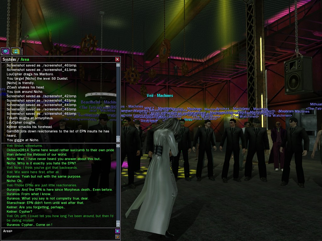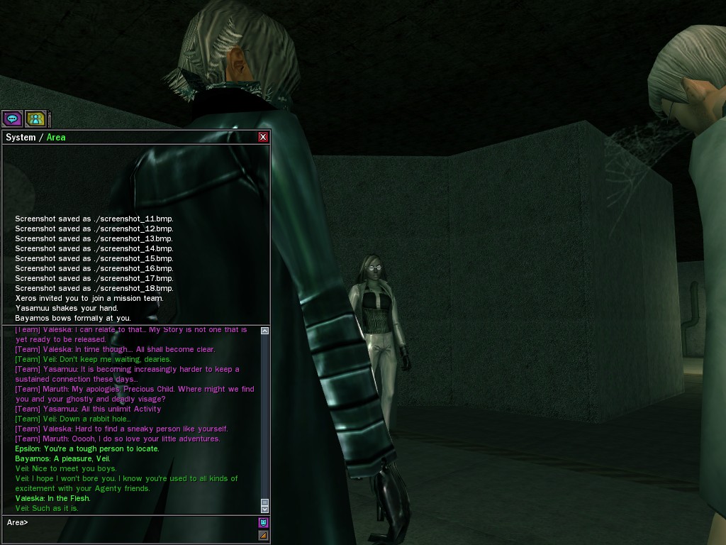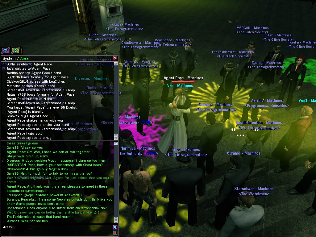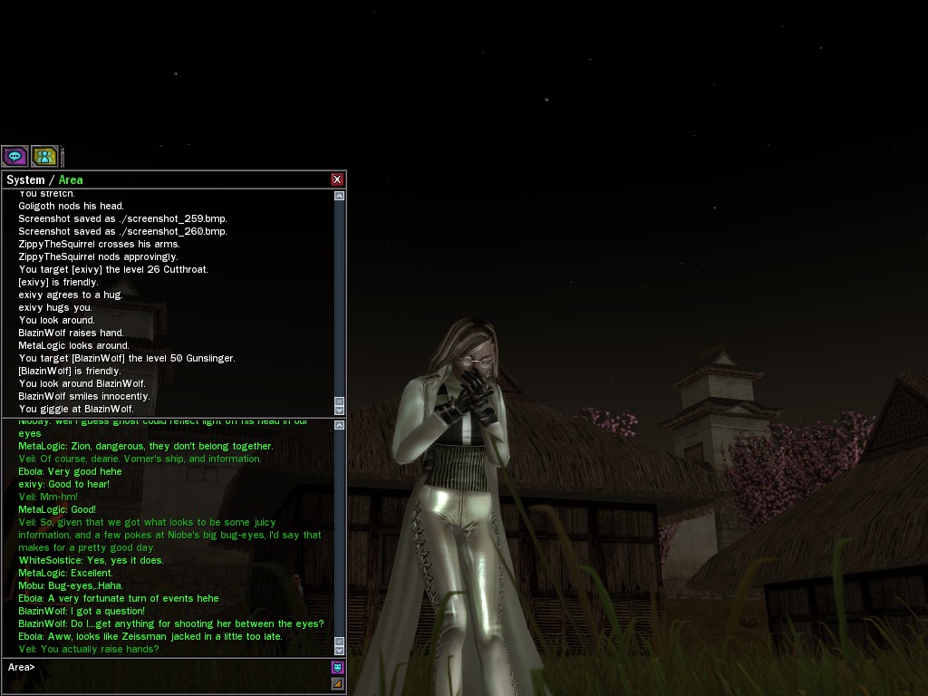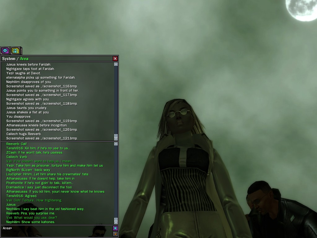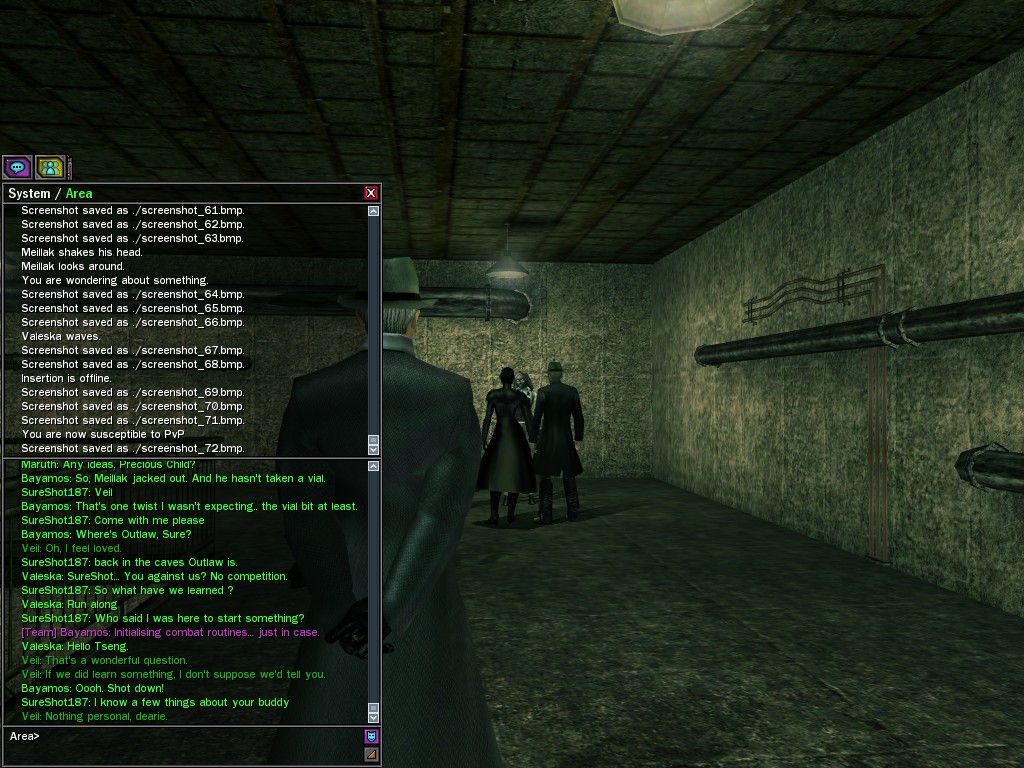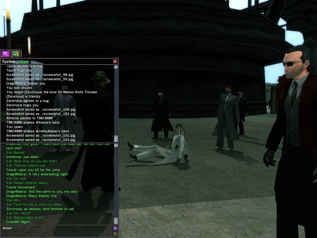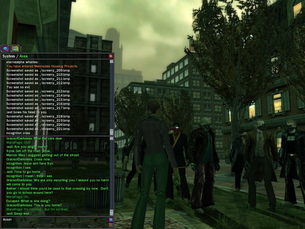 Well, dearies! A few of us were lucky enough to have a night out on the town with our new liaison officer, Maruth! And what a time we had, clearing those pesky EPNs off the public telephones! We just won't stand for this kind of disturbing the peace in our town, no sir! Some dull Zionites showed up, but we played a little joke on them to give them the slip. It was a close call, though--they almost bored us to death! Have fun with Maruth, sweeties! 'Til next time, xoxox Veil