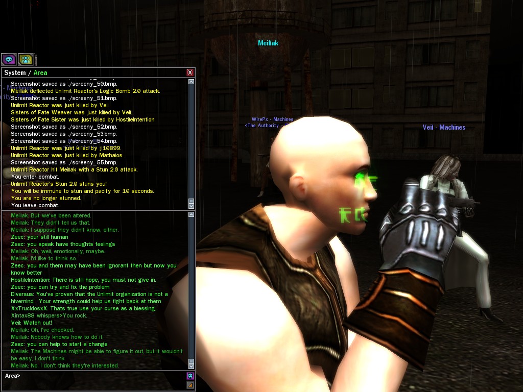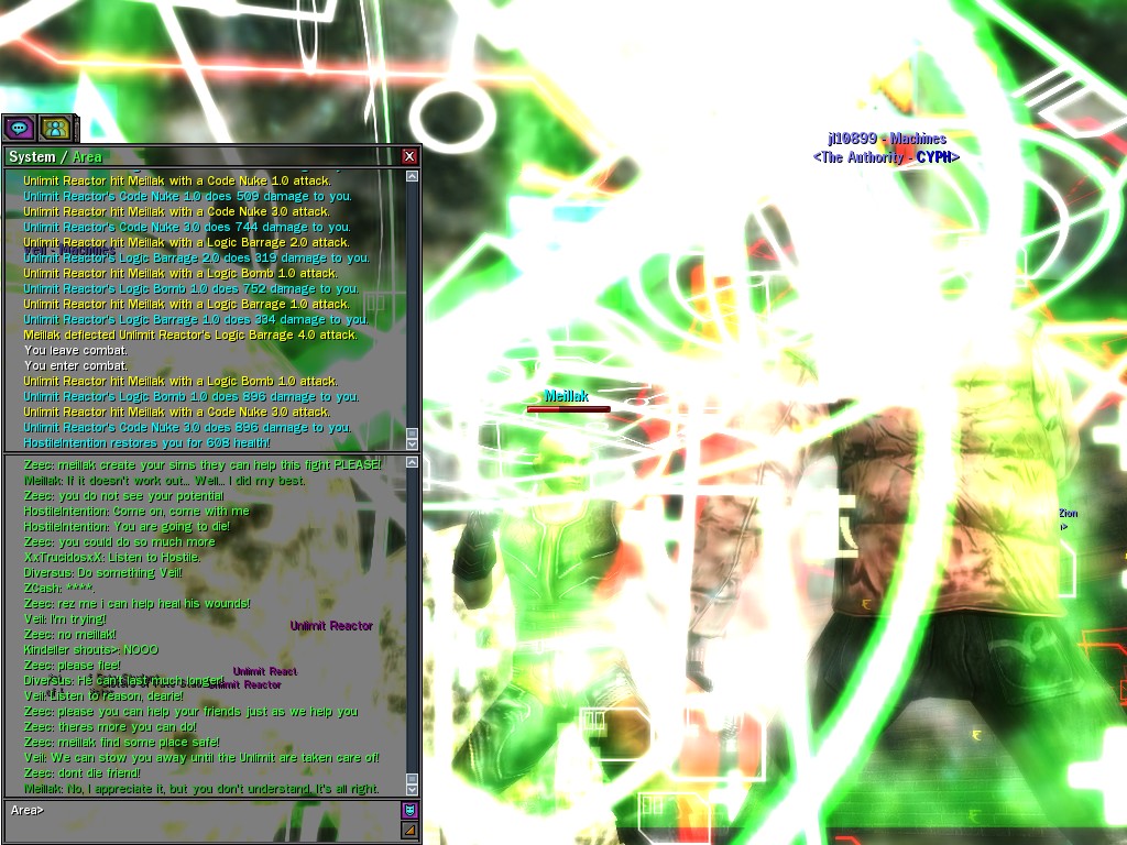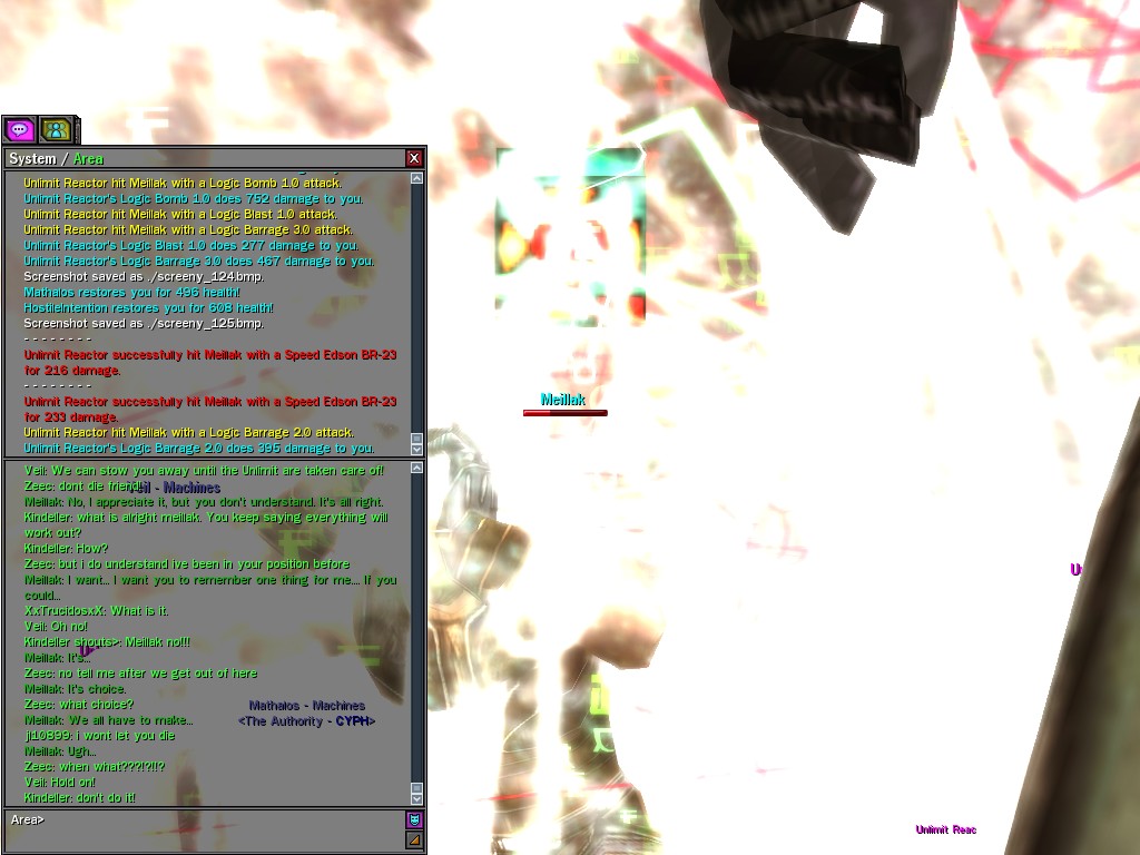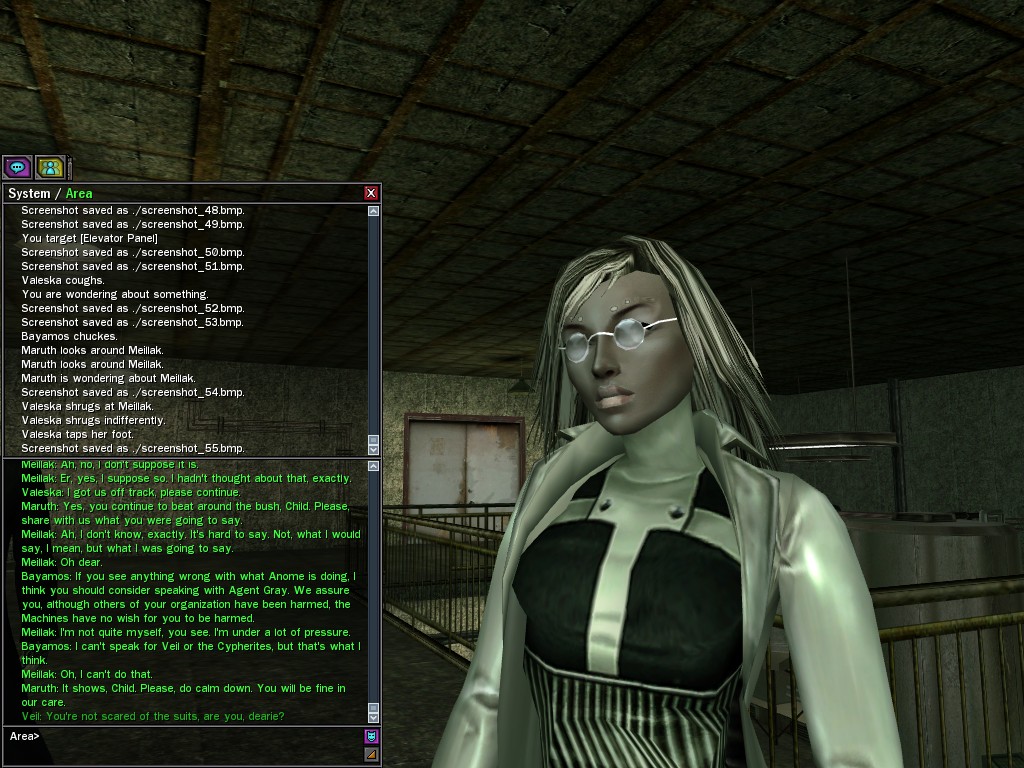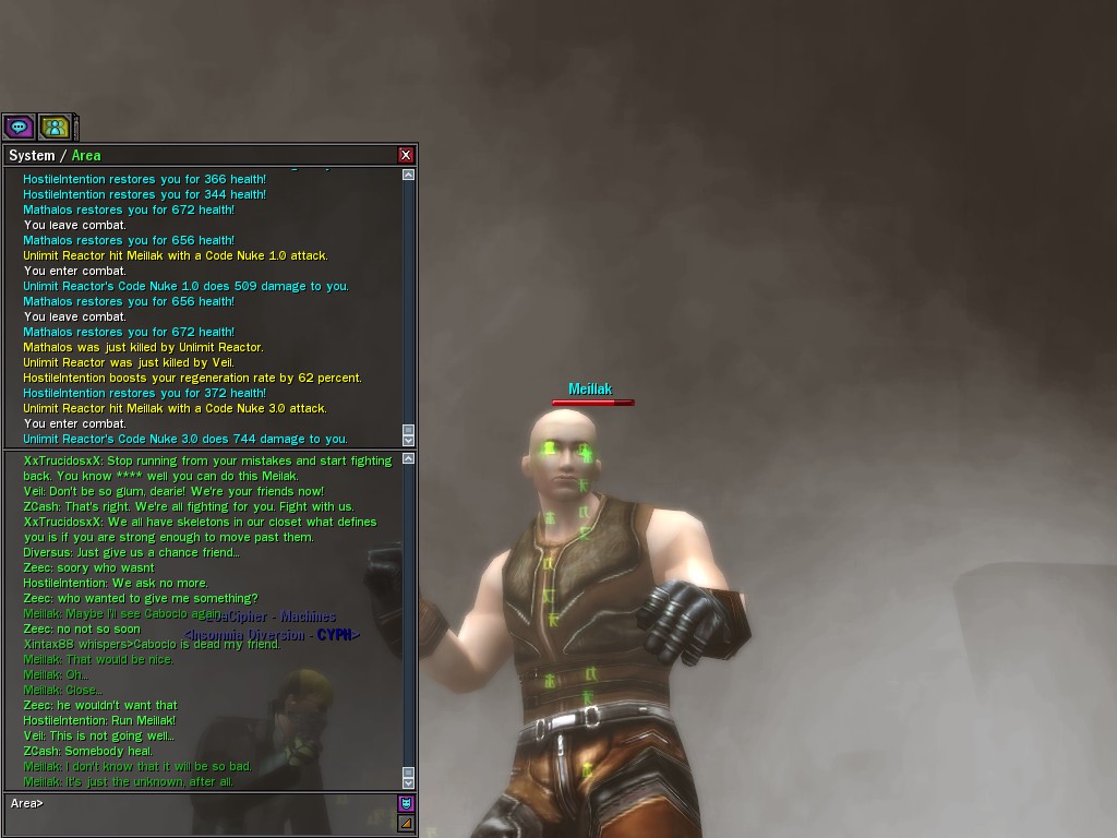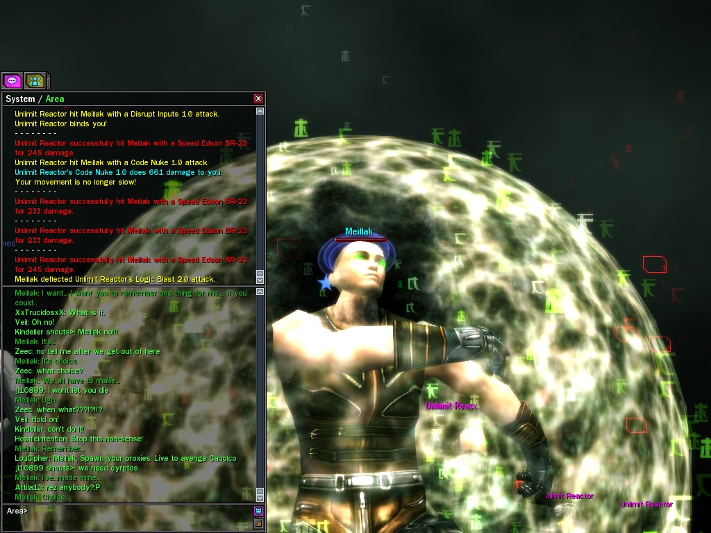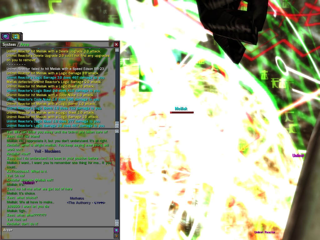 We only met Meillak a few times, but he proved to us that not every member of Unlimit had their mind corrupted along with their body. We didn't know it at first, but there's no question now that Meillak has been helping us fight Anome by giving us pieces of Anome's life before he was awoken--pieces written by Caboclo, Meillak's friend who Anome punished in a terrible way. Eventually, Unlimit figured out what Meillak was up to. I don't think this surprised him. Meillak's hacking of Machine programs--which have hidden, redundant data-gathering routines for just such an occasion--allowed the Machines to track the hacks back to Meillak himself. We intercepted this data and went to meet Meillak first, to try to save him from both Unlimit and the Machines. It didn't work. There was an army of Unlimits right behind us, and Meillak didn't want to go. He sounded...he sounded tired. He said many things that we didn't understand, dearies, about what he thought would happen. He said that the Unlimit were doomed, and would die, and that he would rather go now, at their hands. He seems to have planned it somehow--planned all of this. He said it was his choice, and then, right before the end, he said that we would all have to make a choice...I think. He always was hard to understand. Unlimit killed Meillak, dears, I suppose like he wanted them to. He sacrificed himself... I only hope that the rest of whatever he was planning works out like he wanted. But whatever happens, we won't forget him, will we? Veil