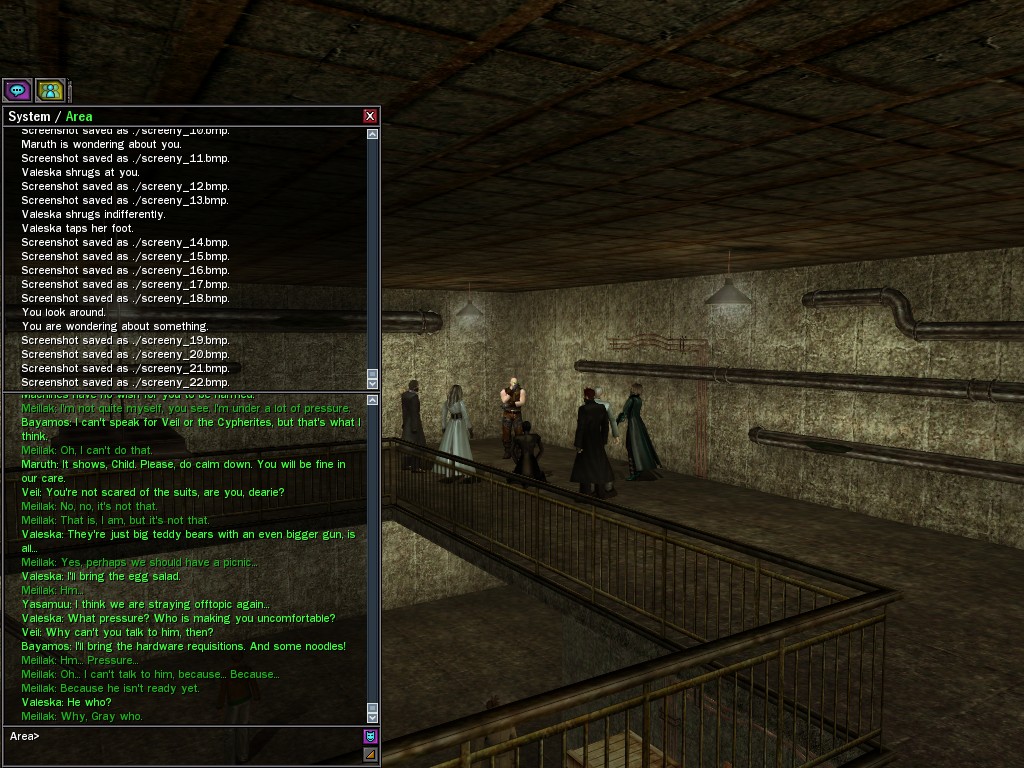 My dears, you'll never guessed who I guessed about: Meillak! Yes, that odd Unlimit that everyone's been talking about, the one dropping Caboclo's snippets about Anome's old life in the land of dreams. I got to thinking about some things he'd said earlier, that didn't seem to make sense, and then something I heard through the grapevine that Gray said to his operatives, about another mysterious message, and next thing you know, Maruth rounds me up some Cypherite-curious Machinists, and there we are having a nice cozy chat with the cryptic eye-dripper down in the bowels of Eber Casino! He talked a lot, but nearly as impenetrably as ever, and he still seemed frightfully agitated, poor thing. It was hard to make out, but it's something to do with Agent Gray, and timing... He has something more to tell us, dears, but he's waiting for something else to happen first, I think. He wants very badly to tell us. Ohh! I'm just dying to know what it is. This is going to keep me up all day, I just know it. xoxo Veil