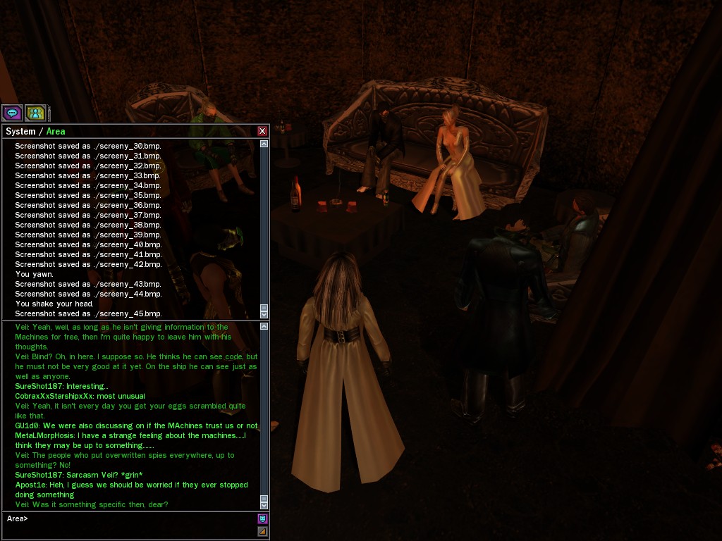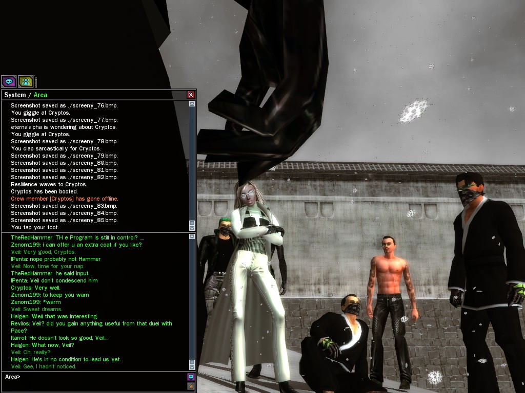 Be darned if we're gonna stand around whistling while those wireframed rats are running their override programs all over the place! We'll get 'em all ourselves if we have to, won't we, dears? xoxox Veil xoxox