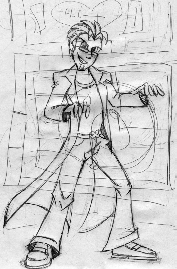 Sketches, all cleaned up and stuff. The finals coming real quick. I think the toughest part is thinking of the poses and the expression to put each person in. Everyone has their own expression for their character, or what they want to be in the Matrix - so that's the most challenging thing. I was re-watching Matrix Re-Loaded to get some screenshots, and I was inspired to use a pose For Mindsweepx:  Mindsweep pulling a "Neo" move. It was a move I saw in Reloaded, where Neo fights the 3 Agents after Smith gstops by that underground meeting to drop off the earpiece. darn ... no eyelasers. He's awesome at fighting s I figured that Neo jump would suit Mindsweepx best. The outfit I had pictures of Mindsweep in was kind of a Neo-ish outfit, so the idea fit.
