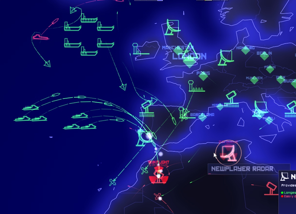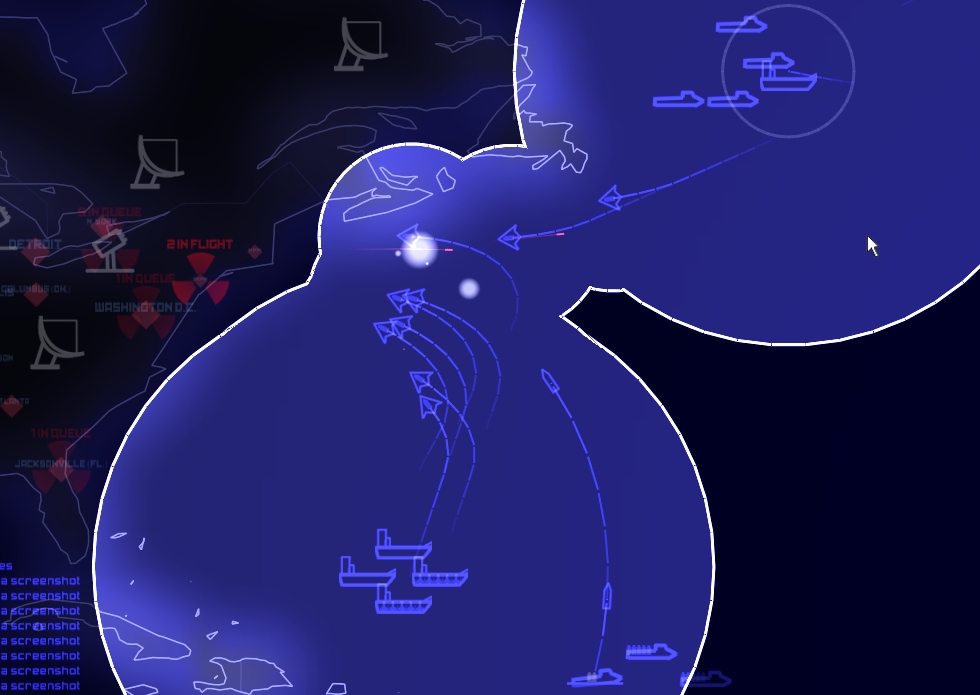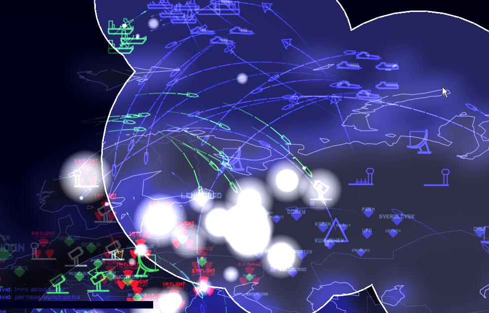 You are going to love this one. Based off the 1983 movie Wargames,        It's a real time Strategy game, up to six sides can play at once. They have chosen to keep the units simple and make it really easy to command your units and launch nasties. The air units consist of Bombers and Fighters. The Boats consist of Carriers, Battleships and Submarines. The land structures you can deploy are Silos, Radars & Airbases. All have a specific purpose. The game play works as Defcon levels, at Defcon 5 and 4 you must place your units and structures, get your boats into place. At Defcon 3 you can launch planes and at Defcon 1 it's possible to launch Nukes (from Silos, Planes or Submarines) Structures: *Silos automatically defend against incoming Planes and Nukes. Putting them into launch mode temporarily disables the defense function. (around 6 can be placed) *Radars give you circular view at the edge or center of your land. Can see strategy possibilities here. (around 6 can be placed, depending on game mode) *Airbases let you launch fighter and bomber planes, these can also be destroyed. Planes can land back at the airbase, provided they have enough fuel. (around 4 can be placed) Units: *Planes have a fuel radius indicated by a blue circle when you select them. This is their fuel estimate. If you don't have enough fuel to land at the airbase you better hope there is an aircraft carrier around. Bombers are slower, have allot of fuel, are good against ground targets and boats. Fighters are quicker, have a short amount of fuel, and are effective against Planes and other targets. *Battleships are mainly for see scuffles, Carriers can launch and re-fuel planes, they also have submarine detection and depth charges. Submarines can't give you radar data but can fire nukes, detected when in fire mode. Population: The other blips you may notice are cities, population is listed for each city, points are scored for eliminating residents with nuke and air strikes. KK where!? You can download and play this game right now, it's around 58mb in size and comes with a Demo mode, only one demo player per war game is permitted. If you like it and plan to do lots of multi player you can register for around 20bux (one time charge). This is a fun game that doesn't take allot of time, it's good for people who don't have time for two MMO's but want a different multi player game. http://www.everybody-dies.com windows, linux, mac. (note, if you have issues goto their forums, router/firewall rules might need to be modified)
