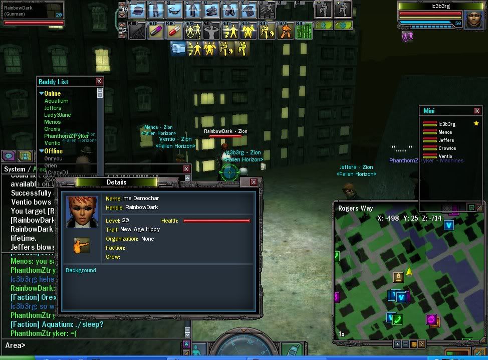I will not be returning once my sub runs out. In the past 2 years during my exodus I came back during the holiday events to see what kinds of changes were made and slowly but surely I noticed the recline in the game start to show. With the announcment from Walrus that the game is going to continue but without any new story content I find that it is now just a big 3d chat room, which is nothing wrong with that but MxO was based off of the fact of a continuing story. I wish to thank Walrus, HCfrog, Dracomat, 9mmfu, Rarebit, and the countless other Devs/GMs/Admins who tried to keep this project alive over the years. I had a good run with the game during the Beta and the first year or so after launch, and the memories will last forever for me. To those who I got to know, way to many people and factions to list, thank you all for your friendship, time, and patience with me. I may not have been good at RP, and even at times I was down right OOC during parties, but I had fun when an event occured or when a member of the LESIG showed up. This last event on the Government building roof had the old feeling of a live event, even if it lasted just 30 mins. Some have a vocal opinion on how things were ran or how they ended up, but I re-subed for the event to show my respect to the final event, to Rarebit, and to the last amount of storyline we were given. I do not know if he did his best, but he did what he did with what he was given to use. To sum it up a bit, Thanks for all the fish. This RP is boring, I quit. Re-invite me back kk. (Leave neo alone thread pwns)