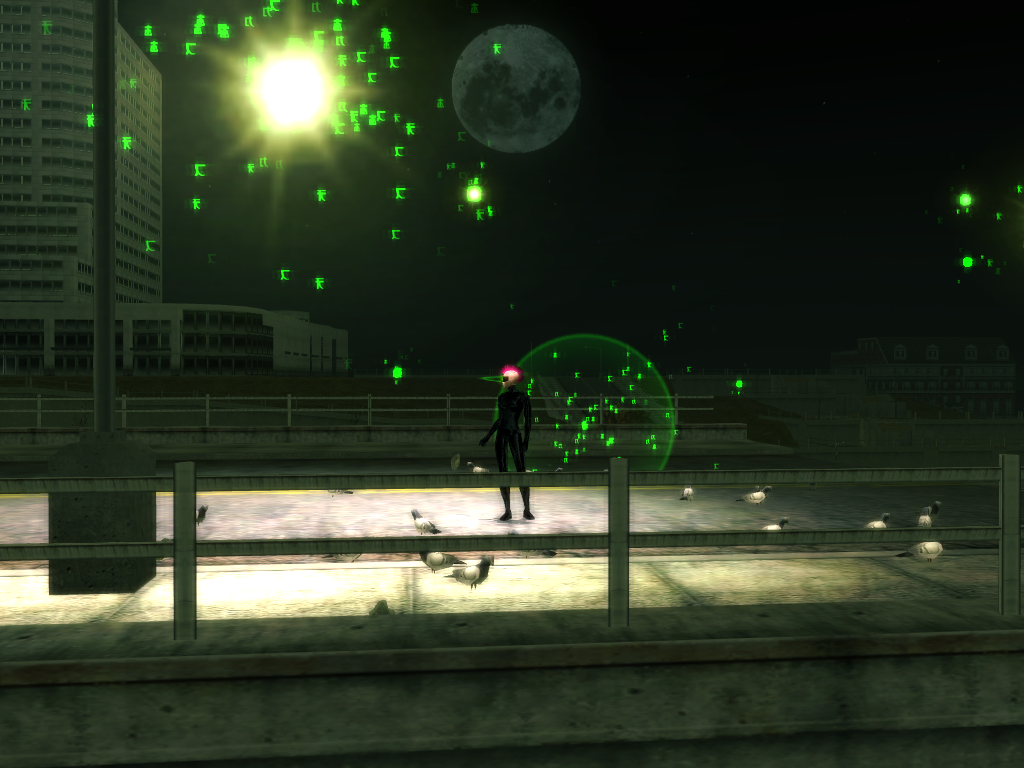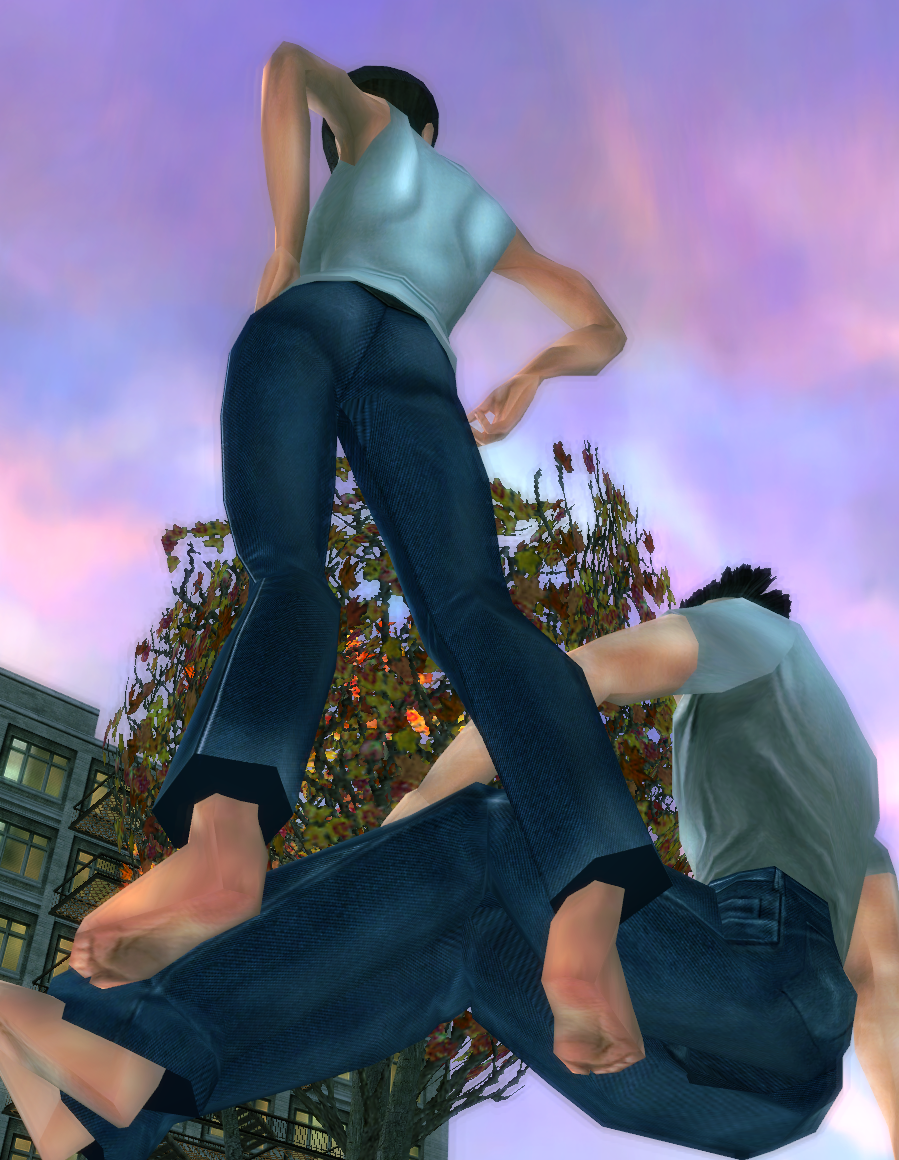 I was asked at the party if I had a favorite screenshot, and I said not really, there are too many, although I mentioned I liked the one I'm currently using for my av/sig, which was from a Syntax Machine event (where Wright killed that woman whose body the BIP was in at Club Koas). But this one above meant a lot to me too, even though it was posed. It was the first I showed of Datamine, I think (note the water is a funny bluish color because I was still running the winter weather), and it took a lot of takes, but I think it kind of captured the excitement I was feeling at the time. And I do like backflipping off things.