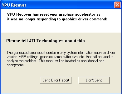 This is something that is graphically nothing to do with MXO as the problem itself but i can tell you its triggered by The Matrix. It has happened before several times and in different places; normally but not restricted to the dungeon's. I can pin point the reccuring spot where my "VPU is forced to do a recovery", i have had this happen in the same spot four times. Note the game doesn't crash it stays open often flicking from a black screen to the game. That said, on the odd occasion it doesn't successfully recover and i lose all Graphic capability (running MXO causes a "Client.dill" problem; graphically connected - i'll post a screen shot of the Warning) Here is the "VPU recover" dialogue box: