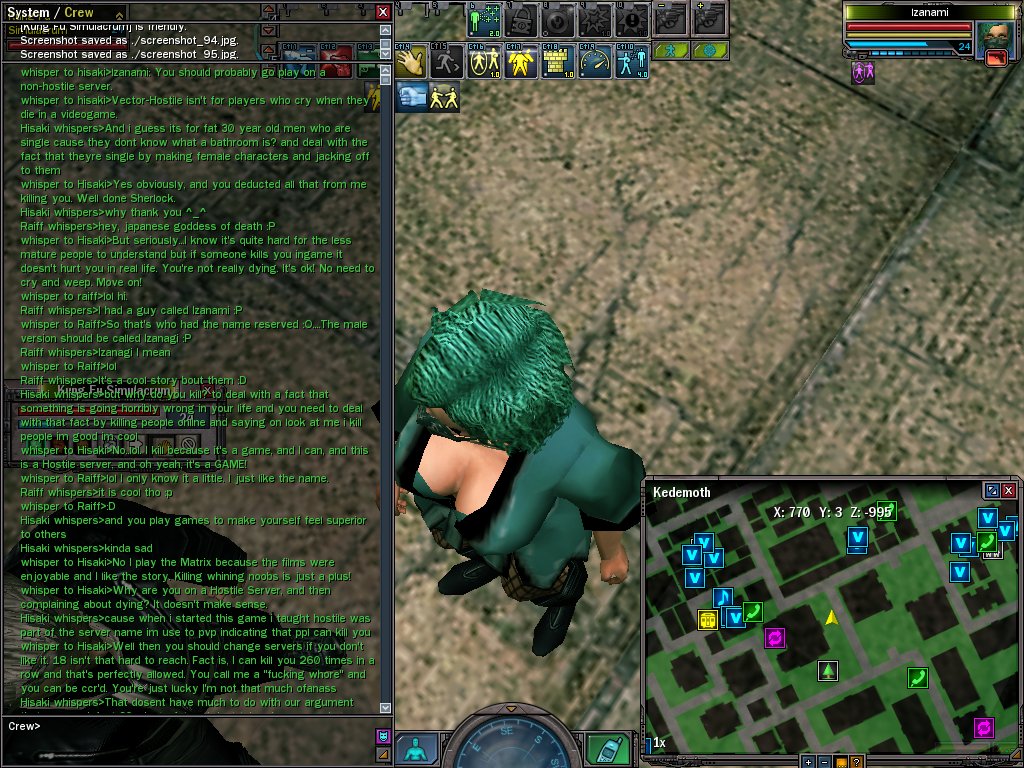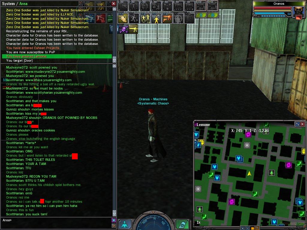 Now you've read that, the back story. 2 Machines enter a Zero One construct to find 7 Zionists, all of one faction (the names say it all). The two machines take out 3 of the Zions before one of them (myself) gets caught and killed by 3 of them. This chat then begins for 10 minutes. We both exchange words. They call me a tam (short for tampon...that may be censored), and various other things. They say they "powned" me. This was before I even opened my mouth. Would gf not hurt? Obviously it would, because they completely disacknowledge that and continue the "pwned talk". They told me to post this, because obviously they're proud of it, and hear it is. I wanted to post it all but the chat had cleared. Now I know I'm not perfect when it comes to crap talking, and I have been known to, but jesus is it no wonder with scum like this around? I used to be friendly, but why the hell should I be when I get this crap? I've honestly said before that if it wasn't for my faction, and this being the only hostile server i'd move. This community has gone to complete and utter crap. I mean what is wrong with some of you people? These people! How can some of you put up with this crap? I don't know how I do it. Maybe it's that i can get revenge on them, and I know they know the truth even if they're too proud to admit it. Now I know one of the replies I get will probably be age...so what? I'm definitely not the oldest on the server, but I don't act this *CENSORED*. Like I said i've been known to crap talk, but never this bad. Earlier today, I was told and shown screens, of a level 50 who I'd killed whilst online saying things about me that did not pertain to the game. They were saying idiotic things like "I have no mother" etc etc. Anyway, I'm not completely sure of the purpose of this thread. Maybe it's to vent. Maybe it's because I want some people's true opinions on this sort of disgusting attitude. Should I have ccr'd them? I don't know maybe I should, but they should atleast be allowed a chance to grow the hell up. Now one more thing before I end the post, because I had this problem with the last thread. It is NOT an attack on an Organisation. It is NOT saying that only one org zergs, or behaves like this etc etc, because it isn't the case. It is NOT an attack on individual people. It IS me wanting to know people's opinion on this sort of disrespect.