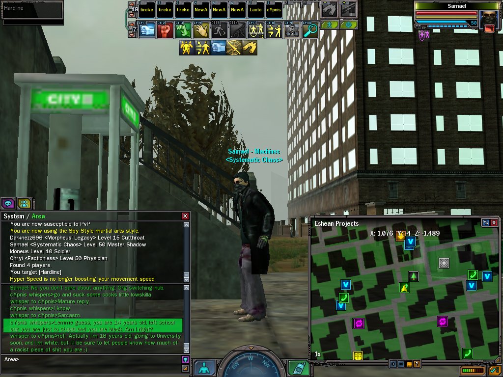 So I go to Mara, which is the village bicycle of PvP, and begin to fight. I end up getting tag teamed by a Zion and a Merv while a former-factionmate just watches, and rezzes them each time they die, and a lowbie in another Machine faction insults me. Then the reds, each of which I killed, insult me too. I know I'm just going to get flamed, but hell I felt like venting.