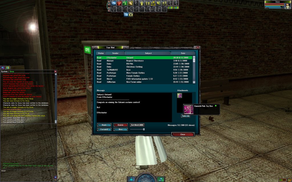 I know alot of factions do inter-faction RP like the Trust, Family Grigori, Merovech INC etc. and thats cool and groovy and all but leaves out alot of people who aren't in RP factions, new players who wanna RP and don't know where to begin as well as possibly hindering some of the stories (e.g wars between a group of zion's and machines, merv's helping out EPN or whatever). So i'm asking if anyone is interested in putting together some sort of list or means of communication between people of diff orgs, factions, timezones who wanna get involved in some way, if even slightly with any kind of RP/RPVP as well as oppening up possibilities with storylines, casual events etc. (I know there is groups that create complicated well planned out events that pop up now and then, but it would be good to be able to throw something together one day and be doing it the next, or the same day. Some casual RP to give people something to do, rather than sitting around doing nothing). Now i have no real experience with RP stories etc, apart from occasionaly participating in a bit here and there, but i did enjoy when Warriors Of Valor would have a faction storyline RP day and would invite people to particpate (one week i was an evil machine assassin, the next a bunch of us where merv operatives out to steal data from them resulting in a big pvp battle outside club sanguine) and even today, while thinking about writing this standing at an empty camon c and saying 'i wish something would happen here again', Tranque magically appeared and very cryptically said he was sure something would - cut to me suddenly getting a call from a 'ZionController' and spending the next hour or so trying to awaken a bluepill (which probably by an experienced RPer's standards could be considered the worst awakening ever (due in no part to the strange guy with no shirt on at the extraction site and the hoover-a-tron)). The fact that i was there bored and Tranque put on a little event to amuse me, and hopefully him too, shows that people like participating in these kinda things still. So to sum up, i don't literally want to bring everyone back to Camon C, but just create a means to get people interacting with others the way they used to, and some way of letting everyone know who would all be up for this sort of thing, even if it's just to play exile number 3 for ten minutes, get killed and go back to datamining or whatever  So, opinions? Anyone think it's a rubbish idea? Know of a good way to implement such a thing? Like sandwiches? (Let's hope someone at least posts a response...that would be embarrassing if this thread just died )