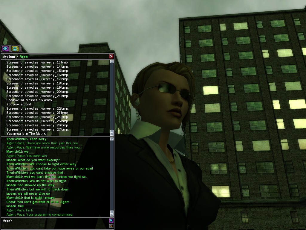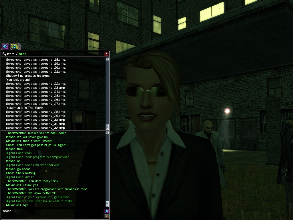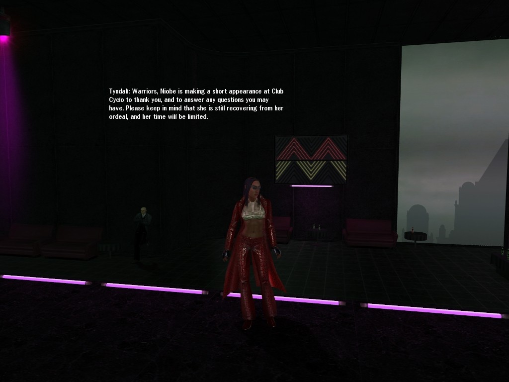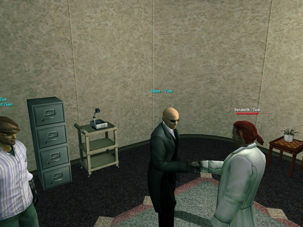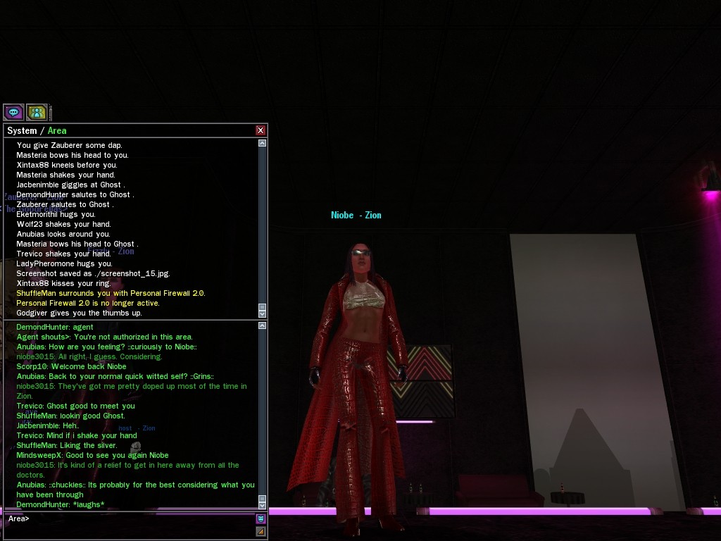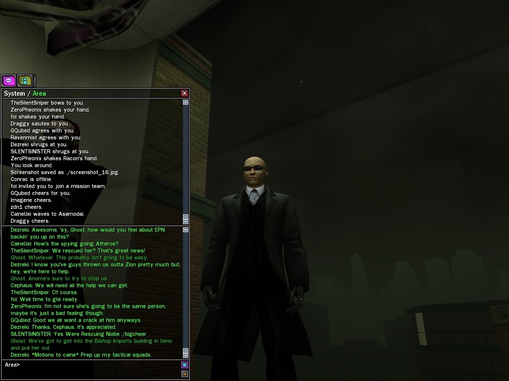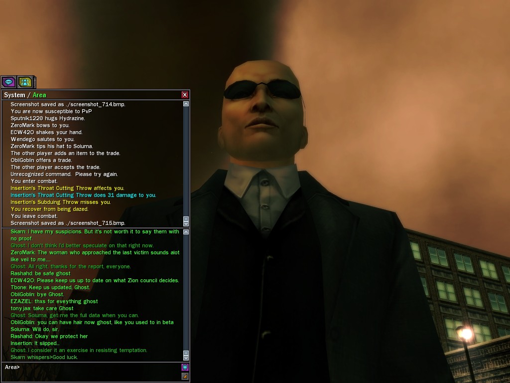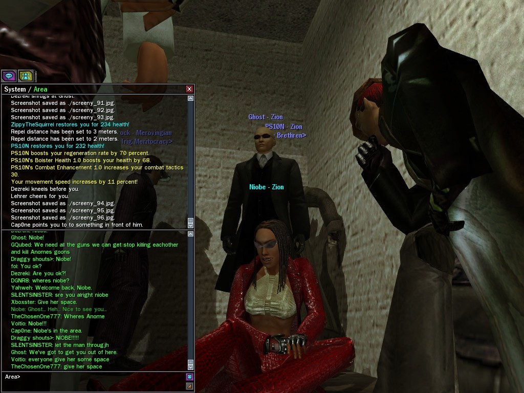 Niobe is back in Zion. It took a lot of hard work over these past weeks from our operatives, and from operatives working for the Merovingian, who decided to help us for reasons of his own. His man, the Effectuator, while sometimes maddeningly irritating, nevertheless was able to track down the construct in which Anome had imprisoned Niobe, after operatives aided him by tracking down network junctions, and clearing Anome's people out of the way. On Friday, with the final network trace made, and Niobe's location pinned down, we stormed Bishop Imports--the site of Anome's treachery, and her disappearance--to pull her back into our simulation. Anome's men had sealed off the upper floors, requiring teams of operatives to free specific hardlines from his control in Bathary Row and Chelsea, so that the Effectuator could gain the necessary network access to disable these blockades. Still, with teams working simultaneously in Bathary, Chelsea, and Ueno, we were able to overcome Anome's forces, and finally, near the top of Bishop Imports, pull Niobe out of her prison. She was desperately weak from her wounds and long imprisonment, and even her body in Zion had suffered due to its extended period of inactivity. But with the help of those around her, she somehow found the strength to stand, get to the rooftop, and jack out once the doctors had cleared her. She hasn't said much since she's been back. She's still weak, but resting, and getting stronger day by day. I think this ordeal has worked some changes on her--for better or for worse, I don't know. People who say "what doesn't kill you only makes you stronger" have never been in a war. But if anyone can come back stronger than ever after something like this, it's Niobe. The doctors aren't sure what lasting effect, if any, the cheat code she drank will have on her. They say it kept her alive, but it didn't prevent her from jacking out, as it has Anome's lieutenants. It didn't give her any obvious powers, either. There's a theory going around, I think started by Machine operatives, that the cheat codes mutated after Anome got his hands on them, or that he changed them himself, somehow. I don't know about any of that. I do know that with the captain back, Anome's days are numbered. If I know Niobe, she's going to want a little payback for what he did to her, and what he's done to the Matrix. I've spoken to some operatives who wished they'd been able to participate in the Ueno operation. I tell them not to worry; there's going to be more than enough action for everyone before this is over.