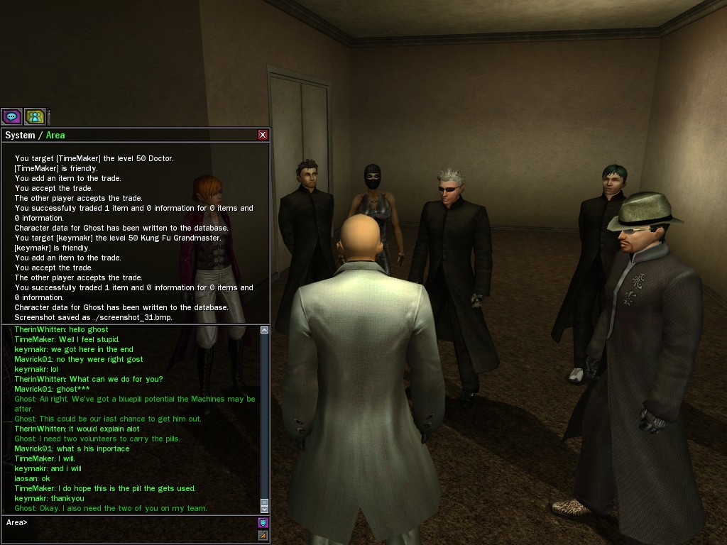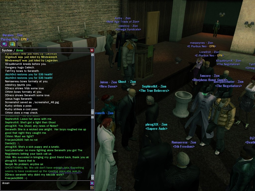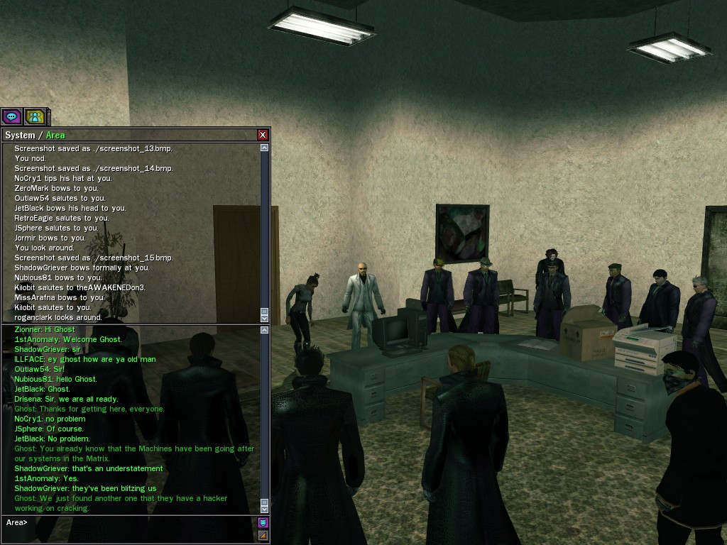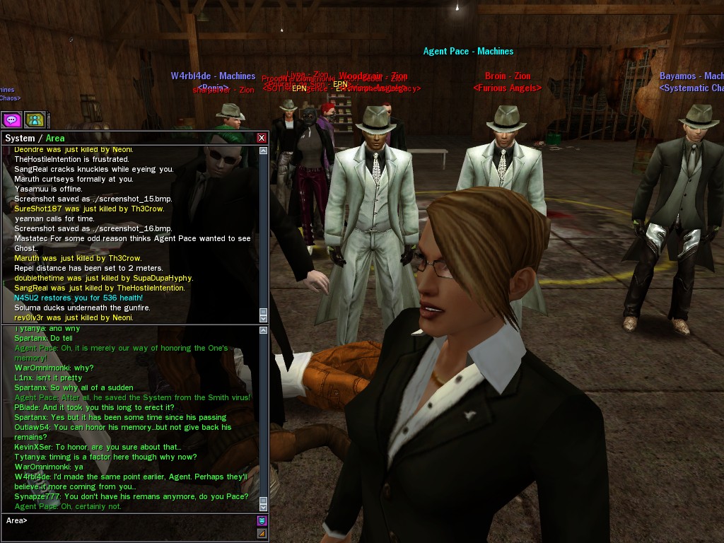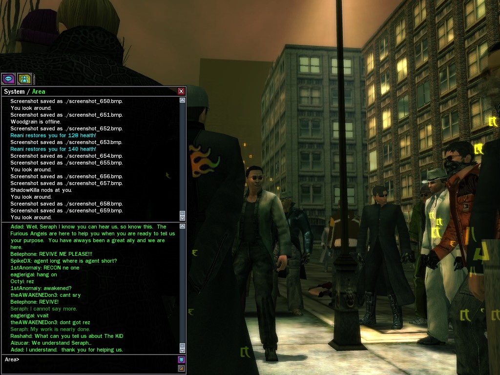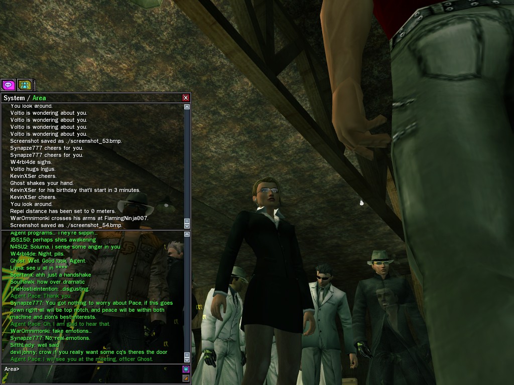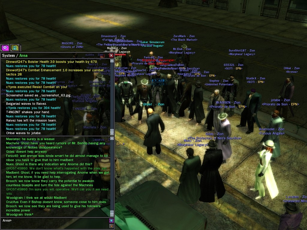 Niobe is back in Zion. It took a lot of hard work over these past weeks from our operatives, and from operatives working for the Merovingian, who decided to help us for reasons of his own. His man, the Effectuator, while sometimes maddeningly irritating, nevertheless was able to track down the construct in which Anome had imprisoned Niobe, after operatives aided him by tracking down network junctions, and clearing Anome's people out of the way. On Friday, with the final network trace made, and Niobe's location pinned down, we stormed Bishop Imports--the site of Anome's treachery, and her disappearance--to pull her back into our simulation. Anome's men had sealed off the upper floors, requiring teams of operatives to free specific hardlines from his control in Bathary Row and Chelsea, so that the Effectuator could gain the necessary network access to disable these blockades. Still, with teams working simultaneously in Bathary, Chelsea, and Ueno, we were able to overcome Anome's forces, and finally, near the top of Bishop Imports, pull Niobe out of her prison. She was desperately weak from her wounds and long imprisonment, and even her body in Zion had suffered due to its extended period of inactivity. But with the help of those around her, she somehow found the strength to stand, get to the rooftop, and jack out once the doctors had cleared her. She hasn't said much since she's been back. She's still weak, but resting, and getting stronger day by day. I think this ordeal has worked some changes on her--for better or for worse, I don't know. People who say "what doesn't kill you only makes you stronger" have never been in a war. But if anyone can come back stronger than ever after something like this, it's Niobe. The doctors aren't sure what lasting effect, if any, the cheat code she drank will have on her. They say it kept her alive, but it didn't prevent her from jacking out, as it has Anome's lieutenants. It didn't give her any obvious powers, either. There's a theory going around, I think started by Machine operatives, that the cheat codes mutated after Anome got his hands on them, or that he changed them himself, somehow. I don't know about any of that. I do know that with the captain back, Anome's days are numbered. If I know Niobe, she's going to want a little payback for what he did to her, and what he's done to the Matrix. I've spoken to some operatives who wished they'd been able to participate in the Ueno operation. I tell them not to worry; there's going to be more than enough action for everyone before this is over.
