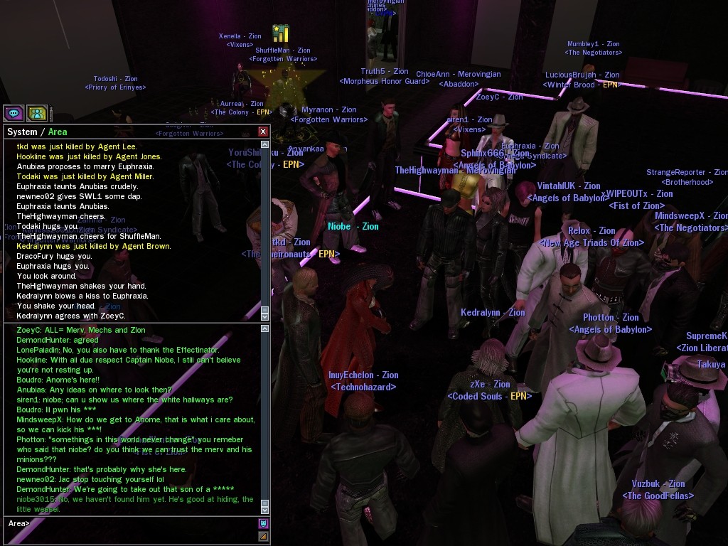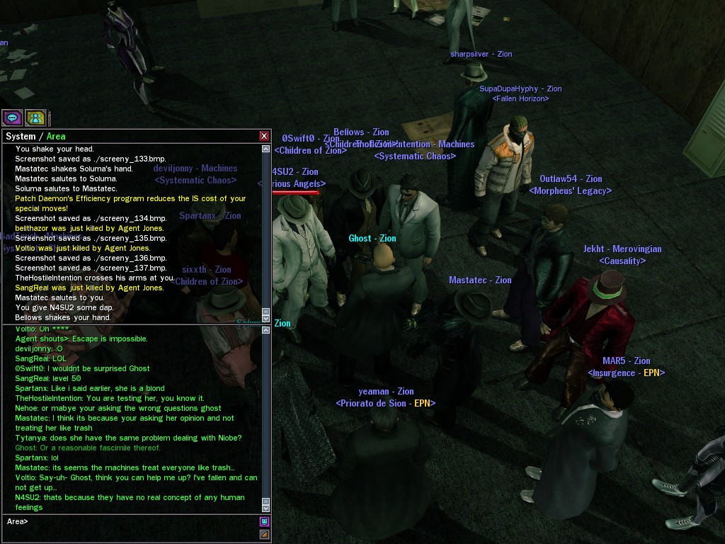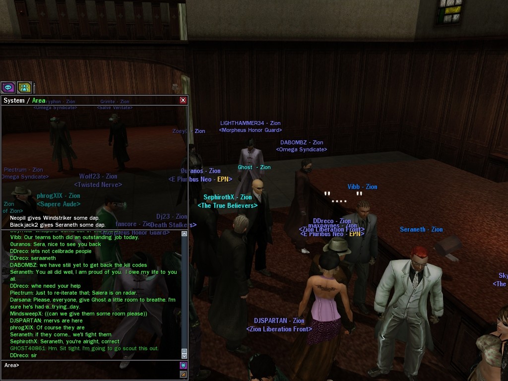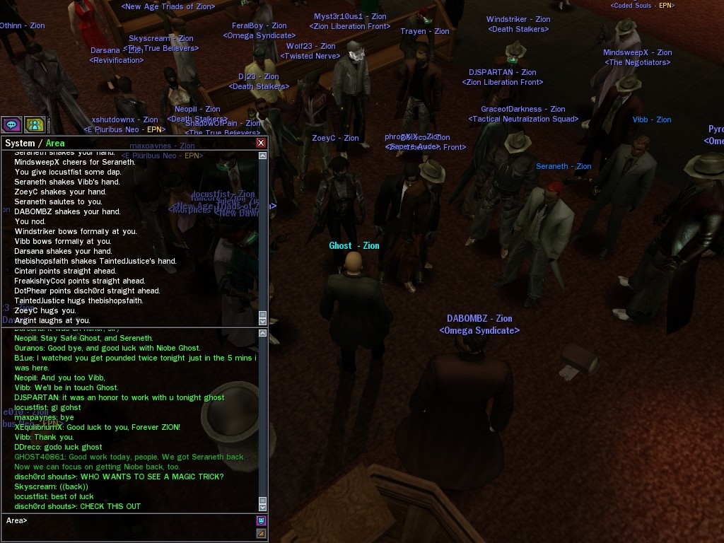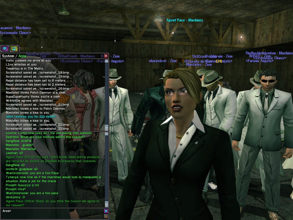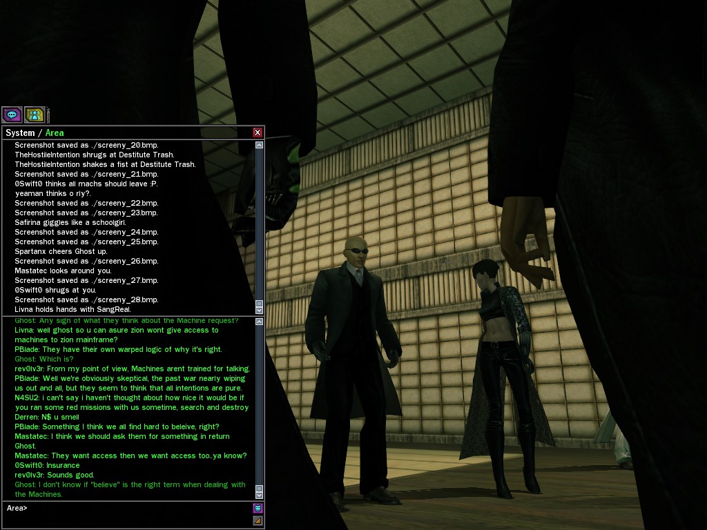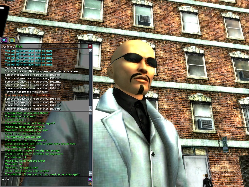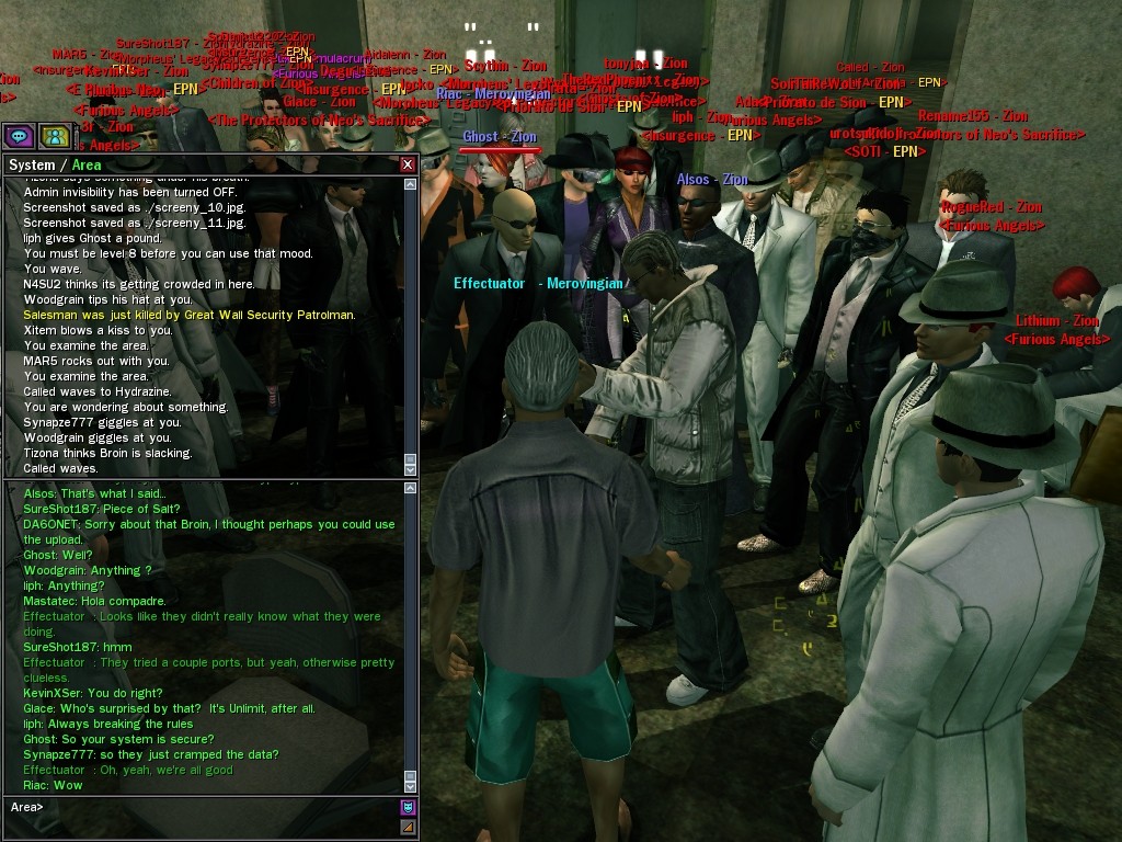 Niobe is back in Zion. It took a lot of hard work over these past weeks from our operatives, and from operatives working for the Merovingian, who decided to help us for reasons of his own. His man, the Effectuator, while sometimes maddeningly irritating, nevertheless was able to track down the construct in which Anome had imprisoned Niobe, after operatives aided him by tracking down network junctions, and clearing Anome's people out of the way. On Friday, with the final network trace made, and Niobe's location pinned down, we stormed Bishop Imports--the site of Anome's treachery, and her disappearance--to pull her back into our simulation. Anome's men had sealed off the upper floors, requiring teams of operatives to free specific hardlines from his control in Bathary Row and Chelsea, so that the Effectuator could gain the necessary network access to disable these blockades. Still, with teams working simultaneously in Bathary, Chelsea, and Ueno, we were able to overcome Anome's forces, and finally, near the top of Bishop Imports, pull Niobe out of her prison. She was desperately weak from her wounds and long imprisonment, and even her body in Zion had suffered due to its extended period of inactivity. But with the help of those around her, she somehow found the strength to stand, get to the rooftop, and jack out once the doctors had cleared her. She hasn't said much since she's been back. She's still weak, but resting, and getting stronger day by day. I think this ordeal has worked some changes on her--for better or for worse, I don't know. People who say "what doesn't kill you only makes you stronger" have never been in a war. But if anyone can come back stronger than ever after something like this, it's Niobe. The doctors aren't sure what lasting effect, if any, the cheat code she drank will have on her. They say it kept her alive, but it didn't prevent her from jacking out, as it has Anome's lieutenants. It didn't give her any obvious powers, either. There's a theory going around, I think started by Machine operatives, that the cheat codes mutated after Anome got his hands on them, or that he changed them himself, somehow. I don't know about any of that. I do know that with the captain back, Anome's days are numbered. If I know Niobe, she's going to want a little payback for what he did to her, and what he's done to the Matrix. I've spoken to some operatives who wished they'd been able to participate in the Ueno operation. I tell them not to worry; there's going to be more than enough action for everyone before this is over.