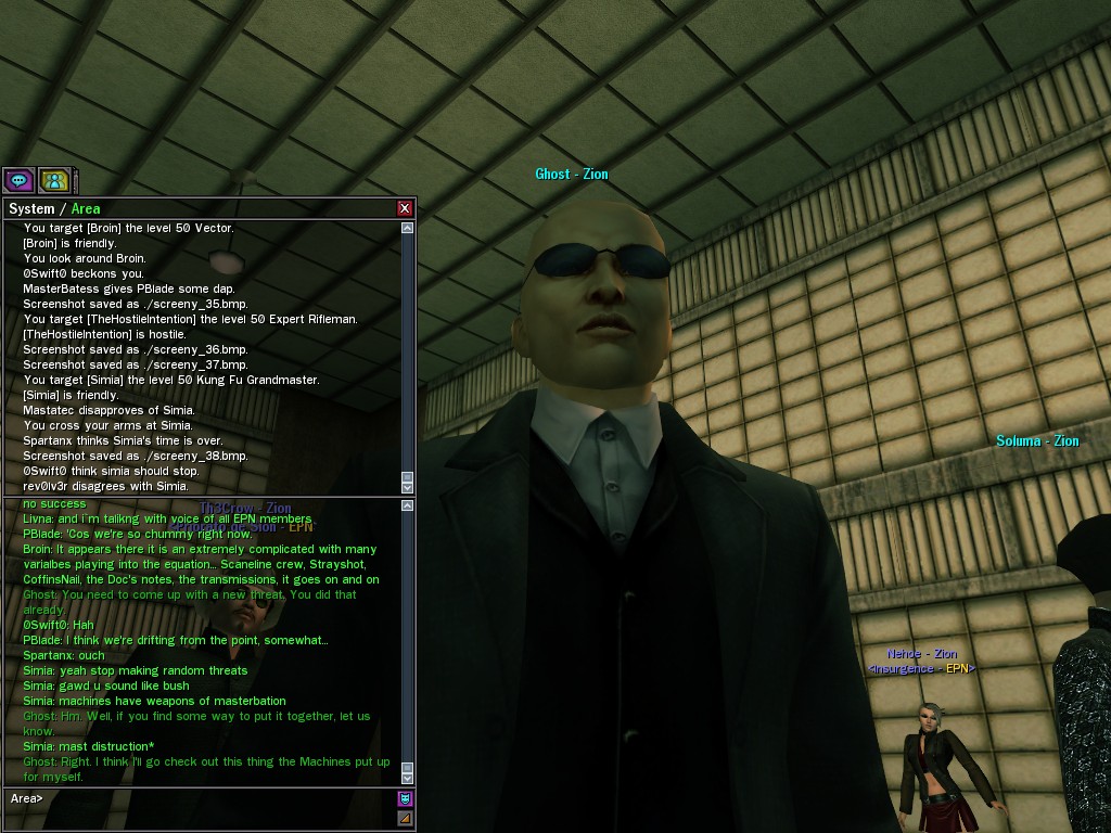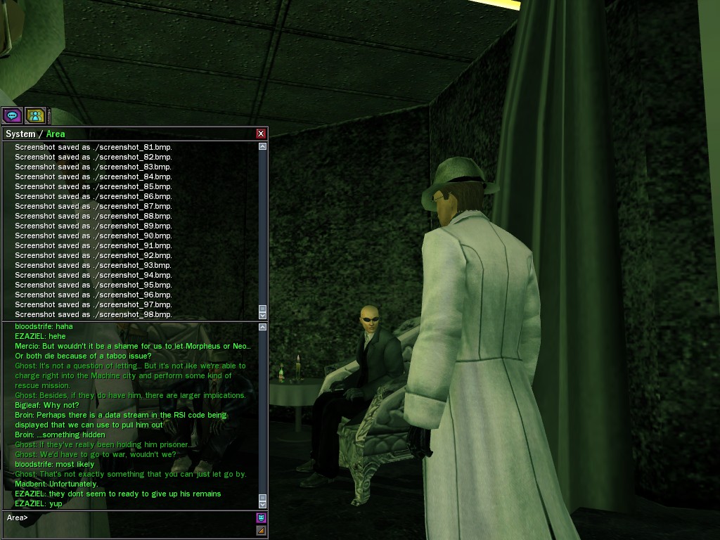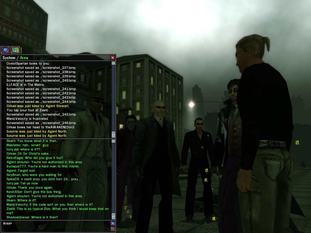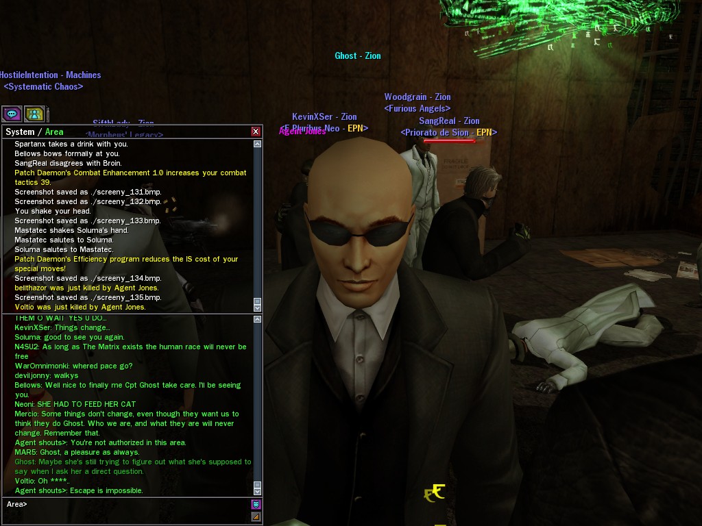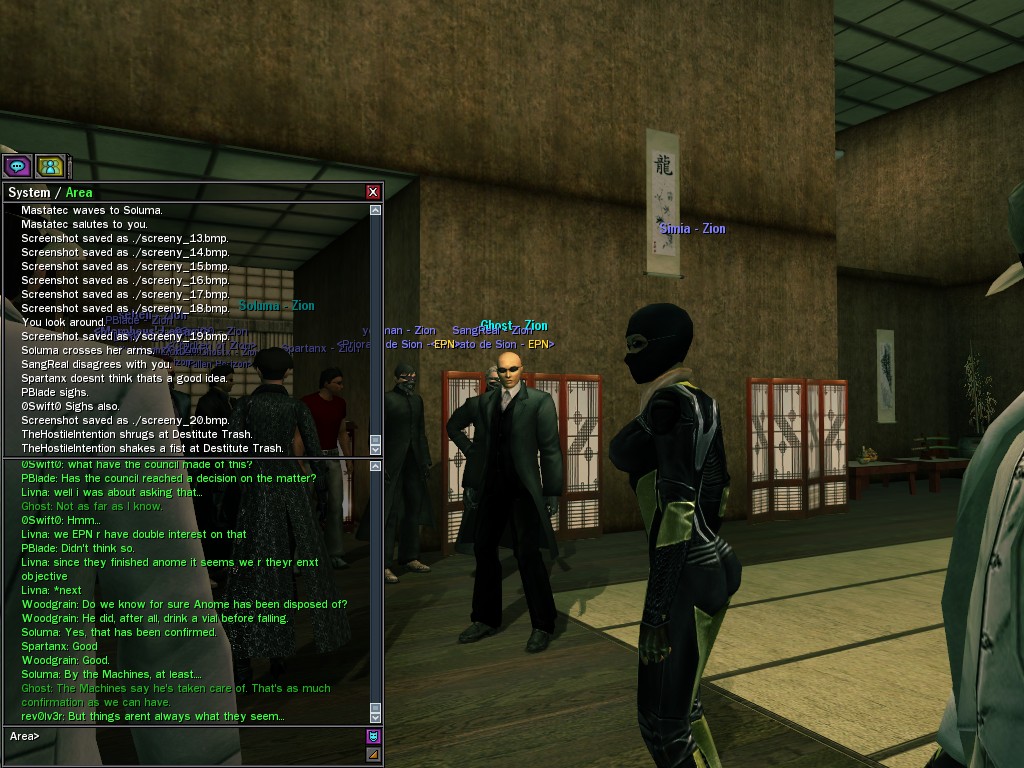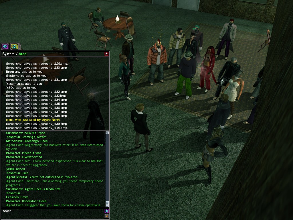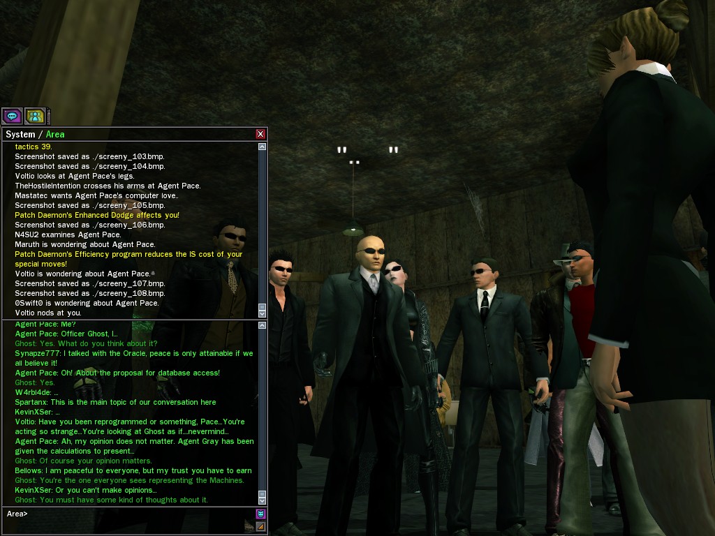 Niobe is back in Zion. It took a lot of hard work over these past weeks from our operatives, and from operatives working for the Merovingian, who decided to help us for reasons of his own. His man, the Effectuator, while sometimes maddeningly irritating, nevertheless was able to track down the construct in which Anome had imprisoned Niobe, after operatives aided him by tracking down network junctions, and clearing Anome's people out of the way. On Friday, with the final network trace made, and Niobe's location pinned down, we stormed Bishop Imports--the site of Anome's treachery, and her disappearance--to pull her back into our simulation. Anome's men had sealed off the upper floors, requiring teams of operatives to free specific hardlines from his control in Bathary Row and Chelsea, so that the Effectuator could gain the necessary network access to disable these blockades. Still, with teams working simultaneously in Bathary, Chelsea, and Ueno, we were able to overcome Anome's forces, and finally, near the top of Bishop Imports, pull Niobe out of her prison. She was desperately weak from her wounds and long imprisonment, and even her body in Zion had suffered due to its extended period of inactivity. But with the help of those around her, she somehow found the strength to stand, get to the rooftop, and jack out once the doctors had cleared her. She hasn't said much since she's been back. She's still weak, but resting, and getting stronger day by day. I think this ordeal has worked some changes on her--for better or for worse, I don't know. People who say "what doesn't kill you only makes you stronger" have never been in a war. But if anyone can come back stronger than ever after something like this, it's Niobe. The doctors aren't sure what lasting effect, if any, the cheat code she drank will have on her. They say it kept her alive, but it didn't prevent her from jacking out, as it has Anome's lieutenants. It didn't give her any obvious powers, either. There's a theory going around, I think started by Machine operatives, that the cheat codes mutated after Anome got his hands on them, or that he changed them himself, somehow. I don't know about any of that. I do know that with the captain back, Anome's days are numbered. If I know Niobe, she's going to want a little payback for what he did to her, and what he's done to the Matrix. I've spoken to some operatives who wished they'd been able to participate in the Ueno operation. I tell them not to worry; there's going to be more than enough action for everyone before this is over.