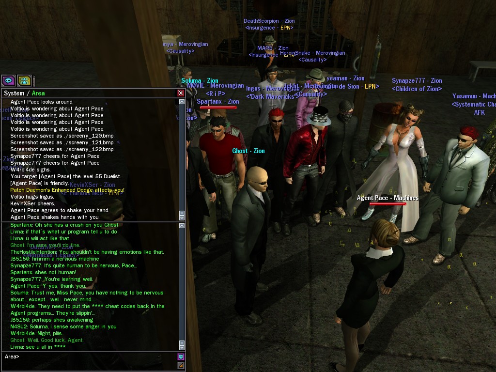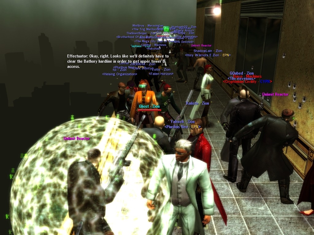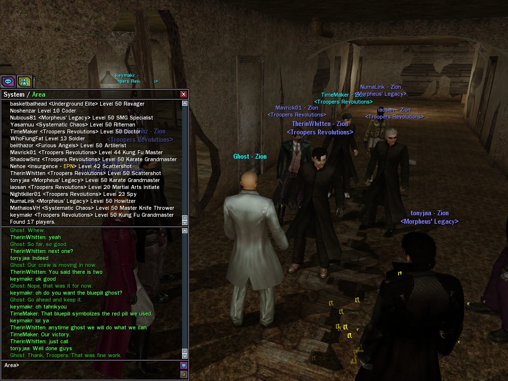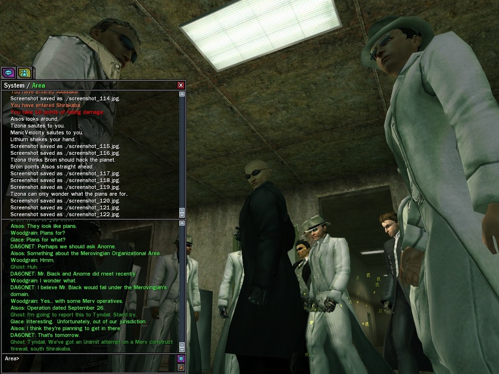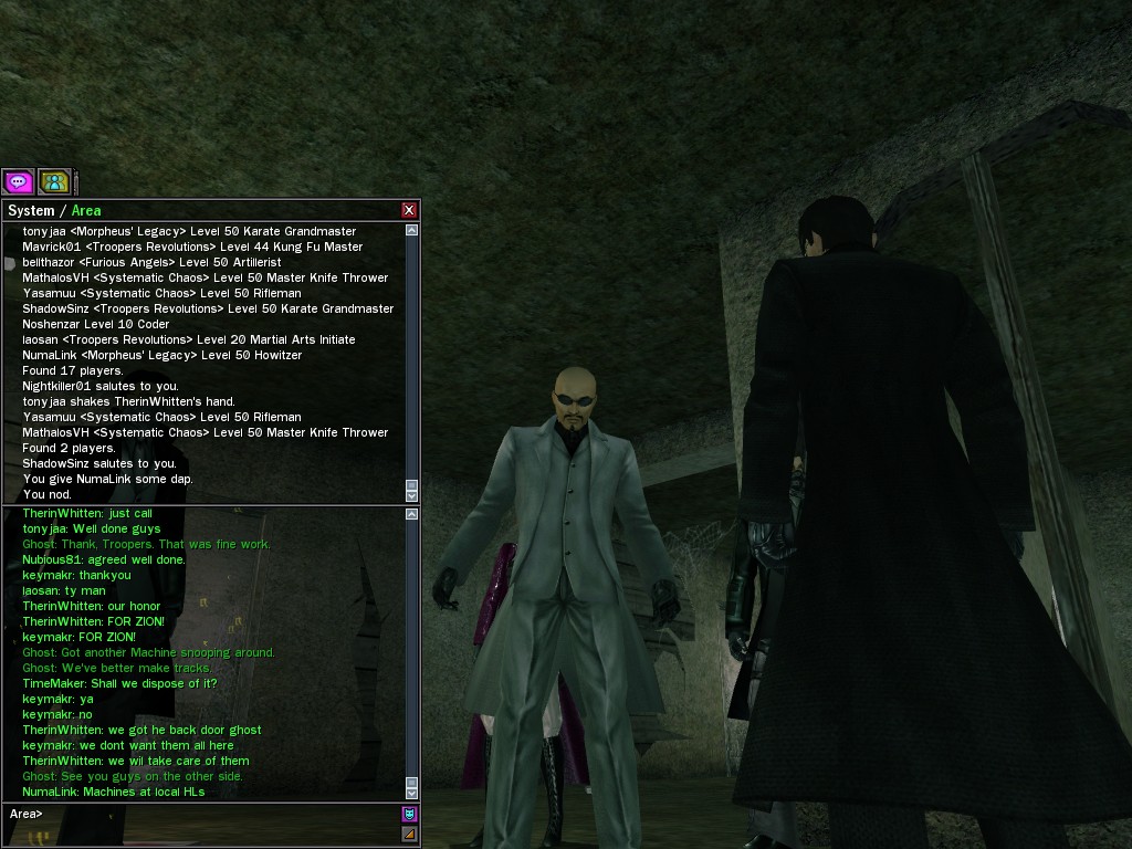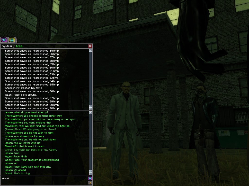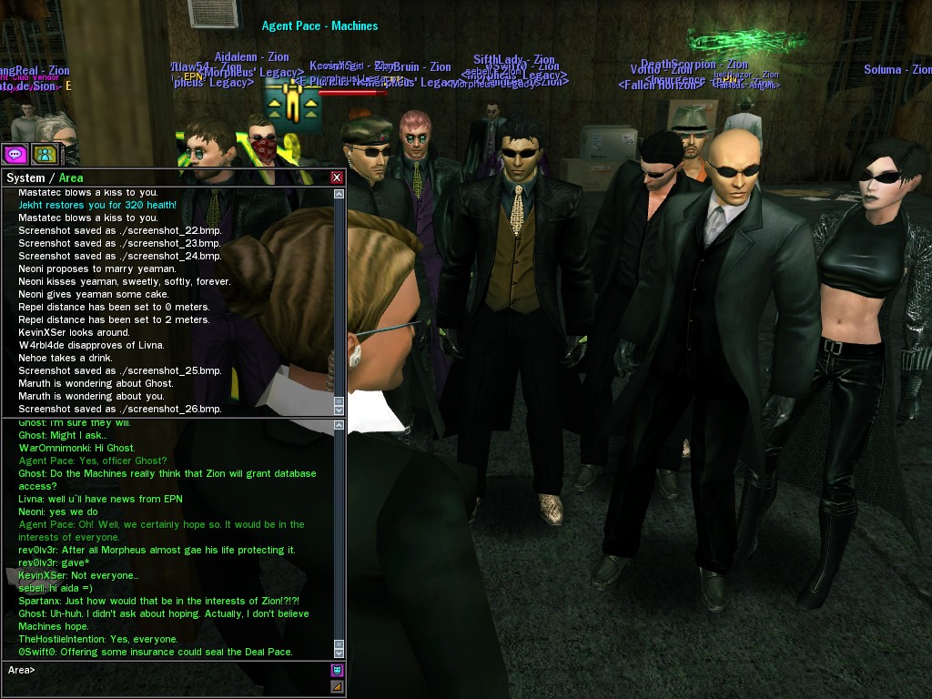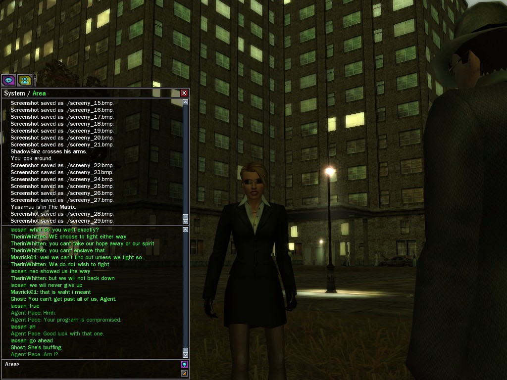 Niobe is back in Zion. It took a lot of hard work over these past weeks from our operatives, and from operatives working for the Merovingian, who decided to help us for reasons of his own. His man, the Effectuator, while sometimes maddeningly irritating, nevertheless was able to track down the construct in which Anome had imprisoned Niobe, after operatives aided him by tracking down network junctions, and clearing Anome's people out of the way. On Friday, with the final network trace made, and Niobe's location pinned down, we stormed Bishop Imports--the site of Anome's treachery, and her disappearance--to pull her back into our simulation. Anome's men had sealed off the upper floors, requiring teams of operatives to free specific hardlines from his control in Bathary Row and Chelsea, so that the Effectuator could gain the necessary network access to disable these blockades. Still, with teams working simultaneously in Bathary, Chelsea, and Ueno, we were able to overcome Anome's forces, and finally, near the top of Bishop Imports, pull Niobe out of her prison. She was desperately weak from her wounds and long imprisonment, and even her body in Zion had suffered due to its extended period of inactivity. But with the help of those around her, she somehow found the strength to stand, get to the rooftop, and jack out once the doctors had cleared her. She hasn't said much since she's been back. She's still weak, but resting, and getting stronger day by day. I think this ordeal has worked some changes on her--for better or for worse, I don't know. People who say "what doesn't kill you only makes you stronger" have never been in a war. But if anyone can come back stronger than ever after something like this, it's Niobe. The doctors aren't sure what lasting effect, if any, the cheat code she drank will have on her. They say it kept her alive, but it didn't prevent her from jacking out, as it has Anome's lieutenants. It didn't give her any obvious powers, either. There's a theory going around, I think started by Machine operatives, that the cheat codes mutated after Anome got his hands on them, or that he changed them himself, somehow. I don't know about any of that. I do know that with the captain back, Anome's days are numbered. If I know Niobe, she's going to want a little payback for what he did to her, and what he's done to the Matrix. I've spoken to some operatives who wished they'd been able to participate in the Ueno operation. I tell them not to worry; there's going to be more than enough action for everyone before this is over.
