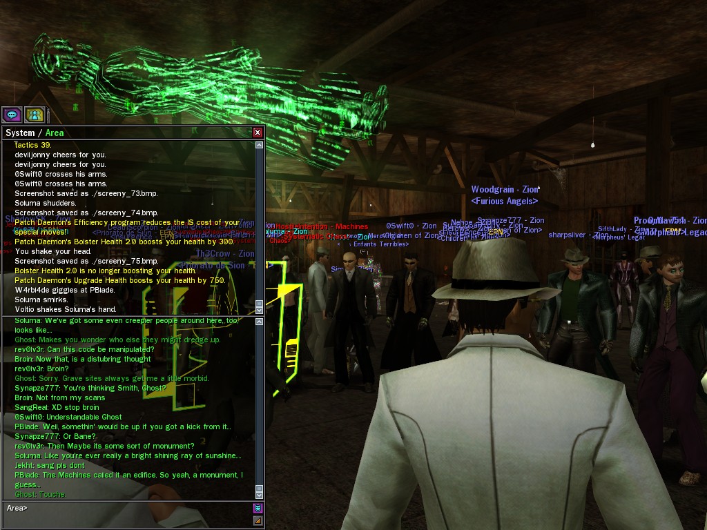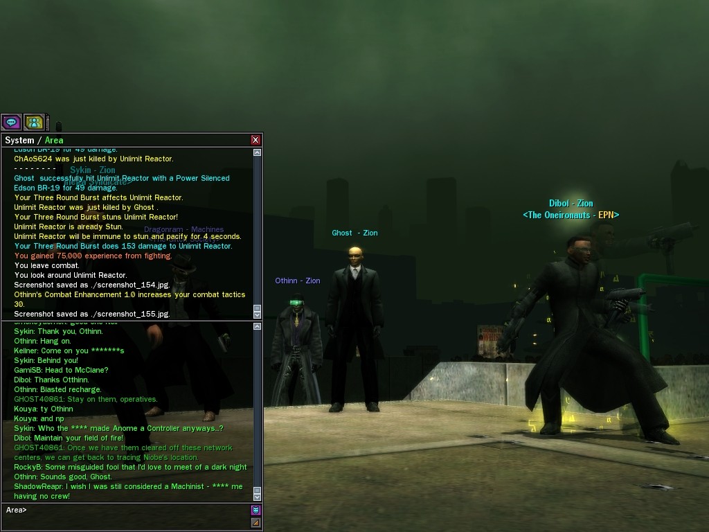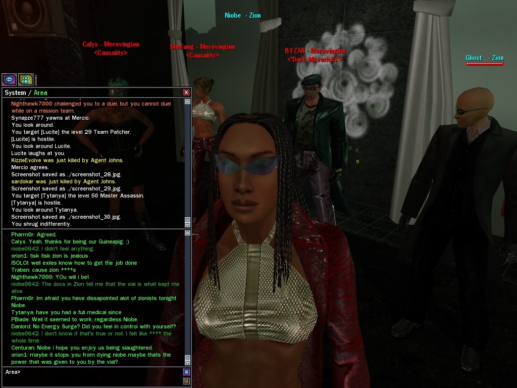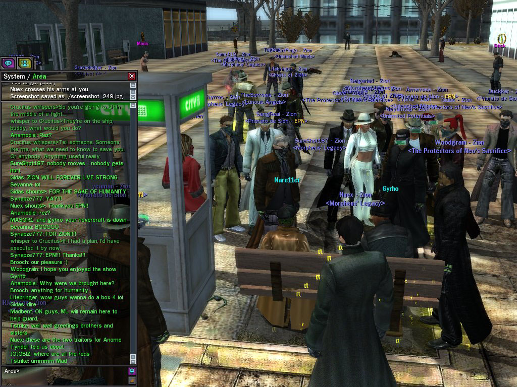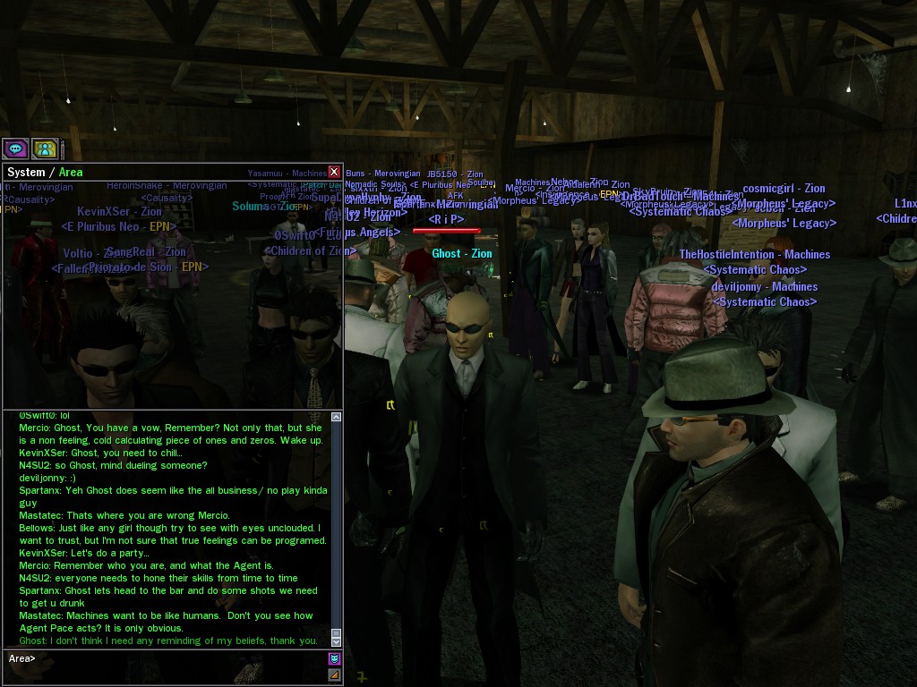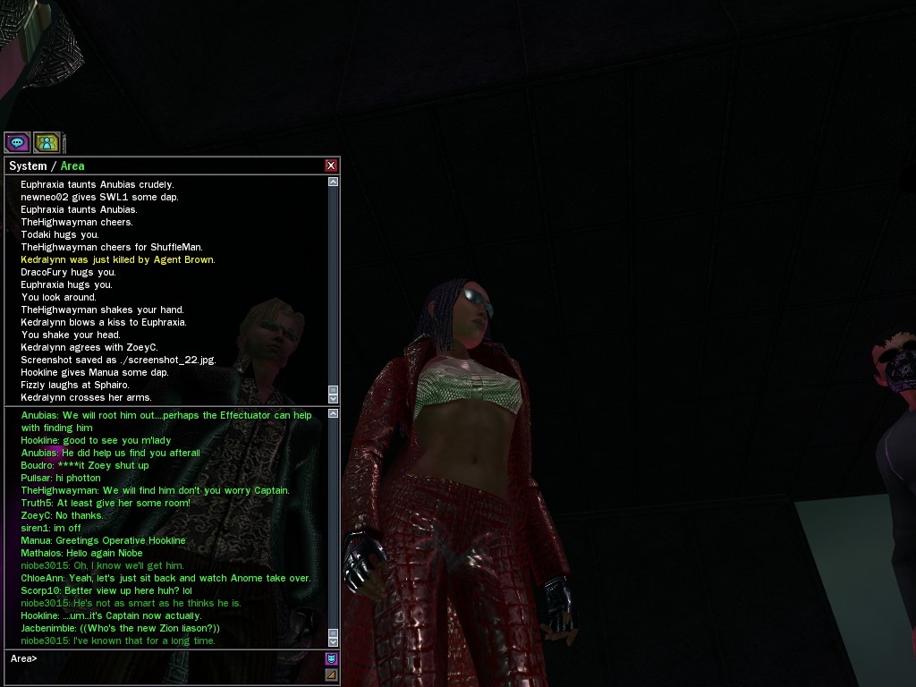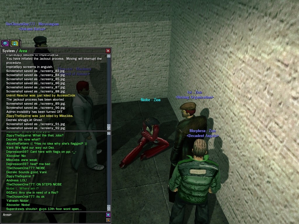 Niobe is back in Zion. It took a lot of hard work over these past weeks from our operatives, and from operatives working for the Merovingian, who decided to help us for reasons of his own. His man, the Effectuator, while sometimes maddeningly irritating, nevertheless was able to track down the construct in which Anome had imprisoned Niobe, after operatives aided him by tracking down network junctions, and clearing Anome's people out of the way. On Friday, with the final network trace made, and Niobe's location pinned down, we stormed Bishop Imports--the site of Anome's treachery, and her disappearance--to pull her back into our simulation. Anome's men had sealed off the upper floors, requiring teams of operatives to free specific hardlines from his control in Bathary Row and Chelsea, so that the Effectuator could gain the necessary network access to disable these blockades. Still, with teams working simultaneously in Bathary, Chelsea, and Ueno, we were able to overcome Anome's forces, and finally, near the top of Bishop Imports, pull Niobe out of her prison. She was desperately weak from her wounds and long imprisonment, and even her body in Zion had suffered due to its extended period of inactivity. But with the help of those around her, she somehow found the strength to stand, get to the rooftop, and jack out once the doctors had cleared her. She hasn't said much since she's been back. She's still weak, but resting, and getting stronger day by day. I think this ordeal has worked some changes on her--for better or for worse, I don't know. People who say "what doesn't kill you only makes you stronger" have never been in a war. But if anyone can come back stronger than ever after something like this, it's Niobe. The doctors aren't sure what lasting effect, if any, the cheat code she drank will have on her. They say it kept her alive, but it didn't prevent her from jacking out, as it has Anome's lieutenants. It didn't give her any obvious powers, either. There's a theory going around, I think started by Machine operatives, that the cheat codes mutated after Anome got his hands on them, or that he changed them himself, somehow. I don't know about any of that. I do know that with the captain back, Anome's days are numbered. If I know Niobe, she's going to want a little payback for what he did to her, and what he's done to the Matrix. I've spoken to some operatives who wished they'd been able to participate in the Ueno operation. I tell them not to worry; there's going to be more than enough action for everyone before this is over.