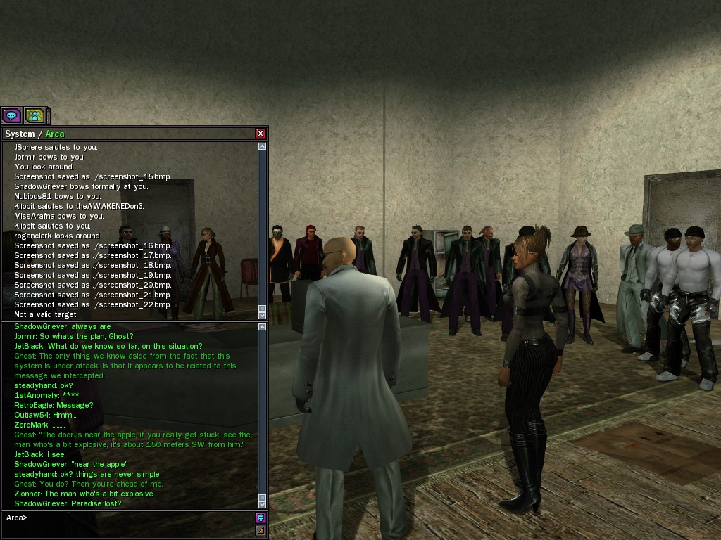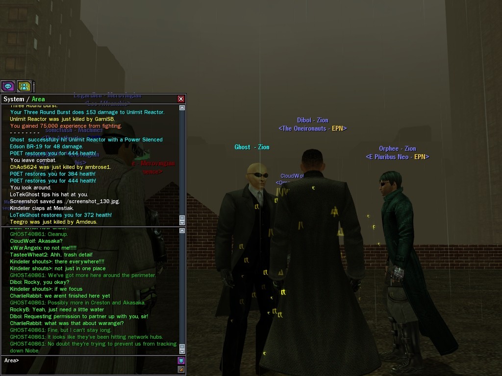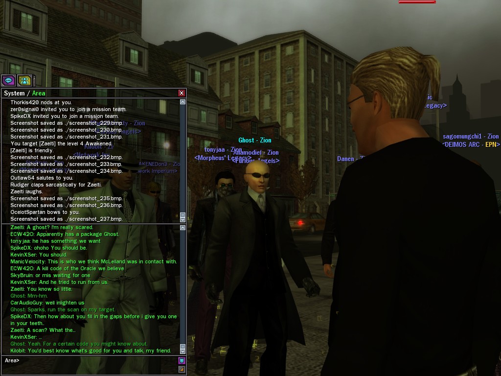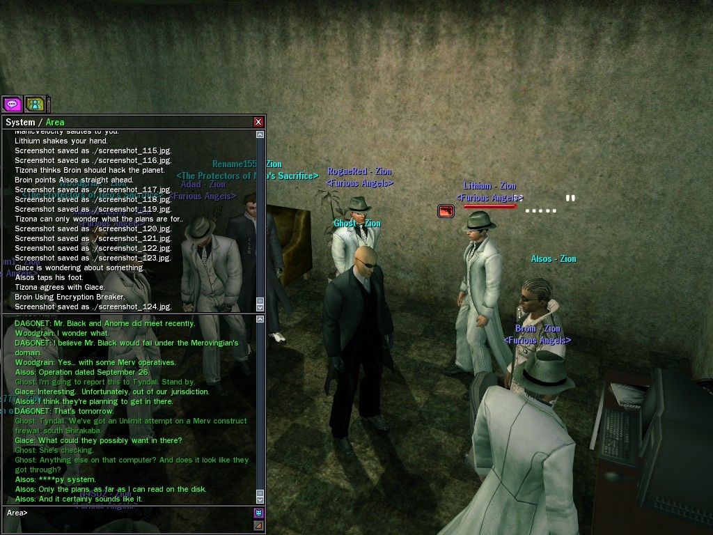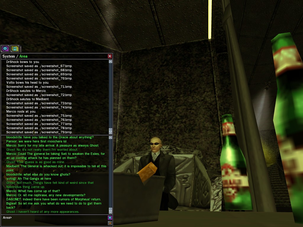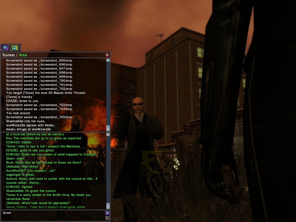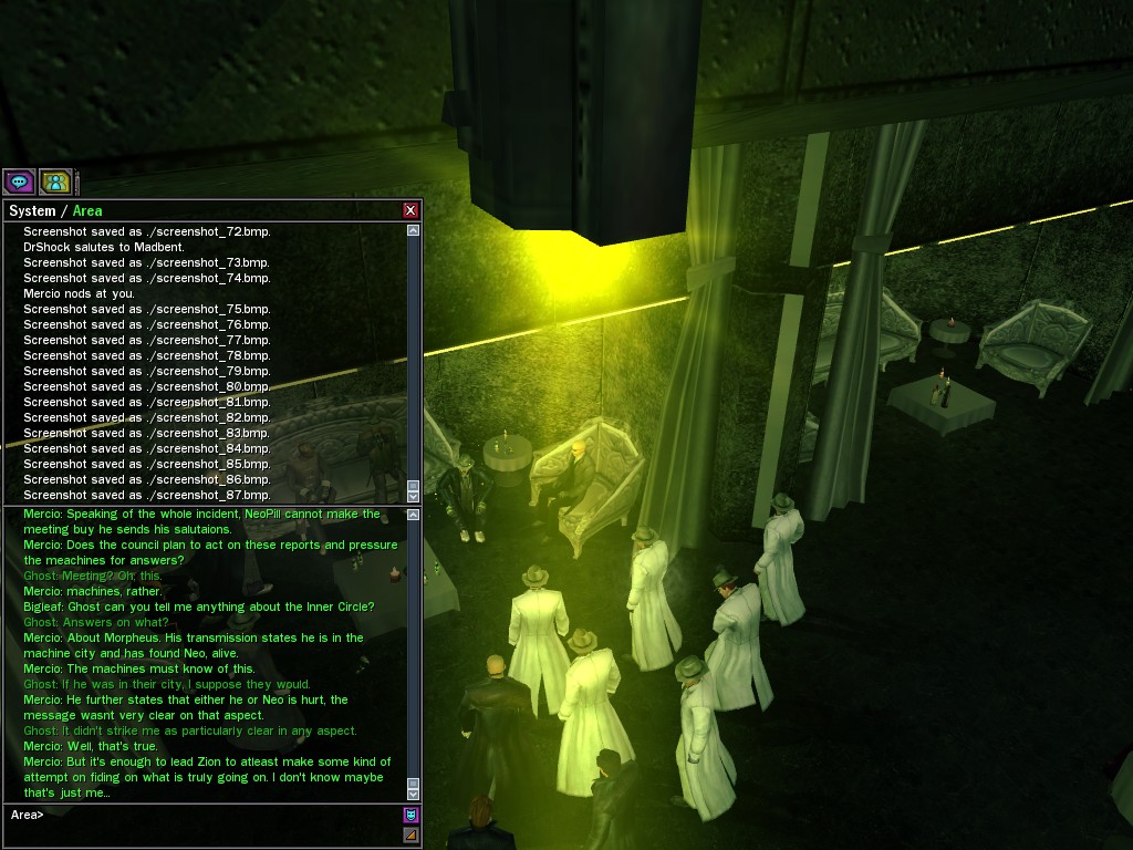 Niobe is back in Zion. It took a lot of hard work over these past weeks from our operatives, and from operatives working for the Merovingian, who decided to help us for reasons of his own. His man, the Effectuator, while sometimes maddeningly irritating, nevertheless was able to track down the construct in which Anome had imprisoned Niobe, after operatives aided him by tracking down network junctions, and clearing Anome's people out of the way. On Friday, with the final network trace made, and Niobe's location pinned down, we stormed Bishop Imports--the site of Anome's treachery, and her disappearance--to pull her back into our simulation. Anome's men had sealed off the upper floors, requiring teams of operatives to free specific hardlines from his control in Bathary Row and Chelsea, so that the Effectuator could gain the necessary network access to disable these blockades. Still, with teams working simultaneously in Bathary, Chelsea, and Ueno, we were able to overcome Anome's forces, and finally, near the top of Bishop Imports, pull Niobe out of her prison. She was desperately weak from her wounds and long imprisonment, and even her body in Zion had suffered due to its extended period of inactivity. But with the help of those around her, she somehow found the strength to stand, get to the rooftop, and jack out once the doctors had cleared her. She hasn't said much since she's been back. She's still weak, but resting, and getting stronger day by day. I think this ordeal has worked some changes on her--for better or for worse, I don't know. People who say "what doesn't kill you only makes you stronger" have never been in a war. But if anyone can come back stronger than ever after something like this, it's Niobe. The doctors aren't sure what lasting effect, if any, the cheat code she drank will have on her. They say it kept her alive, but it didn't prevent her from jacking out, as it has Anome's lieutenants. It didn't give her any obvious powers, either. There's a theory going around, I think started by Machine operatives, that the cheat codes mutated after Anome got his hands on them, or that he changed them himself, somehow. I don't know about any of that. I do know that with the captain back, Anome's days are numbered. If I know Niobe, she's going to want a little payback for what he did to her, and what he's done to the Matrix. I've spoken to some operatives who wished they'd been able to participate in the Ueno operation. I tell them not to worry; there's going to be more than enough action for everyone before this is over.