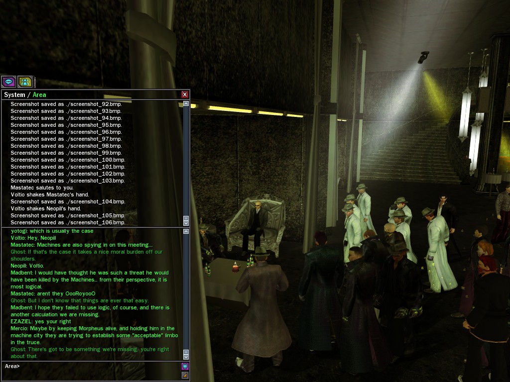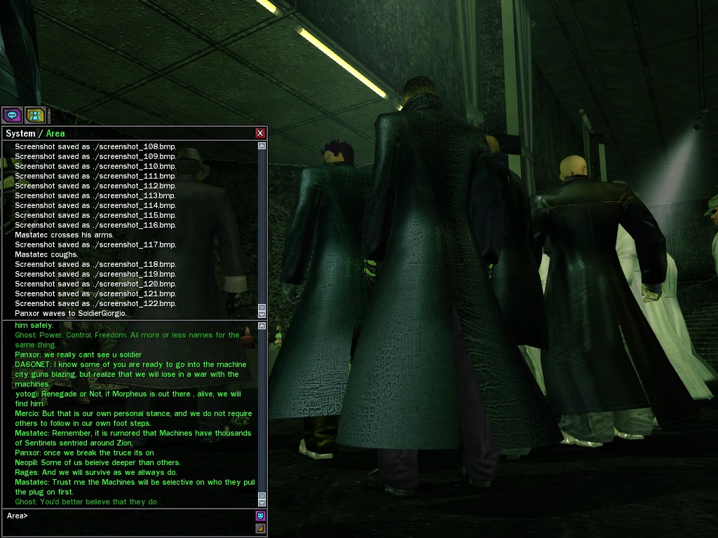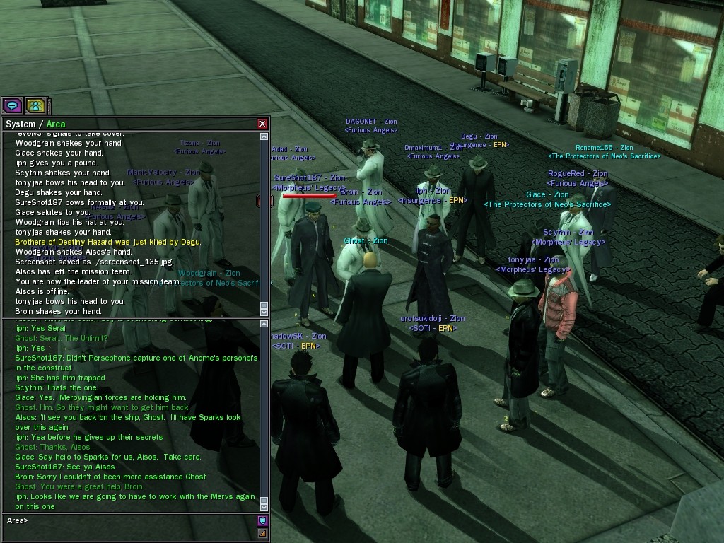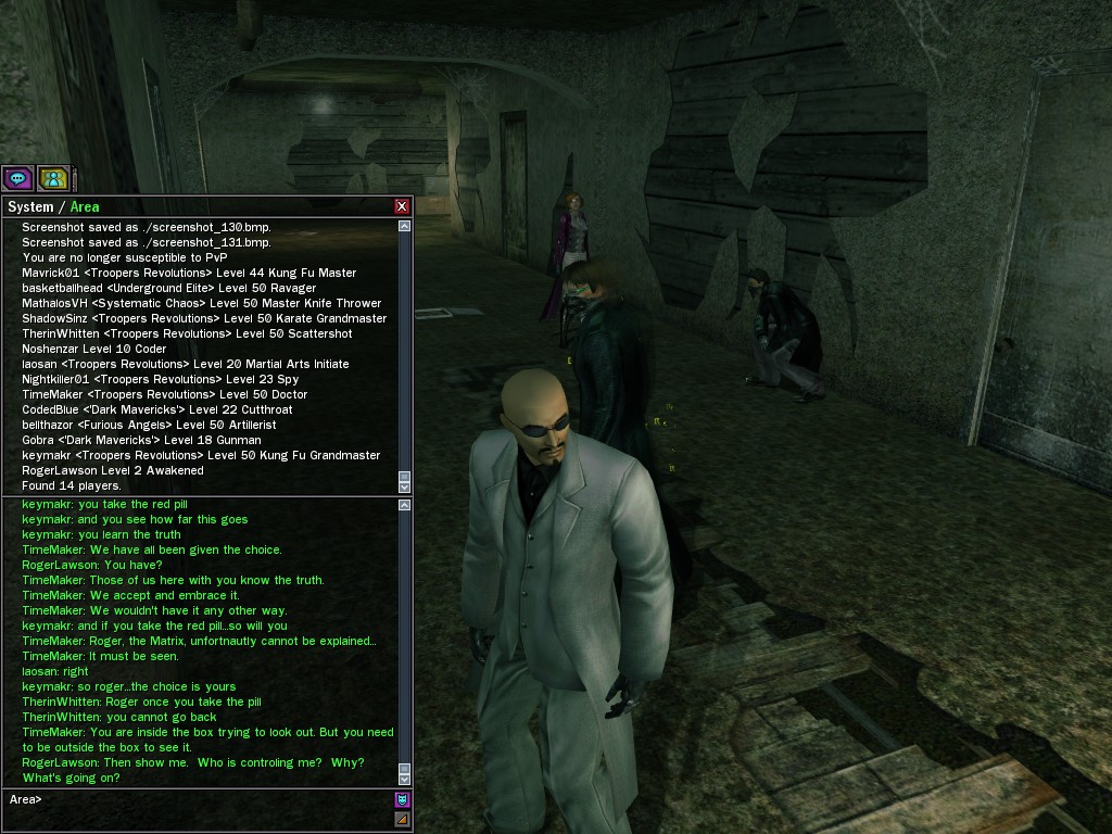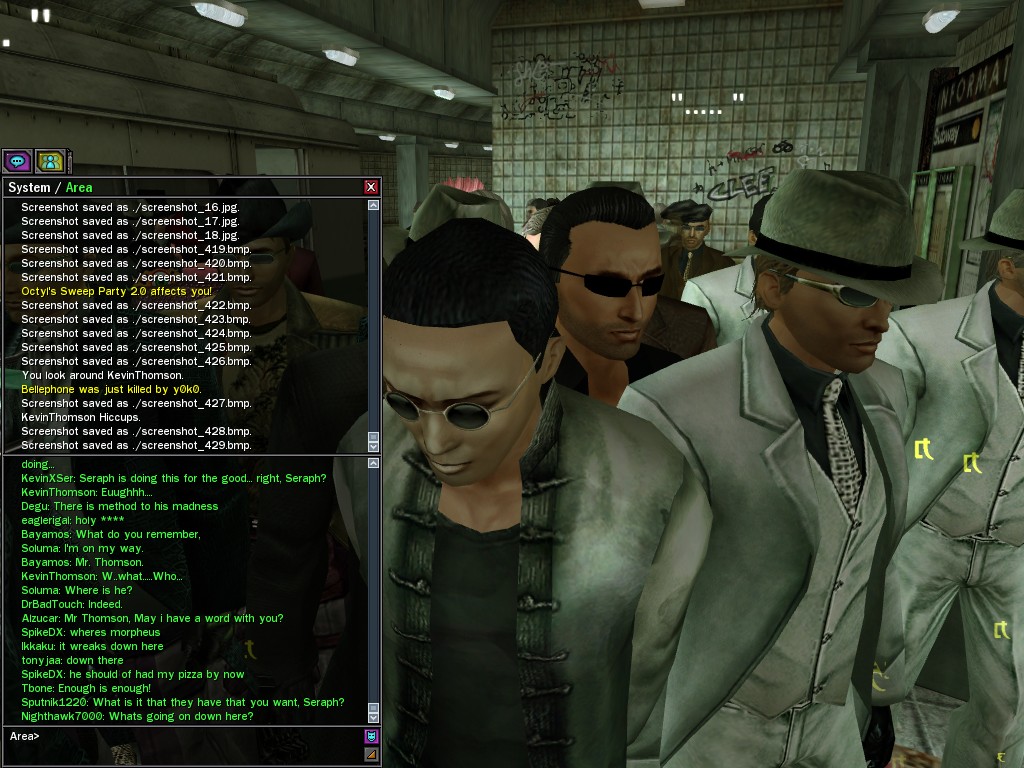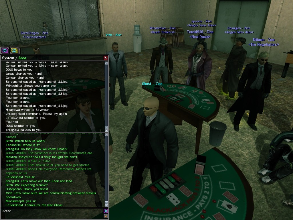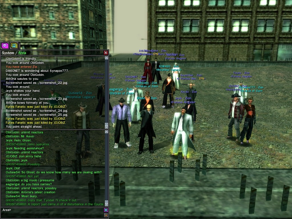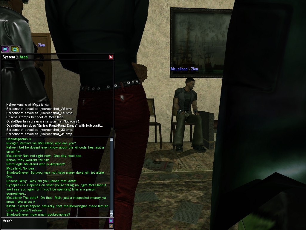Niobe is back in Zion. It took a lot of hard work over these past weeks from our operatives, and from operatives working for the Merovingian, who decided to help us for reasons of his own. His man, the Effectuator, while sometimes maddeningly irritating, nevertheless was able to track down the construct in which Anome had imprisoned Niobe, after operatives aided him by tracking down network junctions, and clearing Anome's people out of the way. On Friday, with the final network trace made, and Niobe's location pinned down, we stormed Bishop Imports--the site of Anome's treachery, and her disappearance--to pull her back into our simulation. Anome's men had sealed off the upper floors, requiring teams of operatives to free specific hardlines from his control in Bathary Row and Chelsea, so that the Effectuator could gain the necessary network access to disable these blockades. Still, with teams working simultaneously in Bathary, Chelsea, and Ueno, we were able to overcome Anome's forces, and finally, near the top of Bishop Imports, pull Niobe out of her prison. She was desperately weak from her wounds and long imprisonment, and even her body in Zion had suffered due to its extended period of inactivity. But with the help of those around her, she somehow found the strength to stand, get to the rooftop, and jack out once the doctors had cleared her. She hasn't said much since she's been back. She's still weak, but resting, and getting stronger day by day. I think this ordeal has worked some changes on her--for better or for worse, I don't know. People who say "what doesn't kill you only makes you stronger" have never been in a war. But if anyone can come back stronger than ever after something like this, it's Niobe. The doctors aren't sure what lasting effect, if any, the cheat code she drank will have on her. They say it kept her alive, but it didn't prevent her from jacking out, as it has Anome's lieutenants. It didn't give her any obvious powers, either. There's a theory going around, I think started by Machine operatives, that the cheat codes mutated after Anome got his hands on them, or that he changed them himself, somehow. I don't know about any of that. I do know that with the captain back, Anome's days are numbered. If I know Niobe, she's going to want a little payback for what he did to her, and what he's done to the Matrix. I've spoken to some operatives who wished they'd been able to participate in the Ueno operation. I tell them not to worry; there's going to be more than enough action for everyone before this is over.