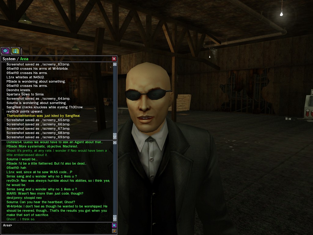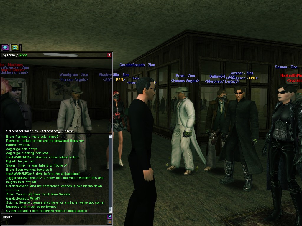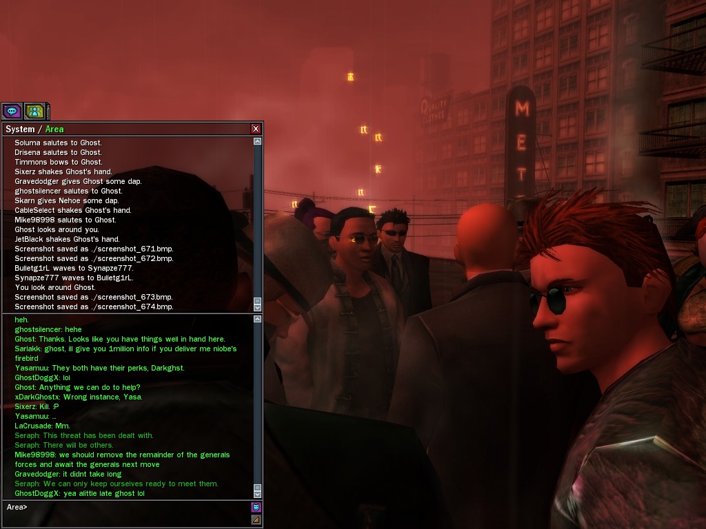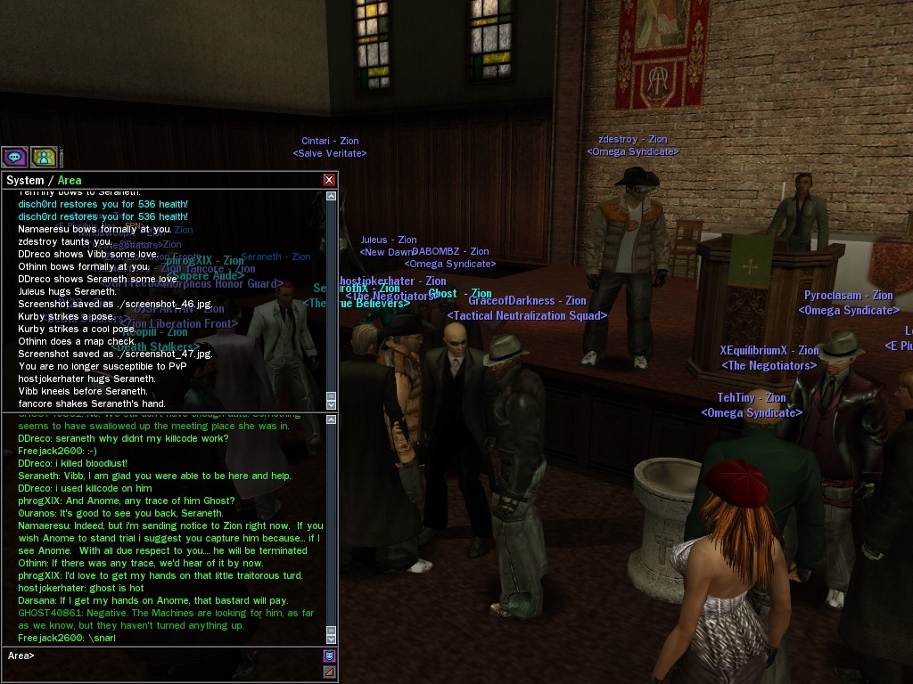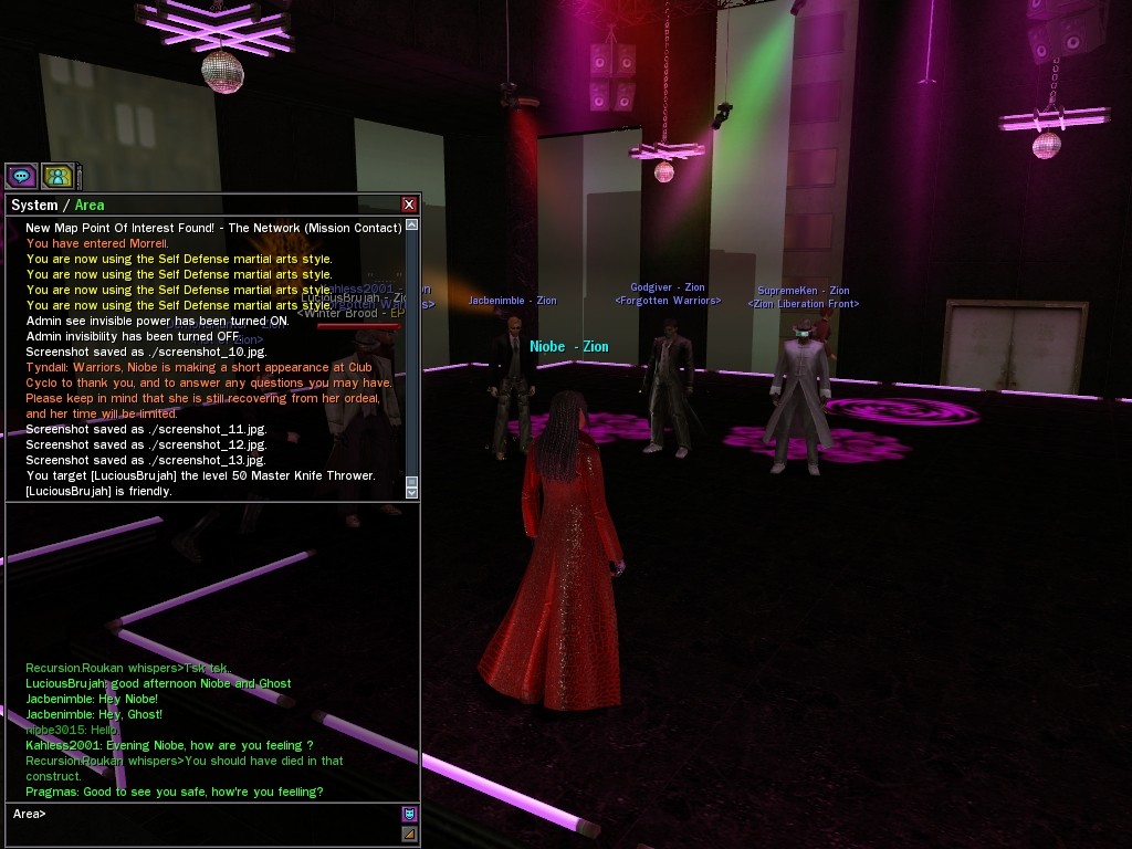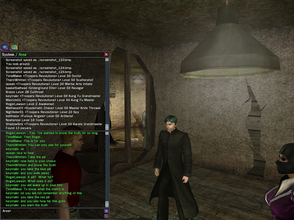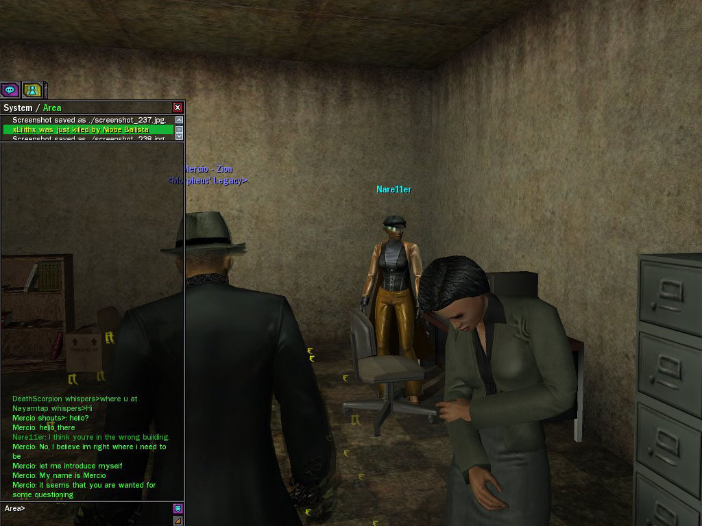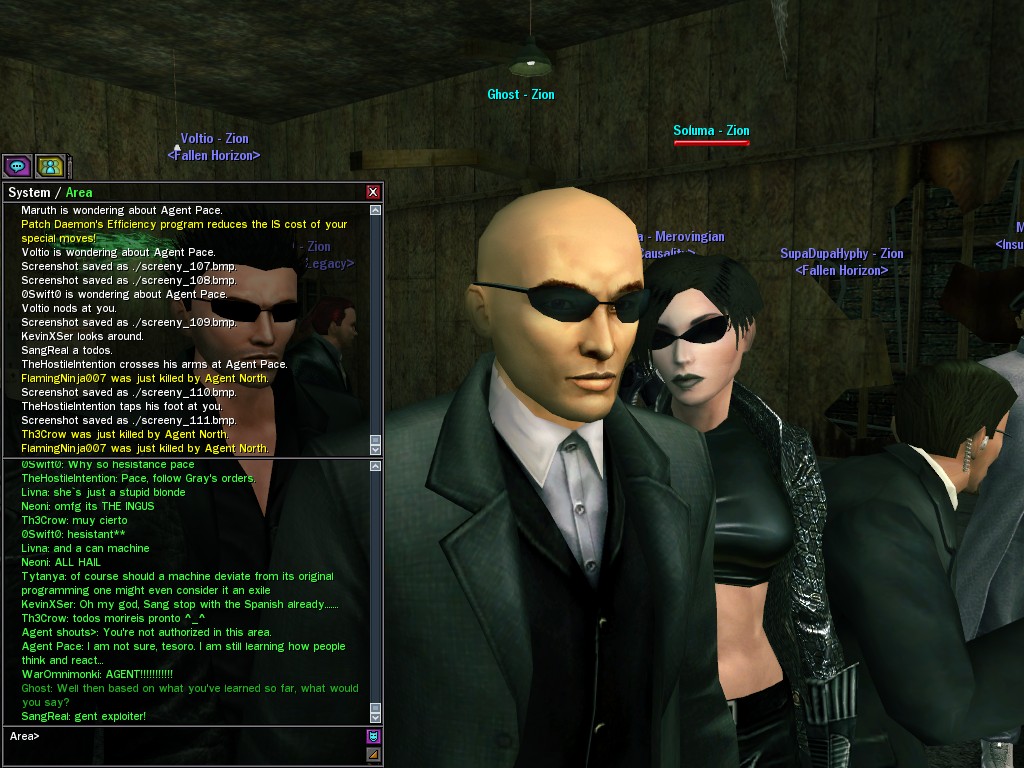 Niobe is back in Zion. It took a lot of hard work over these past weeks from our operatives, and from operatives working for the Merovingian, who decided to help us for reasons of his own. His man, the Effectuator, while sometimes maddeningly irritating, nevertheless was able to track down the construct in which Anome had imprisoned Niobe, after operatives aided him by tracking down network junctions, and clearing Anome's people out of the way. On Friday, with the final network trace made, and Niobe's location pinned down, we stormed Bishop Imports--the site of Anome's treachery, and her disappearance--to pull her back into our simulation. Anome's men had sealed off the upper floors, requiring teams of operatives to free specific hardlines from his control in Bathary Row and Chelsea, so that the Effectuator could gain the necessary network access to disable these blockades. Still, with teams working simultaneously in Bathary, Chelsea, and Ueno, we were able to overcome Anome's forces, and finally, near the top of Bishop Imports, pull Niobe out of her prison. She was desperately weak from her wounds and long imprisonment, and even her body in Zion had suffered due to its extended period of inactivity. But with the help of those around her, she somehow found the strength to stand, get to the rooftop, and jack out once the doctors had cleared her. She hasn't said much since she's been back. She's still weak, but resting, and getting stronger day by day. I think this ordeal has worked some changes on her--for better or for worse, I don't know. People who say "what doesn't kill you only makes you stronger" have never been in a war. But if anyone can come back stronger than ever after something like this, it's Niobe. The doctors aren't sure what lasting effect, if any, the cheat code she drank will have on her. They say it kept her alive, but it didn't prevent her from jacking out, as it has Anome's lieutenants. It didn't give her any obvious powers, either. There's a theory going around, I think started by Machine operatives, that the cheat codes mutated after Anome got his hands on them, or that he changed them himself, somehow. I don't know about any of that. I do know that with the captain back, Anome's days are numbered. If I know Niobe, she's going to want a little payback for what he did to her, and what he's done to the Matrix. I've spoken to some operatives who wished they'd been able to participate in the Ueno operation. I tell them not to worry; there's going to be more than enough action for everyone before this is over.