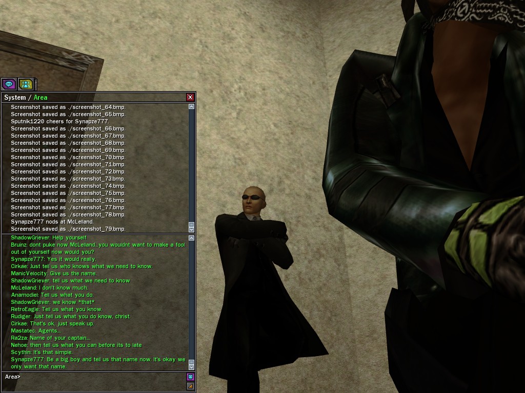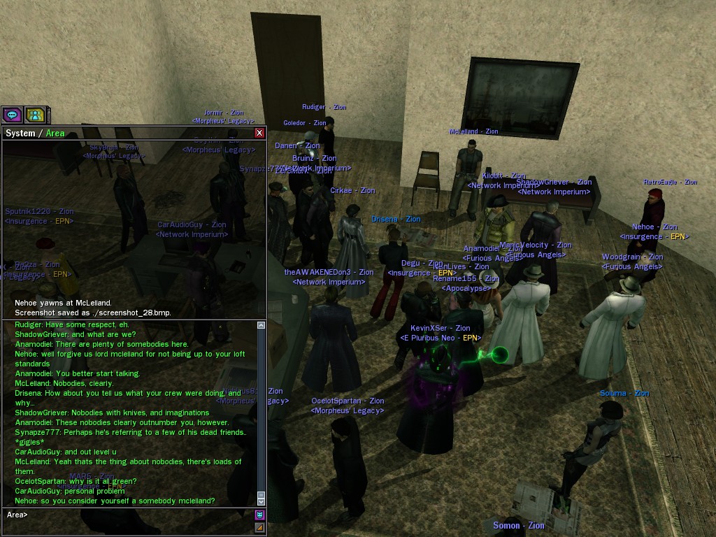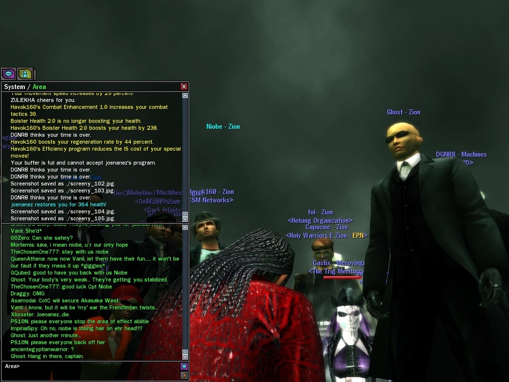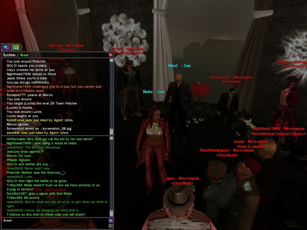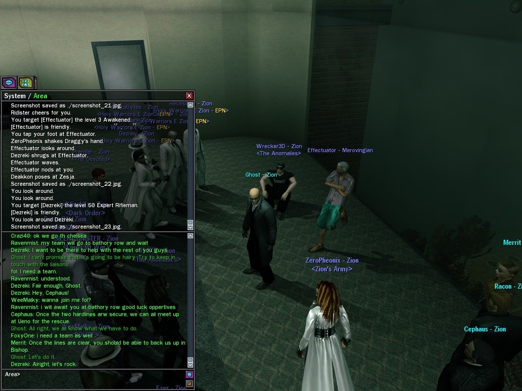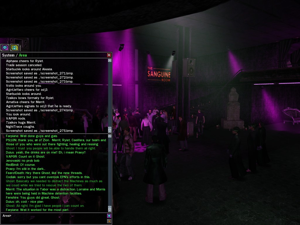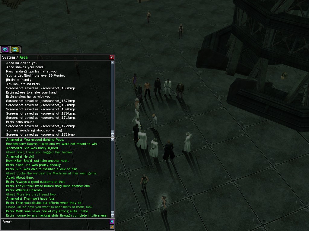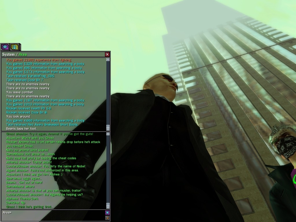 Niobe is back in Zion. It took a lot of hard work over these past weeks from our operatives, and from operatives working for the Merovingian, who decided to help us for reasons of his own. His man, the Effectuator, while sometimes maddeningly irritating, nevertheless was able to track down the construct in which Anome had imprisoned Niobe, after operatives aided him by tracking down network junctions, and clearing Anome's people out of the way. On Friday, with the final network trace made, and Niobe's location pinned down, we stormed Bishop Imports--the site of Anome's treachery, and her disappearance--to pull her back into our simulation. Anome's men had sealed off the upper floors, requiring teams of operatives to free specific hardlines from his control in Bathary Row and Chelsea, so that the Effectuator could gain the necessary network access to disable these blockades. Still, with teams working simultaneously in Bathary, Chelsea, and Ueno, we were able to overcome Anome's forces, and finally, near the top of Bishop Imports, pull Niobe out of her prison. She was desperately weak from her wounds and long imprisonment, and even her body in Zion had suffered due to its extended period of inactivity. But with the help of those around her, she somehow found the strength to stand, get to the rooftop, and jack out once the doctors had cleared her. She hasn't said much since she's been back. She's still weak, but resting, and getting stronger day by day. I think this ordeal has worked some changes on her--for better or for worse, I don't know. People who say "what doesn't kill you only makes you stronger" have never been in a war. But if anyone can come back stronger than ever after something like this, it's Niobe. The doctors aren't sure what lasting effect, if any, the cheat code she drank will have on her. They say it kept her alive, but it didn't prevent her from jacking out, as it has Anome's lieutenants. It didn't give her any obvious powers, either. There's a theory going around, I think started by Machine operatives, that the cheat codes mutated after Anome got his hands on them, or that he changed them himself, somehow. I don't know about any of that. I do know that with the captain back, Anome's days are numbered. If I know Niobe, she's going to want a little payback for what he did to her, and what he's done to the Matrix. I've spoken to some operatives who wished they'd been able to participate in the Ueno operation. I tell them not to worry; there's going to be more than enough action for everyone before this is over.