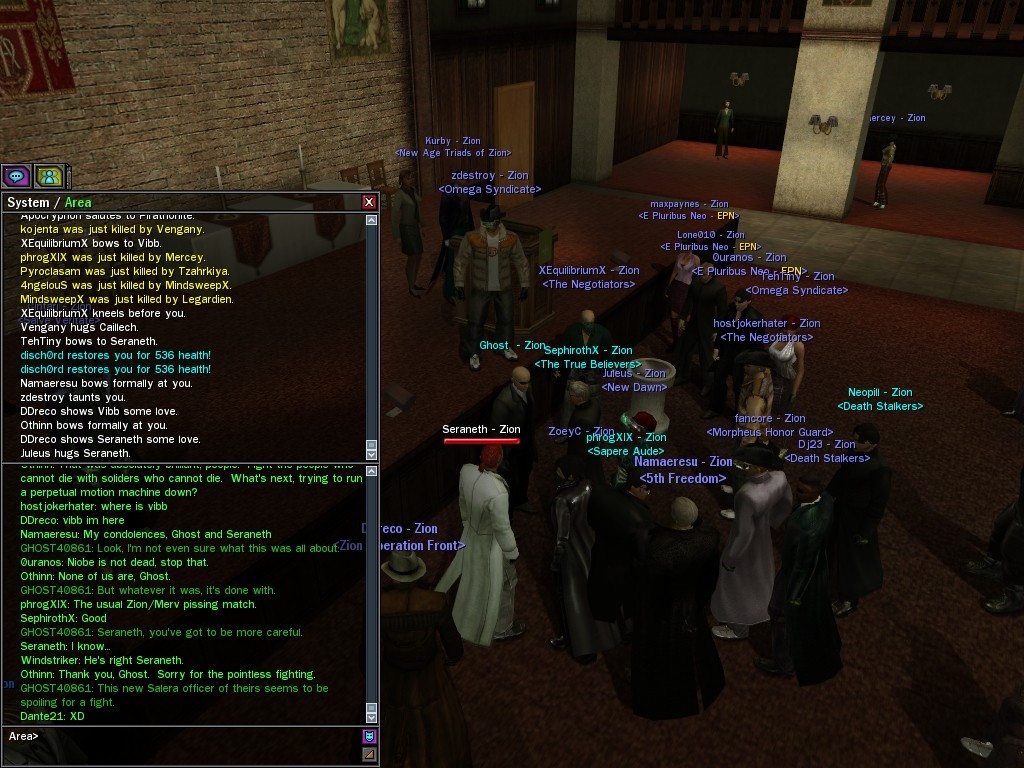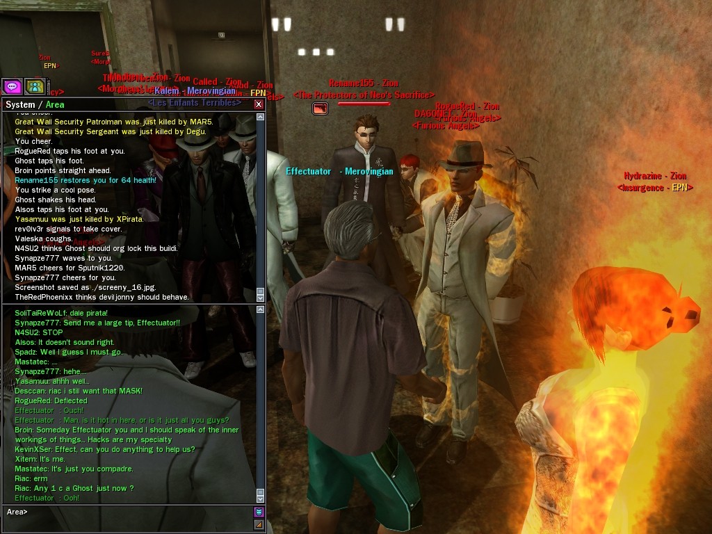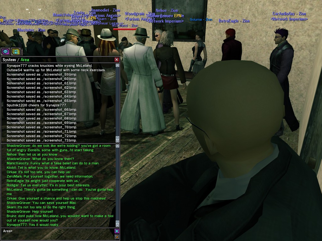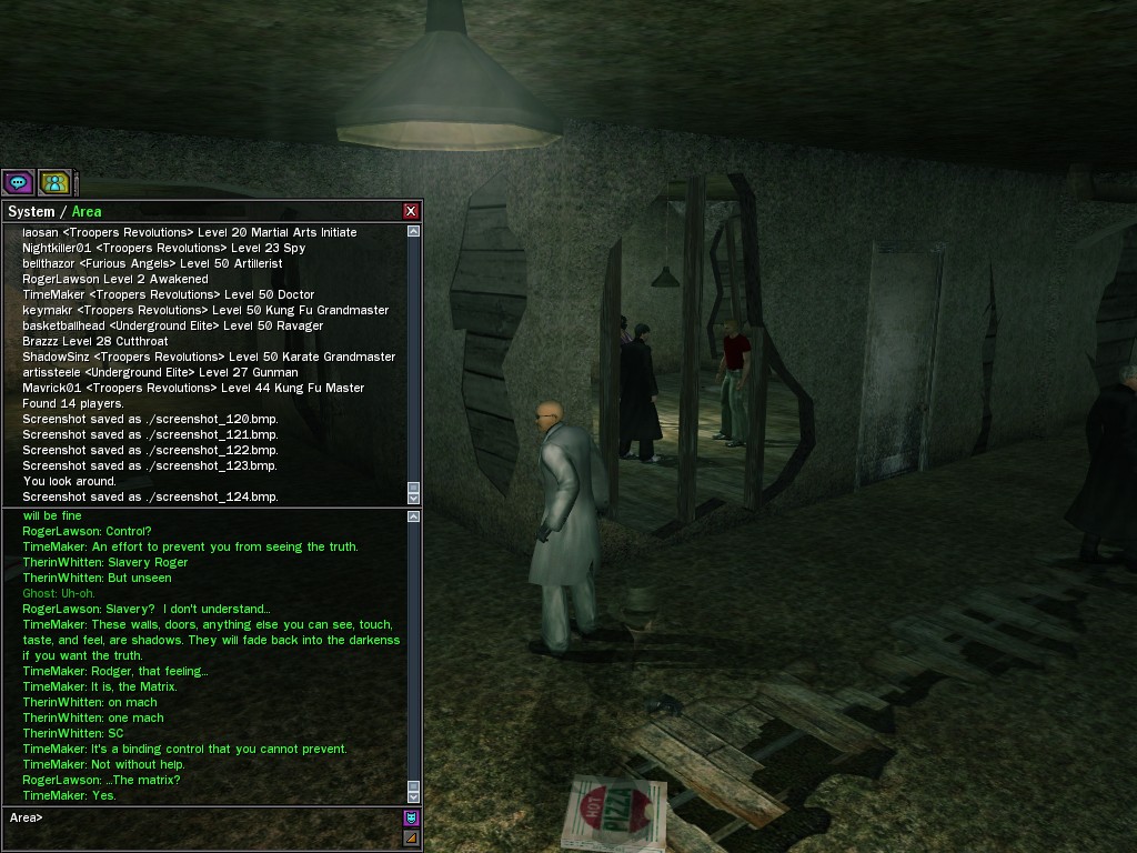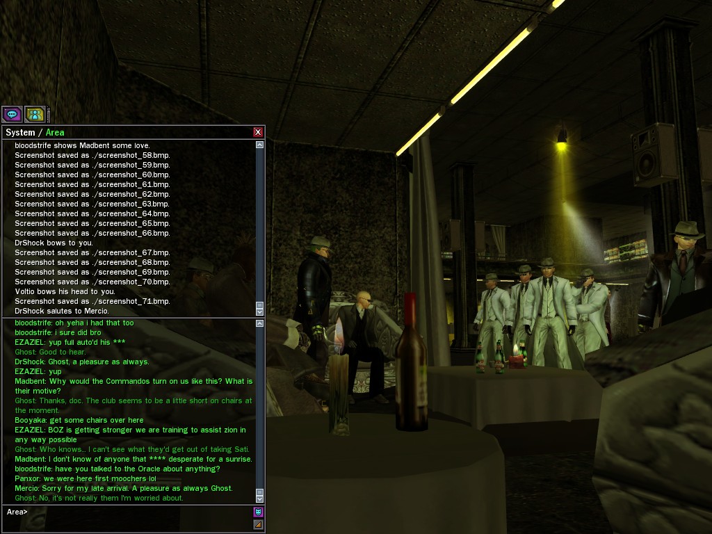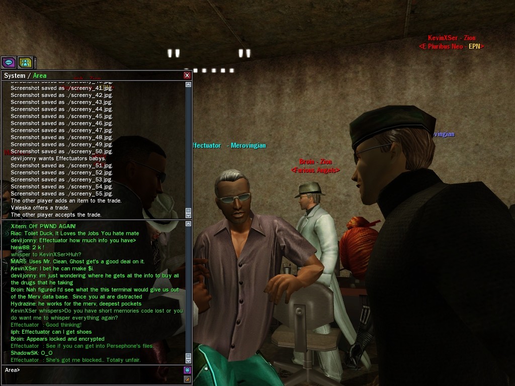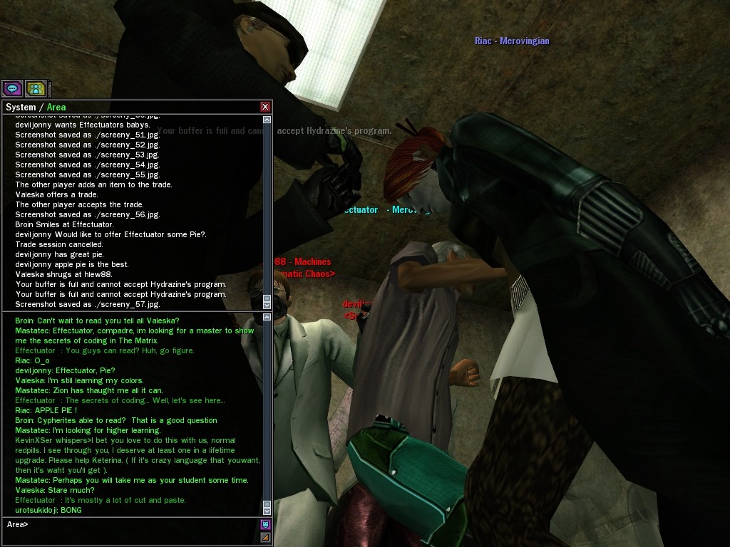 Niobe is back in Zion. It took a lot of hard work over these past weeks from our operatives, and from operatives working for the Merovingian, who decided to help us for reasons of his own. His man, the Effectuator, while sometimes maddeningly irritating, nevertheless was able to track down the construct in which Anome had imprisoned Niobe, after operatives aided him by tracking down network junctions, and clearing Anome's people out of the way. On Friday, with the final network trace made, and Niobe's location pinned down, we stormed Bishop Imports--the site of Anome's treachery, and her disappearance--to pull her back into our simulation. Anome's men had sealed off the upper floors, requiring teams of operatives to free specific hardlines from his control in Bathary Row and Chelsea, so that the Effectuator could gain the necessary network access to disable these blockades. Still, with teams working simultaneously in Bathary, Chelsea, and Ueno, we were able to overcome Anome's forces, and finally, near the top of Bishop Imports, pull Niobe out of her prison. She was desperately weak from her wounds and long imprisonment, and even her body in Zion had suffered due to its extended period of inactivity. But with the help of those around her, she somehow found the strength to stand, get to the rooftop, and jack out once the doctors had cleared her. She hasn't said much since she's been back. She's still weak, but resting, and getting stronger day by day. I think this ordeal has worked some changes on her--for better or for worse, I don't know. People who say "what doesn't kill you only makes you stronger" have never been in a war. But if anyone can come back stronger than ever after something like this, it's Niobe. The doctors aren't sure what lasting effect, if any, the cheat code she drank will have on her. They say it kept her alive, but it didn't prevent her from jacking out, as it has Anome's lieutenants. It didn't give her any obvious powers, either. There's a theory going around, I think started by Machine operatives, that the cheat codes mutated after Anome got his hands on them, or that he changed them himself, somehow. I don't know about any of that. I do know that with the captain back, Anome's days are numbered. If I know Niobe, she's going to want a little payback for what he did to her, and what he's done to the Matrix. I've spoken to some operatives who wished they'd been able to participate in the Ueno operation. I tell them not to worry; there's going to be more than enough action for everyone before this is over.