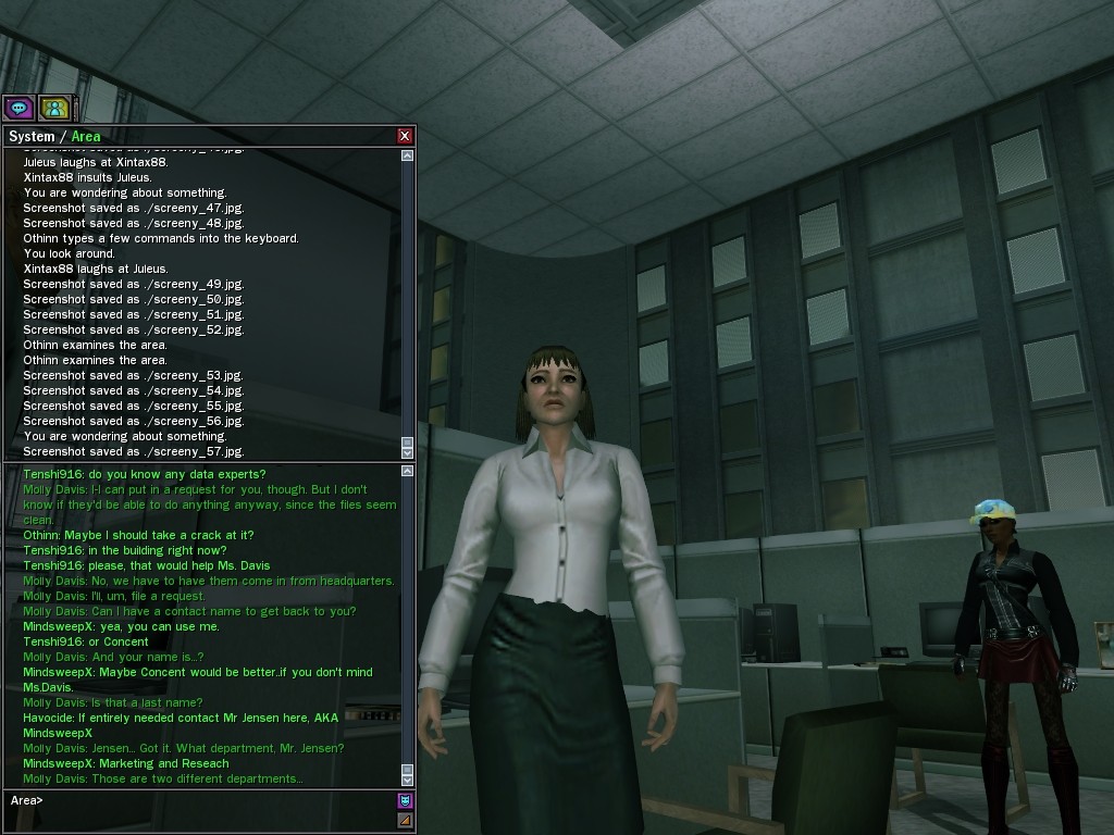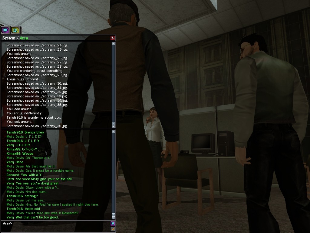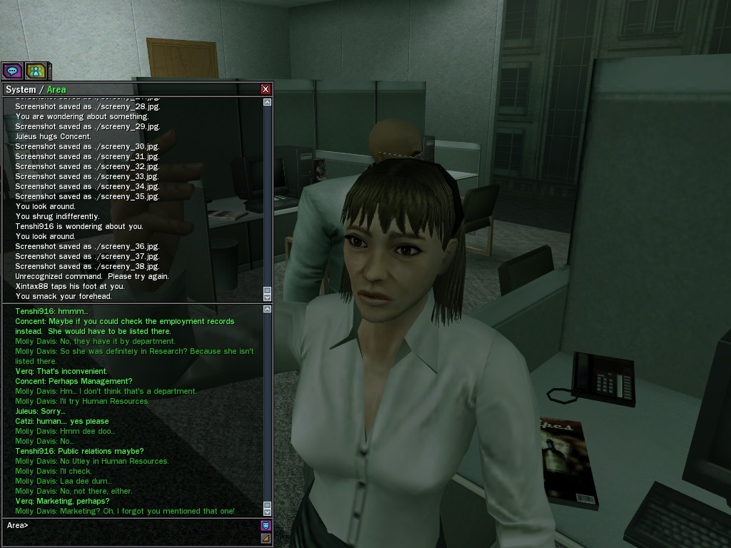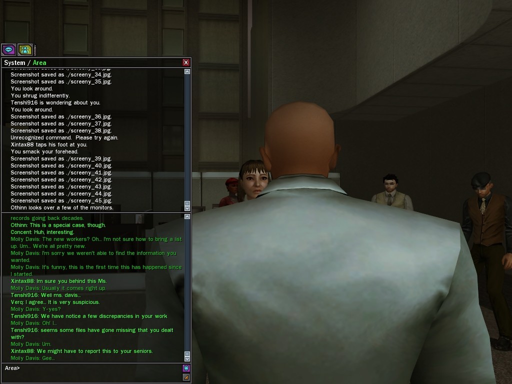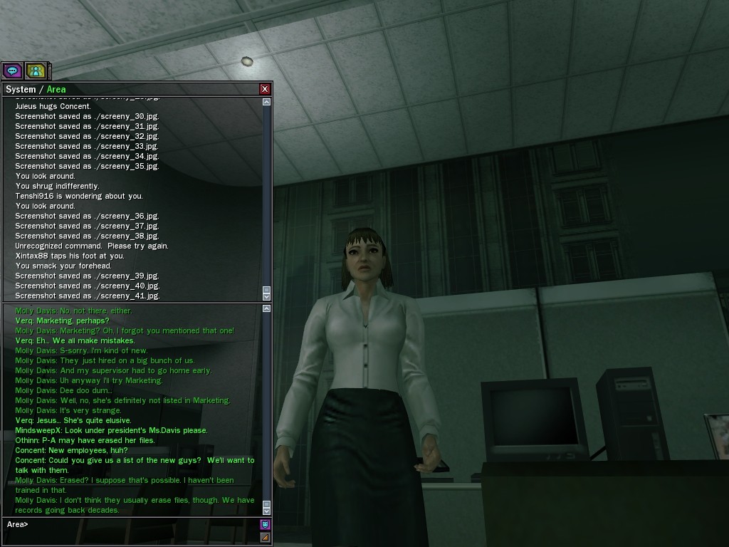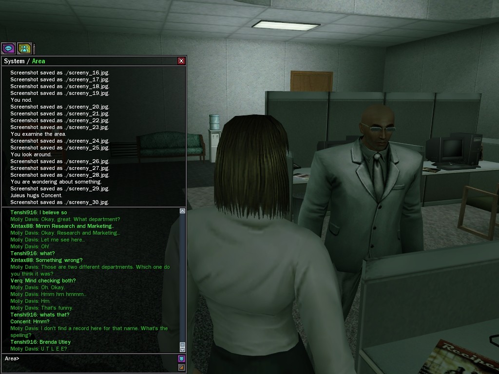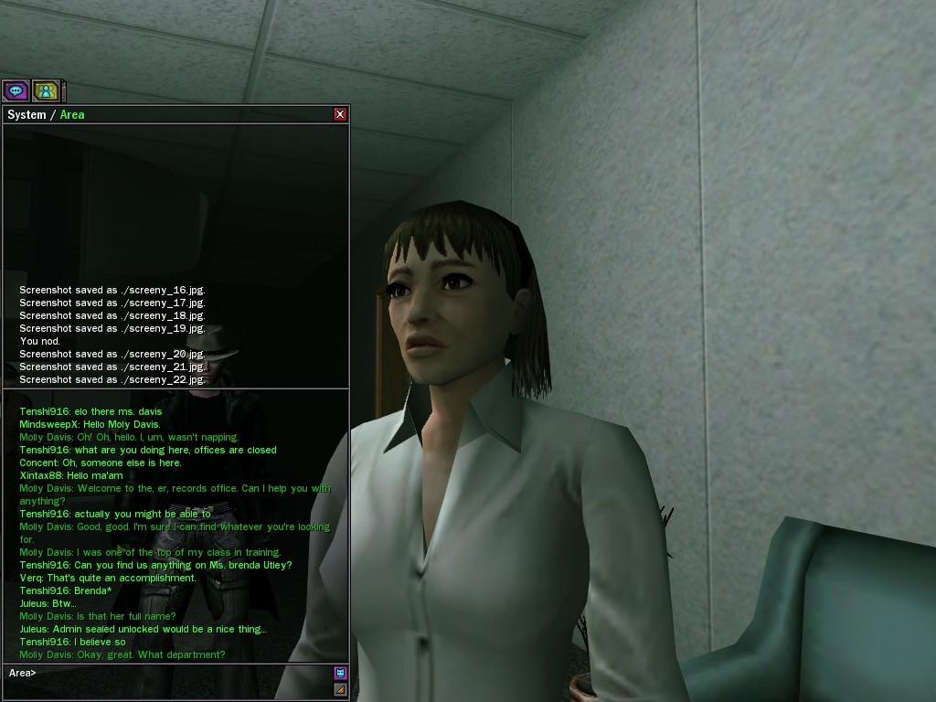 Liaison officer Concent led operatives Catzi, Verq, MindsweepX, Xintax88, and Tenshi916 to the Pendhurst-Amaranth head branch office on a mission to get information regarding Brenda Utley's disappearance. We learned recently that some kind of orders regarding Utley came from that office. The team went there to see what they could find. After talking their way past security, they found a records office, where a new Pendhurst-Amaranth clerk helped them search the employee database for Utley's records. None were found. Someone at Pendhurst-Amaranth is doing their best to make Utley nothing more than a memory. Unfortunately for them, we have a long memory. We're going to find out who's been tampering with her files, and why.