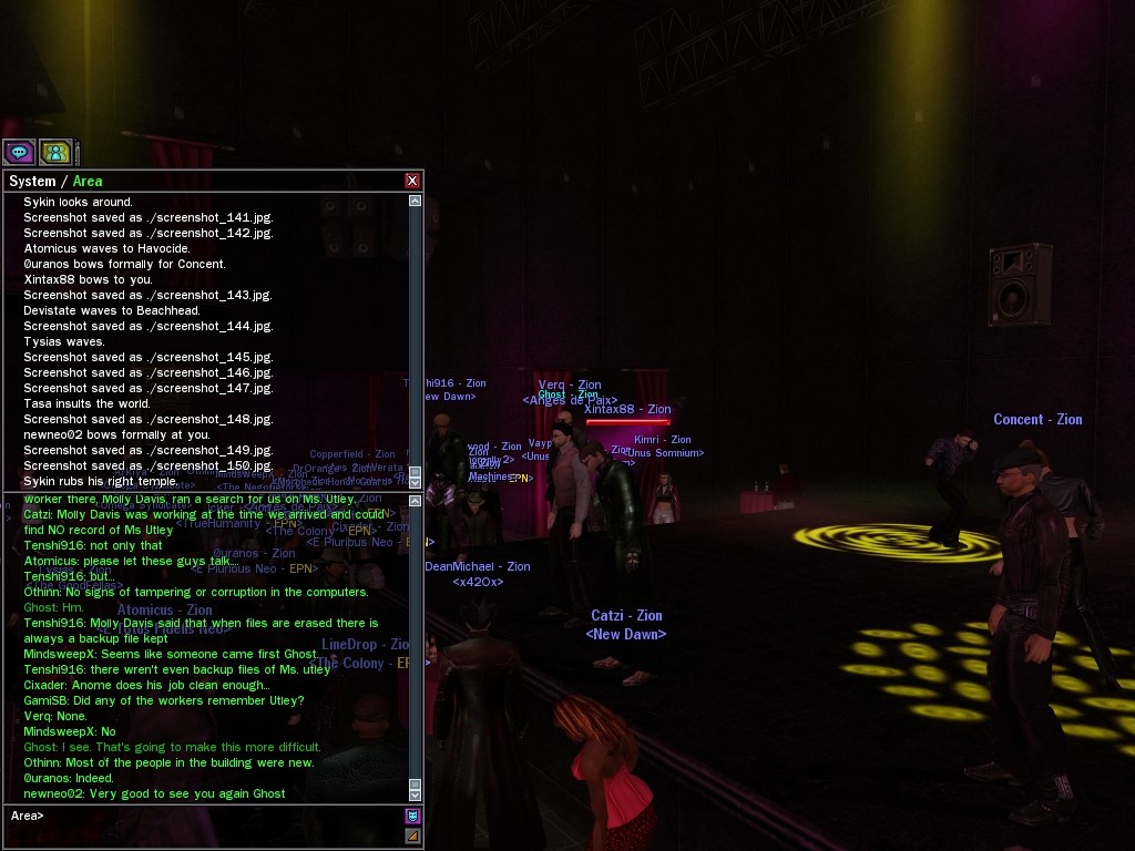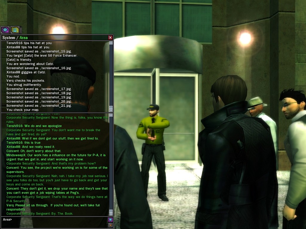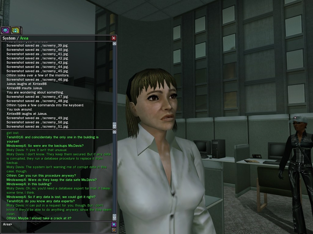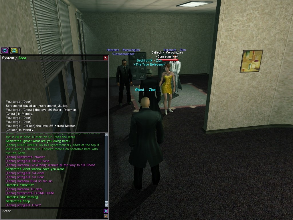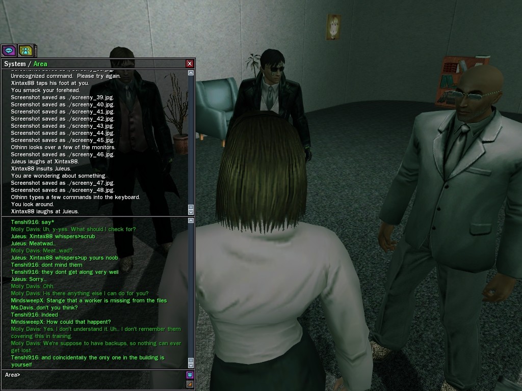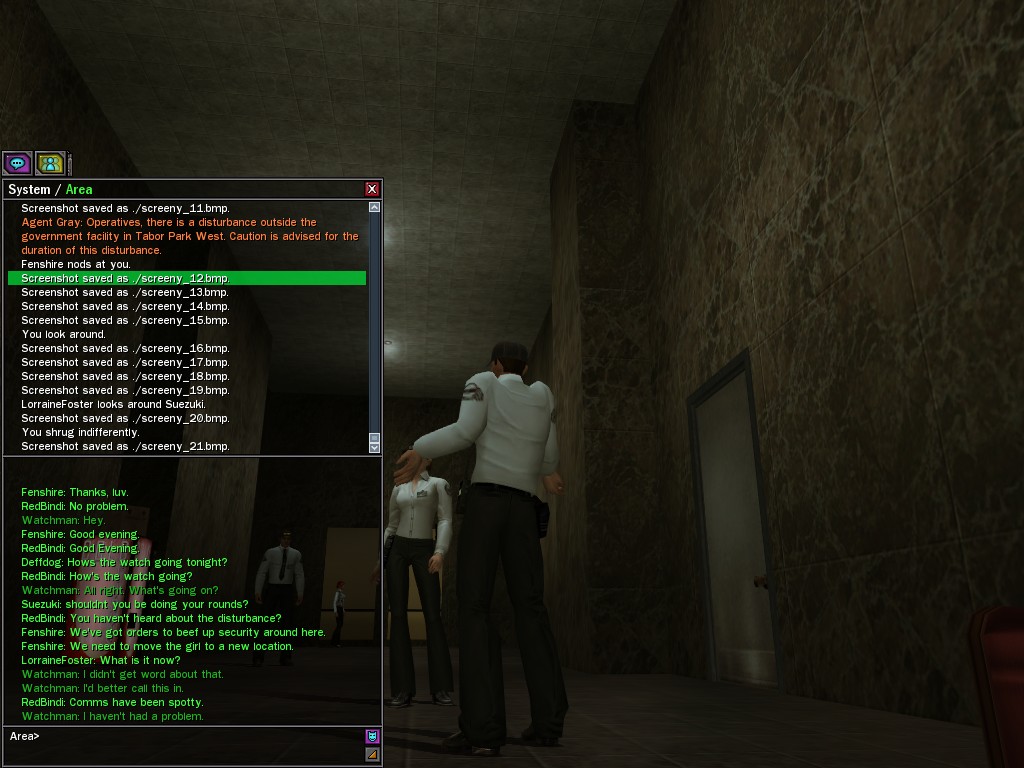 Liaison officer Concent led operatives Catzi, Verq, MindsweepX, Xintax88, and Tenshi916 to the Pendhurst-Amaranth head branch office on a mission to get information regarding Brenda Utley's disappearance. We learned recently that some kind of orders regarding Utley came from that office. The team went there to see what they could find. After talking their way past security, they found a records office, where a new Pendhurst-Amaranth clerk helped them search the employee database for Utley's records. None were found. Someone at Pendhurst-Amaranth is doing their best to make Utley nothing more than a memory. Unfortunately for them, we have a long memory. We're going to find out who's been tampering with her files, and why.