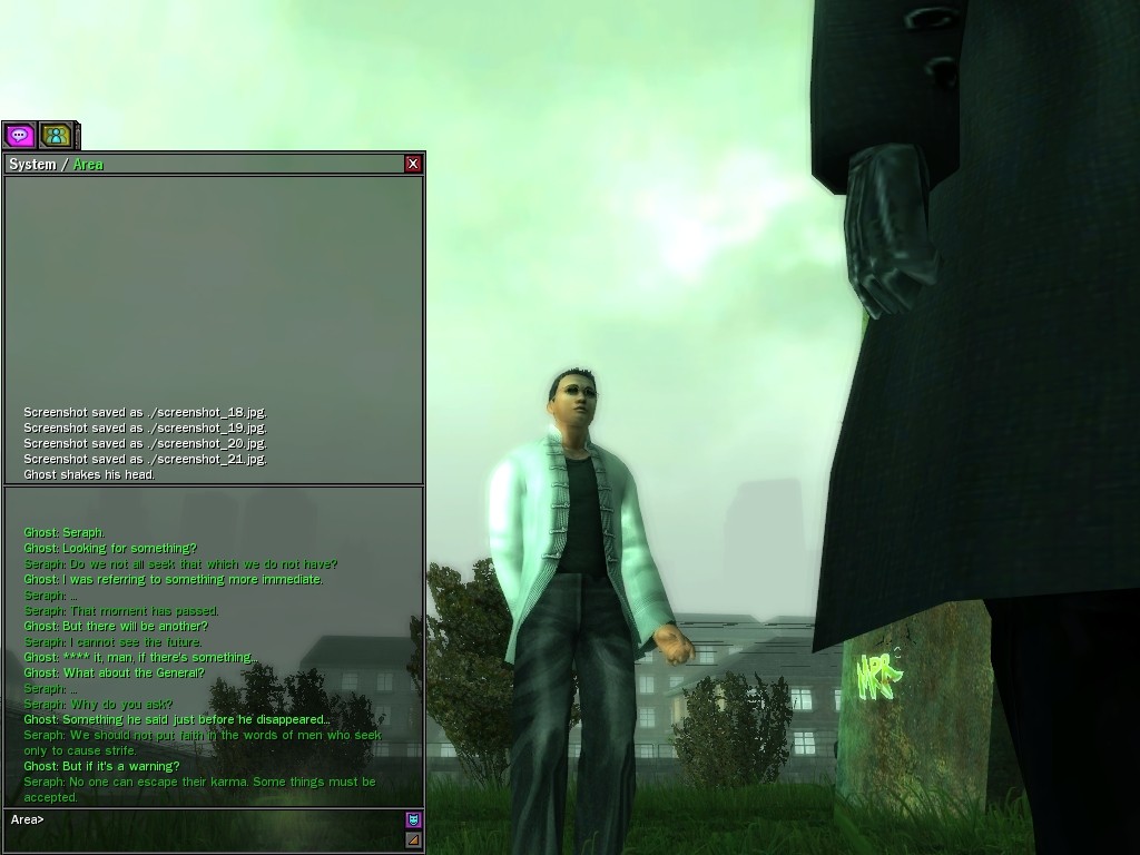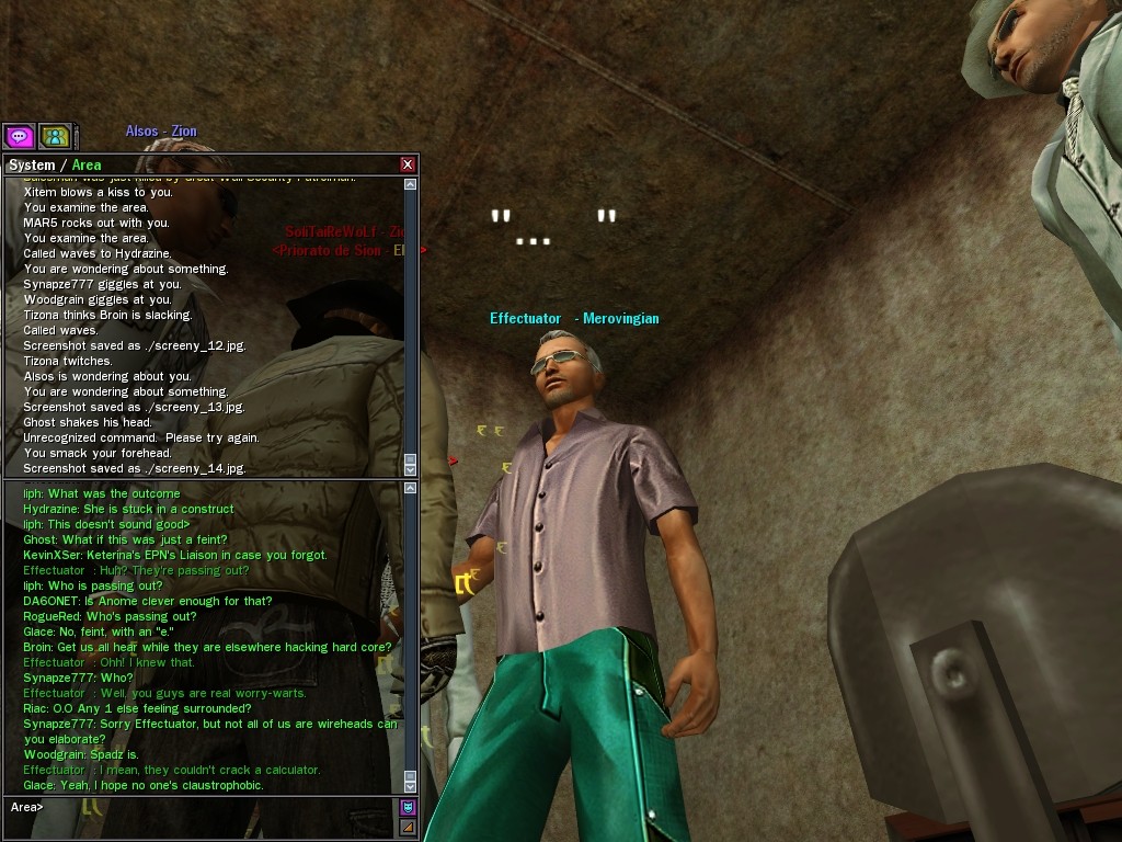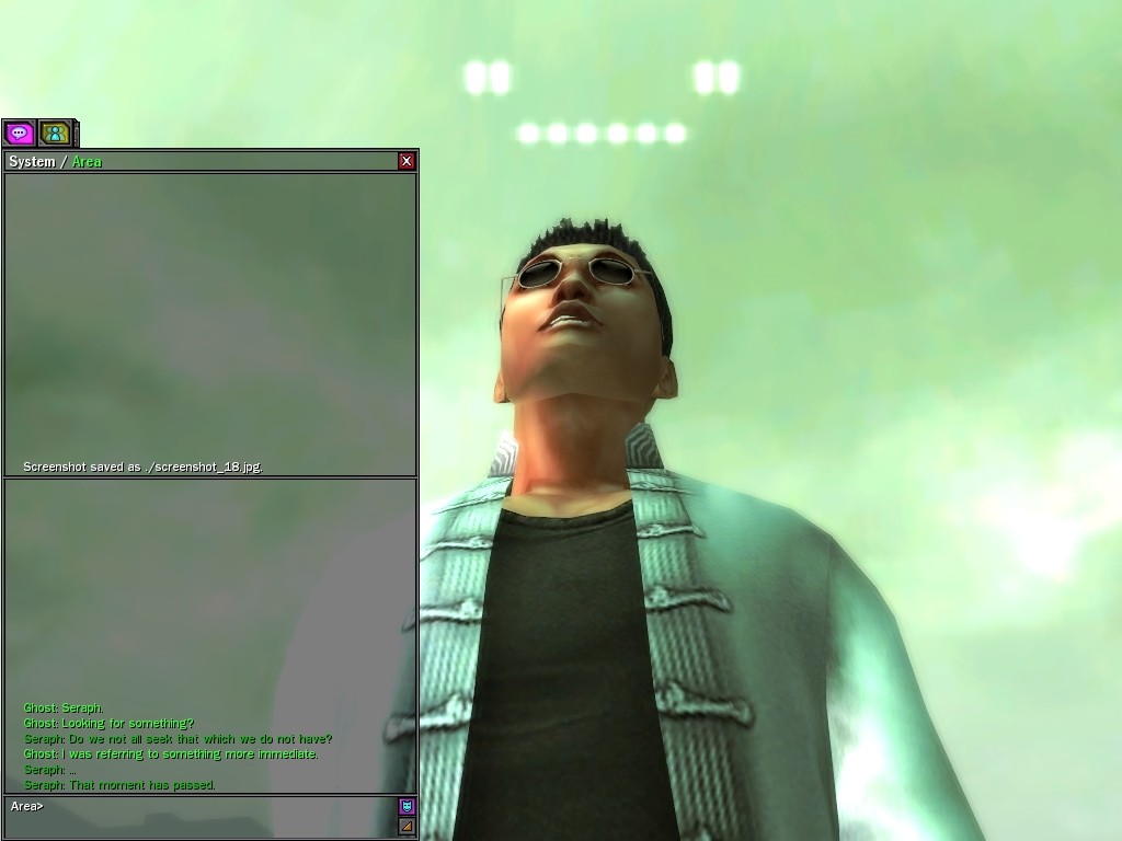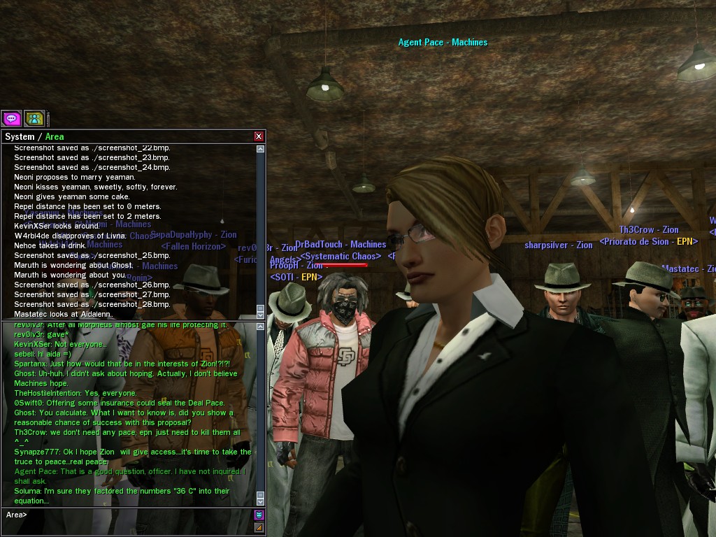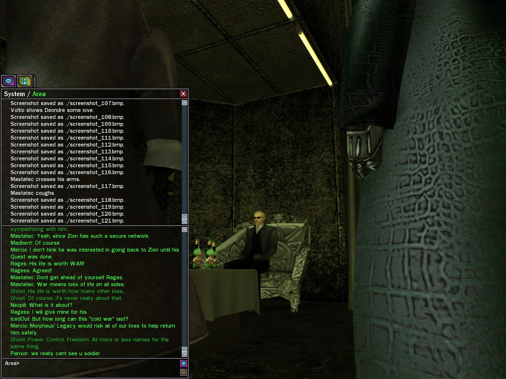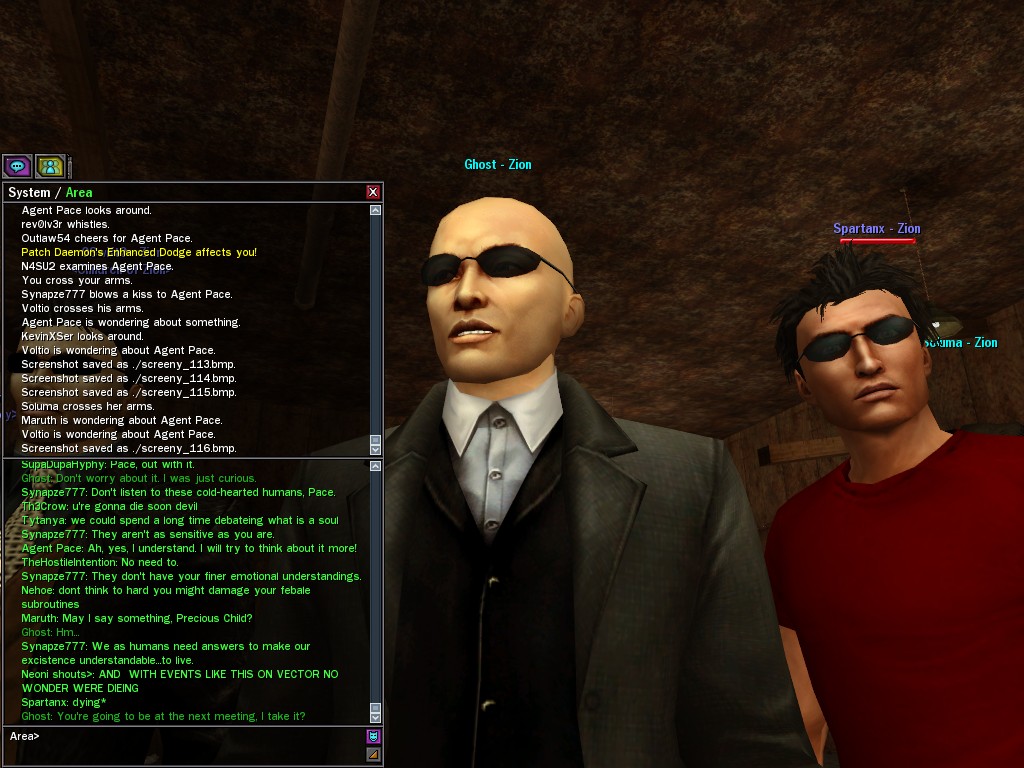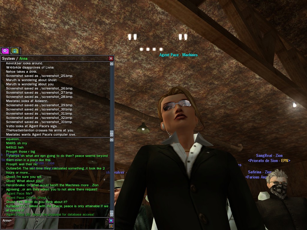 Niobe's good at a lot of things, but taking it easy isn't one of them. She's still not back at full strength, but she's insisting on making public appearances. She puts up a good front, but she can't even get out of the seat by herself after jacking out. At least this time she was meeting with Zionites. Oh, the Mervs and Machinists were outside, trying to get in, and whining up a storm about Niobe being thankless--actually, it was just the Mervs who were whining. They must not have noticed that she's already met with a large number of them separately. It's interesting to watch her. She is getting stronger. And she's gradually coming to grips with Anome's betrayal. Niobe has been very reluctant to trust anyone for years now, yet she trusted Anome, and he turned and shot her in the gut. Will this harden her further? You'll never have reason to doubt your trust in me at least, Niobe. You could have, for my failure to be there when Anome turned traitor, but it isn't in your nature to blame people for their own shortcomings. You may curse them out in public if you're really mad at them, but deep down, you blame yourself. I can tell, because I do the same. Maybe that's why we still get along.