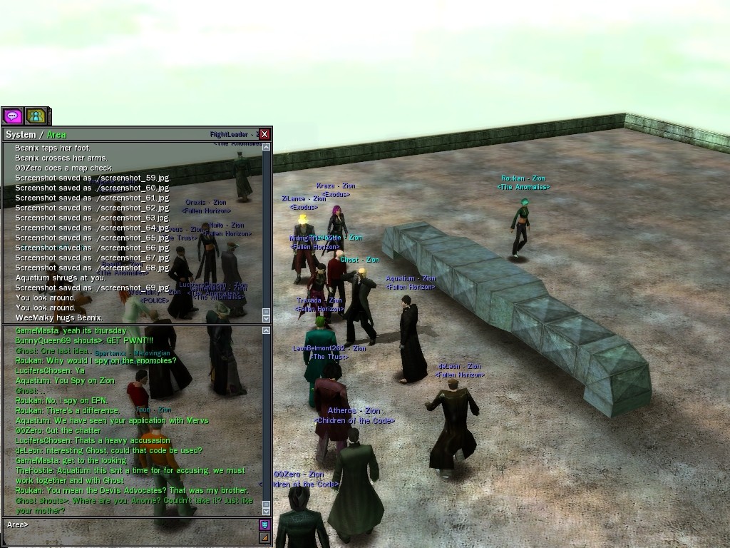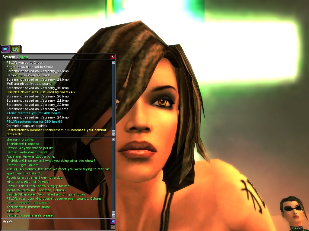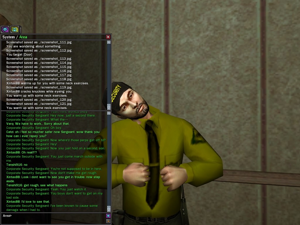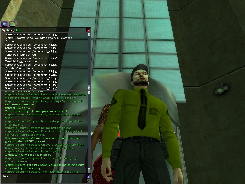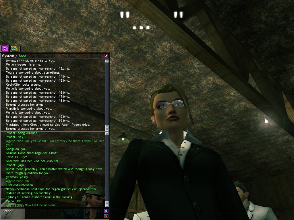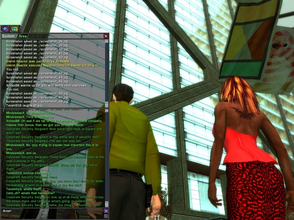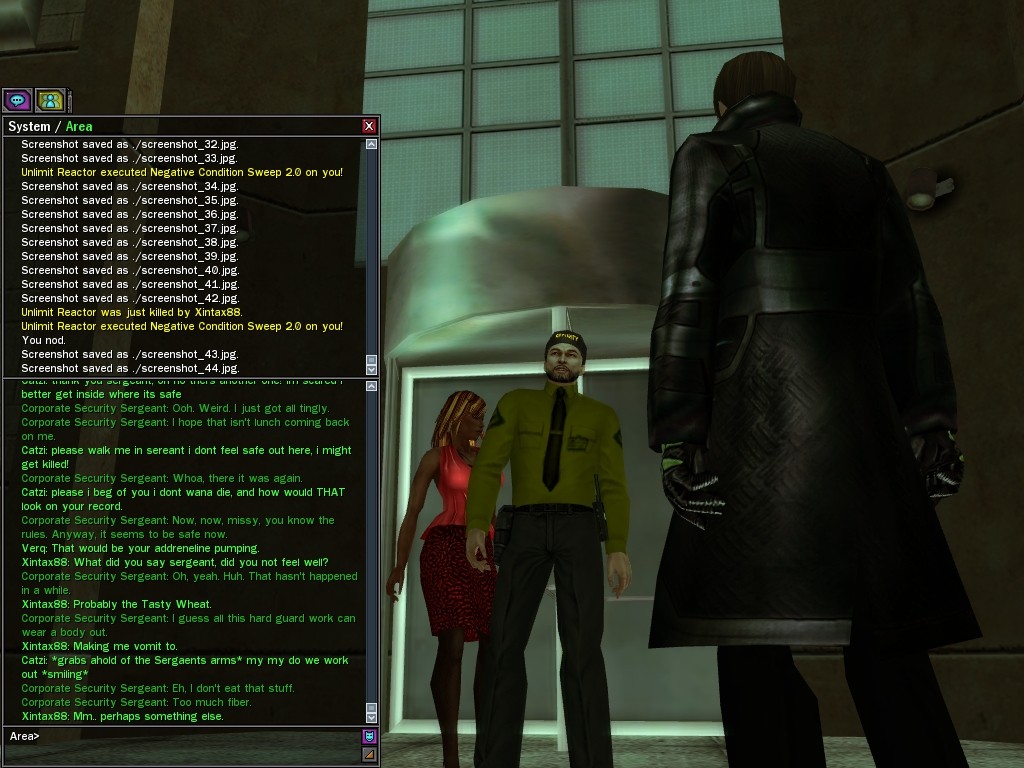 Niobe's good at a lot of things, but taking it easy isn't one of them. She's still not back at full strength, but she's insisting on making public appearances. She puts up a good front, but she can't even get out of the seat by herself after jacking out. At least this time she was meeting with Zionites. Oh, the Mervs and Machinists were outside, trying to get in, and whining up a storm about Niobe being thankless--actually, it was just the Mervs who were whining. They must not have noticed that she's already met with a large number of them separately. It's interesting to watch her. She is getting stronger. And she's gradually coming to grips with Anome's betrayal. Niobe has been very reluctant to trust anyone for years now, yet she trusted Anome, and he turned and shot her in the gut. Will this harden her further? You'll never have reason to doubt your trust in me at least, Niobe. You could have, for my failure to be there when Anome turned traitor, but it isn't in your nature to blame people for their own shortcomings. You may curse them out in public if you're really mad at them, but deep down, you blame yourself. I can tell, because I do the same. Maybe that's why we still get along.